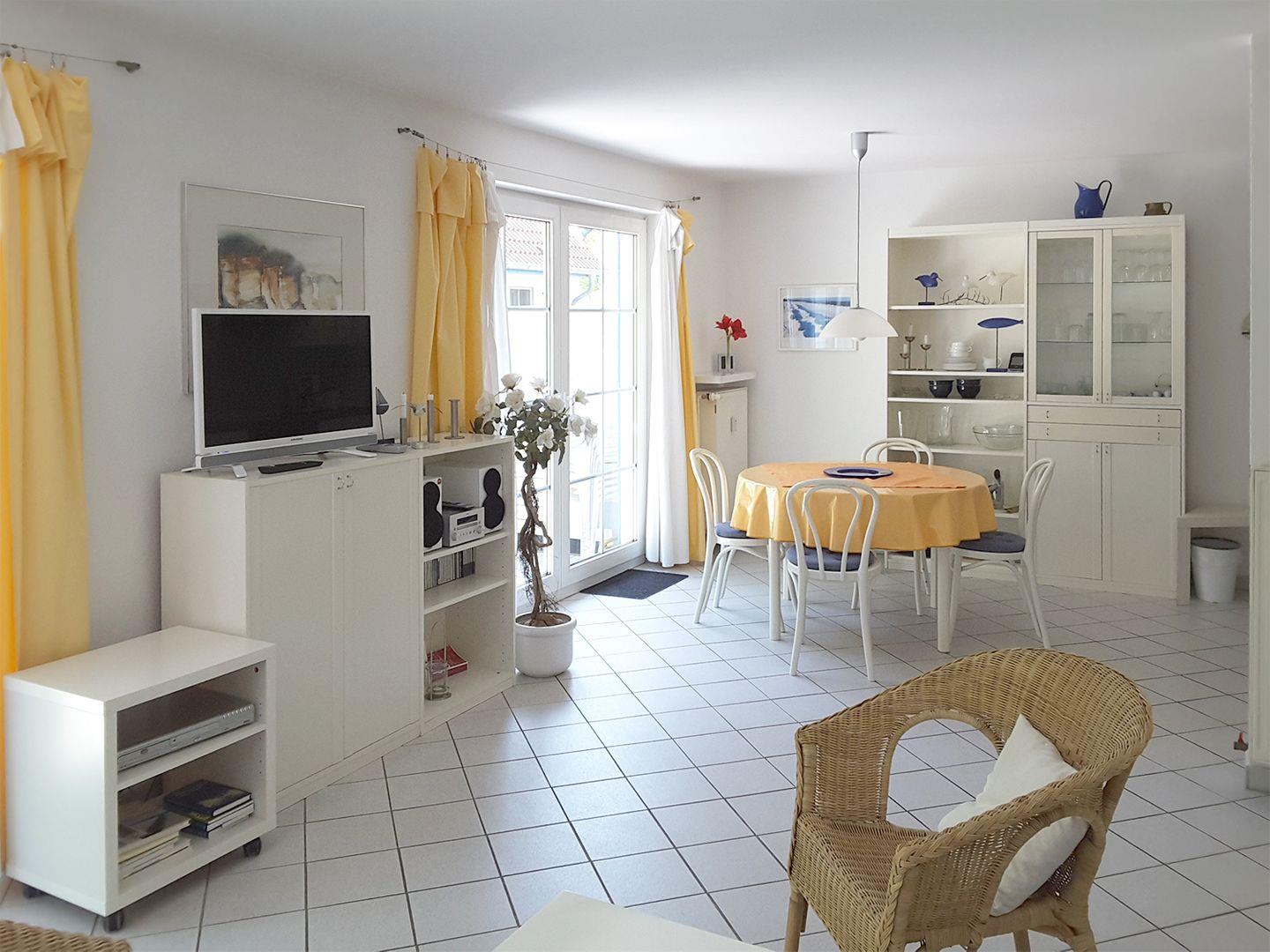 Die großzügige Ferienwohnung mit ca. 84 m² Wohnfläche bietet Platz für bis zu 4 Personen und befindet sich im Erdgeschoss eines gepflegten Hauses. Der helle Wohnbereich ist mit einer gemütlichen Sitzgarnitur, einem Esstisch und einem Radio mit CD-Player sowie SAT-TV ausgestattet. Hier können Sie nach einem erlebnisreichen Tag entspannen oder gemeinsame Mahlzeiten genießen.