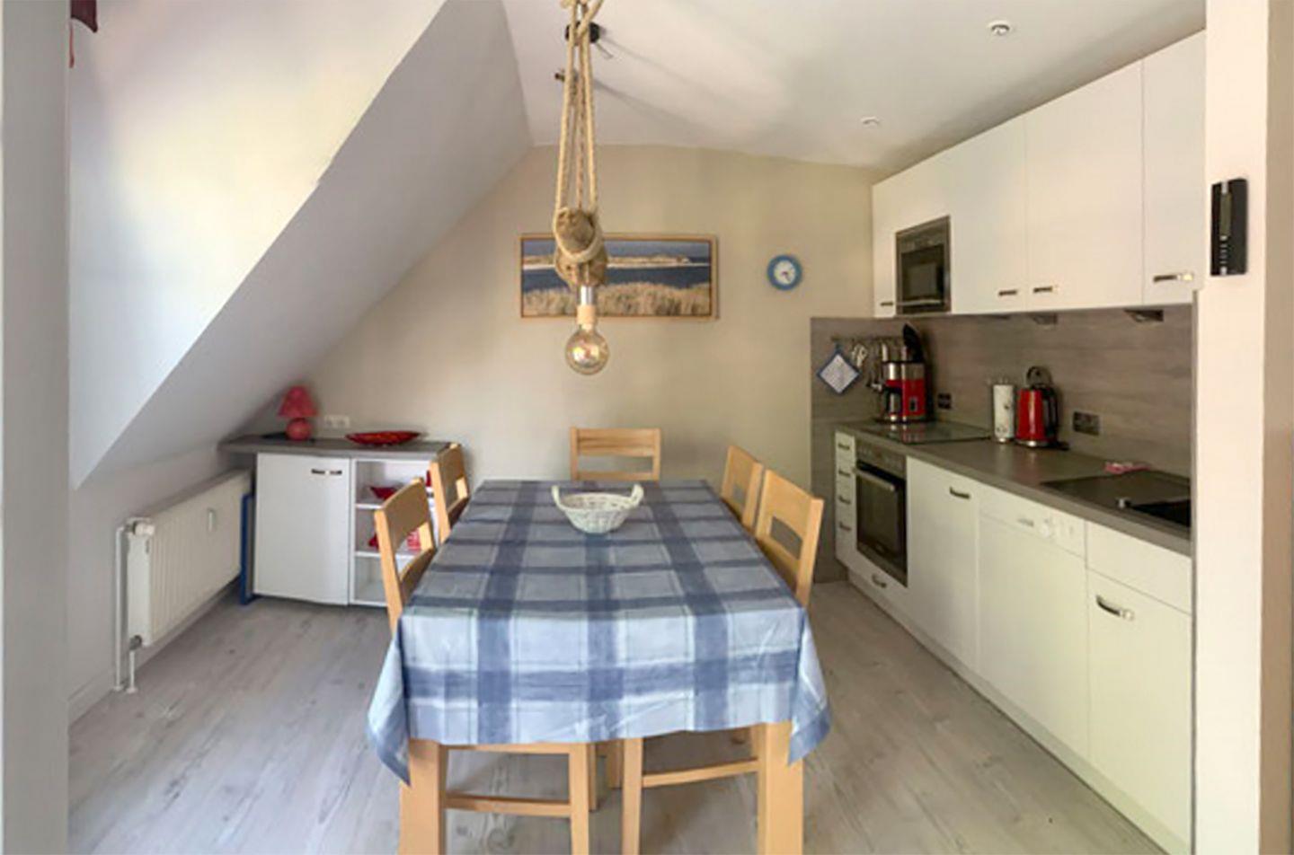Die großzügige Ferienwohnung mit ca. 90 m² Wohnfläche bietet Platz für bis zu 4 Personen und erstreckt sich über das Ober- und Dachgeschoss eines gepflegten Hauses. Im oberen Stockwerk finden Sie einen offenen Wohnbereich mit einer gut ausgestatteten Küchenzeile, einem Esstisch, einer gemütlichen Sitzgarnitur sowie einem Radio mit CD-Player und SAT-TV. Hier können Sie den Abend entspannt ausklingen lassen oder gemeinsam Mahlzeiten zubereiten.