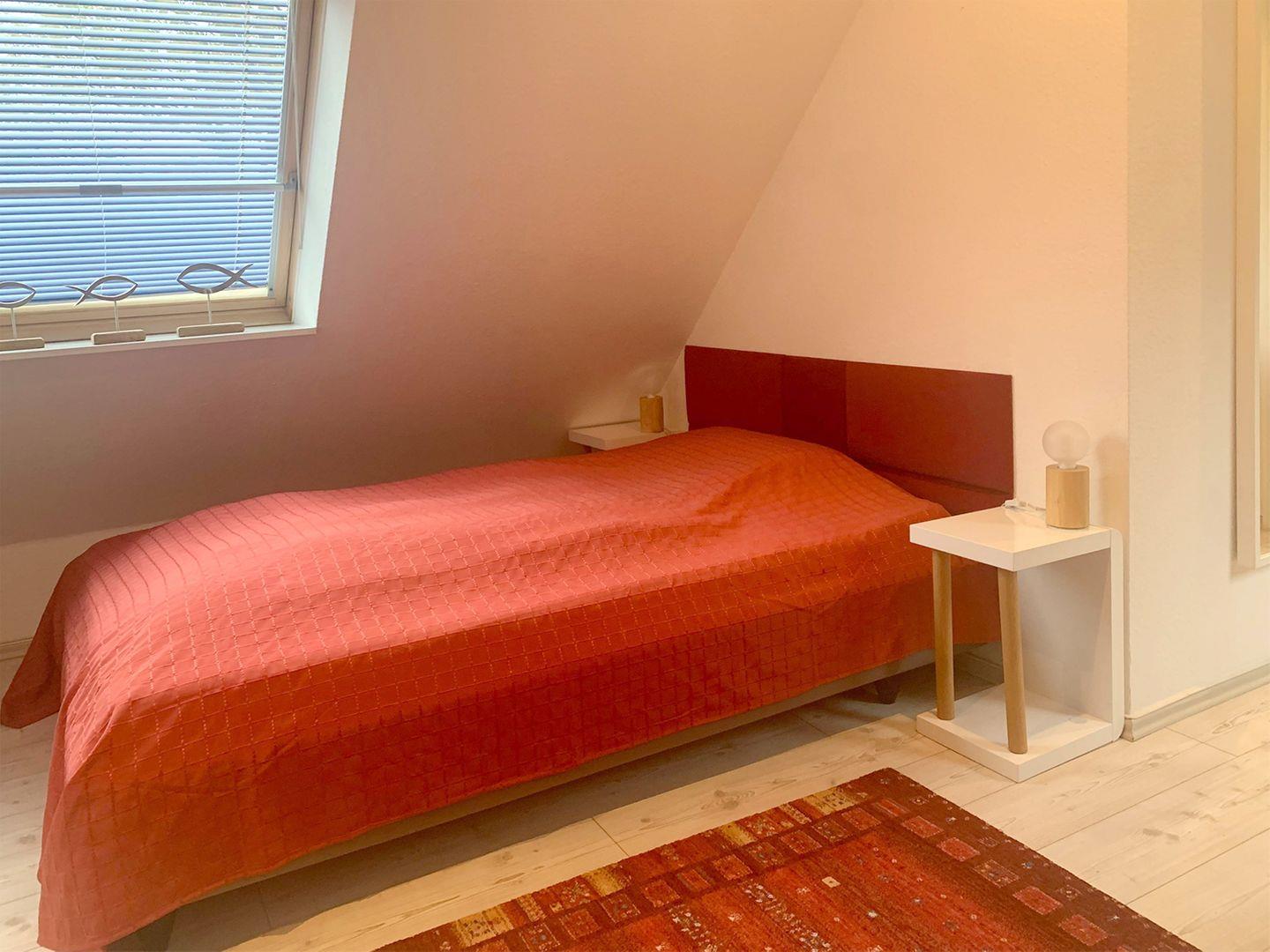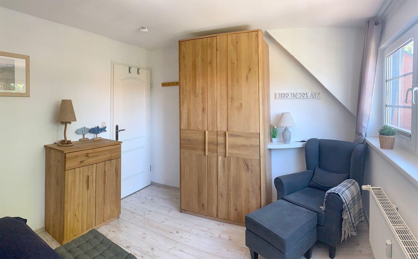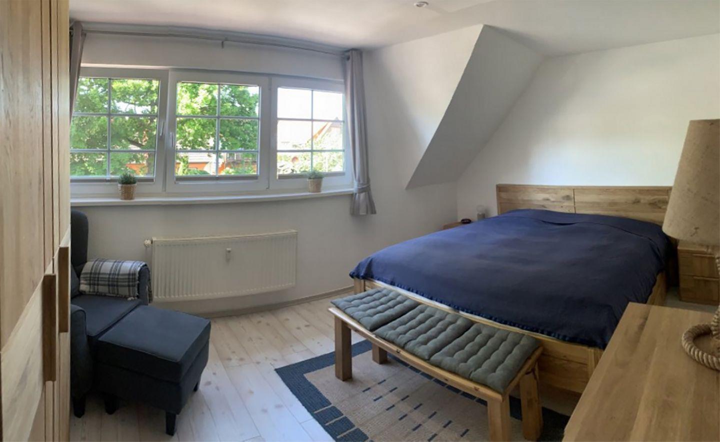 Die Wohnung bietet zwei Schlafzimmer: Das erste Schlafzimmer im OG ist mit einem Doppelbett (180 x 200 cm) und einem großzügigen Kleiderschrank eingerichtet, während das zweite Schlafzimmer im DG ein Doppelbett (140 x 190 cm, durchgehende Matratze) sowie ein Schlafsofa bereithält.