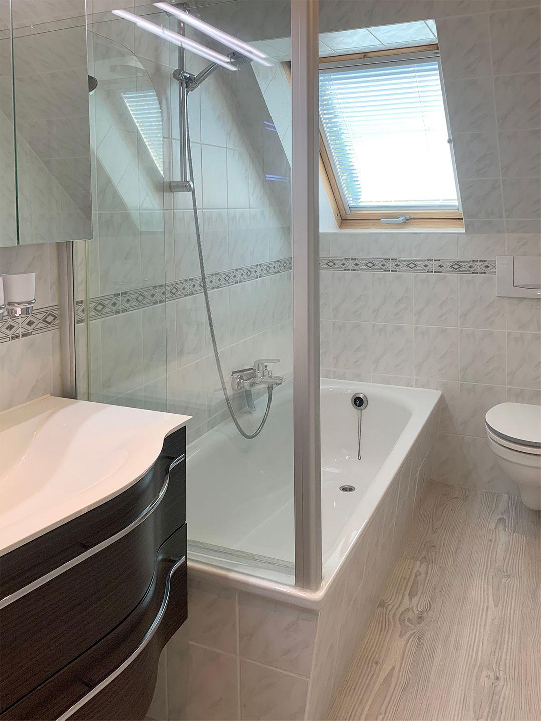 Das Bad im Obergeschoss verfügt über eine Badewanne, ein WC und einen Kosmetikspiegel.