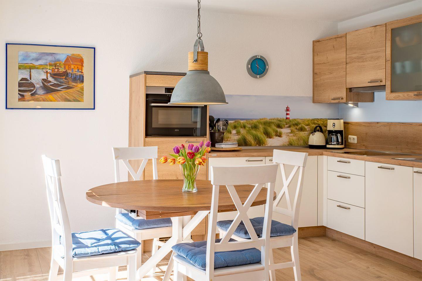 Die großzügige Ferienwohnung für bis zu 4 Personen bietet auf ca. 84 m² Wohnfläche einen komfortablen und modernen Rückzugsort. Sie wurde 2023 vollständig modernisiert und befindet sich im Erdgeschoss eines gepflegten Hauses. Der einladende Wohnbereich ist mit einer bequemen Sitzgarnitur, einem Esstisch, einem Radio und SAT-TV ausgestattet, sodass Sie hier nach einem ereignisreichen Tag entspannen können. Die angrenzende, offene Küchenzeile lässt keine Wünsche offen und ist mit einem Backofen, Geschirrspüler, Herd, Kaffeemaschine, Kühlschrank mit Gefrierfach, Mikrowelle, Toaster und Wasserkocher ausgestattet. Ein modernes Bad mit Dusche, WC und Waschmaschine sorgt für zusätzlichen Komfort. Zudem gibt es ein separates Gäste-WC für mehr Privatsphäre.