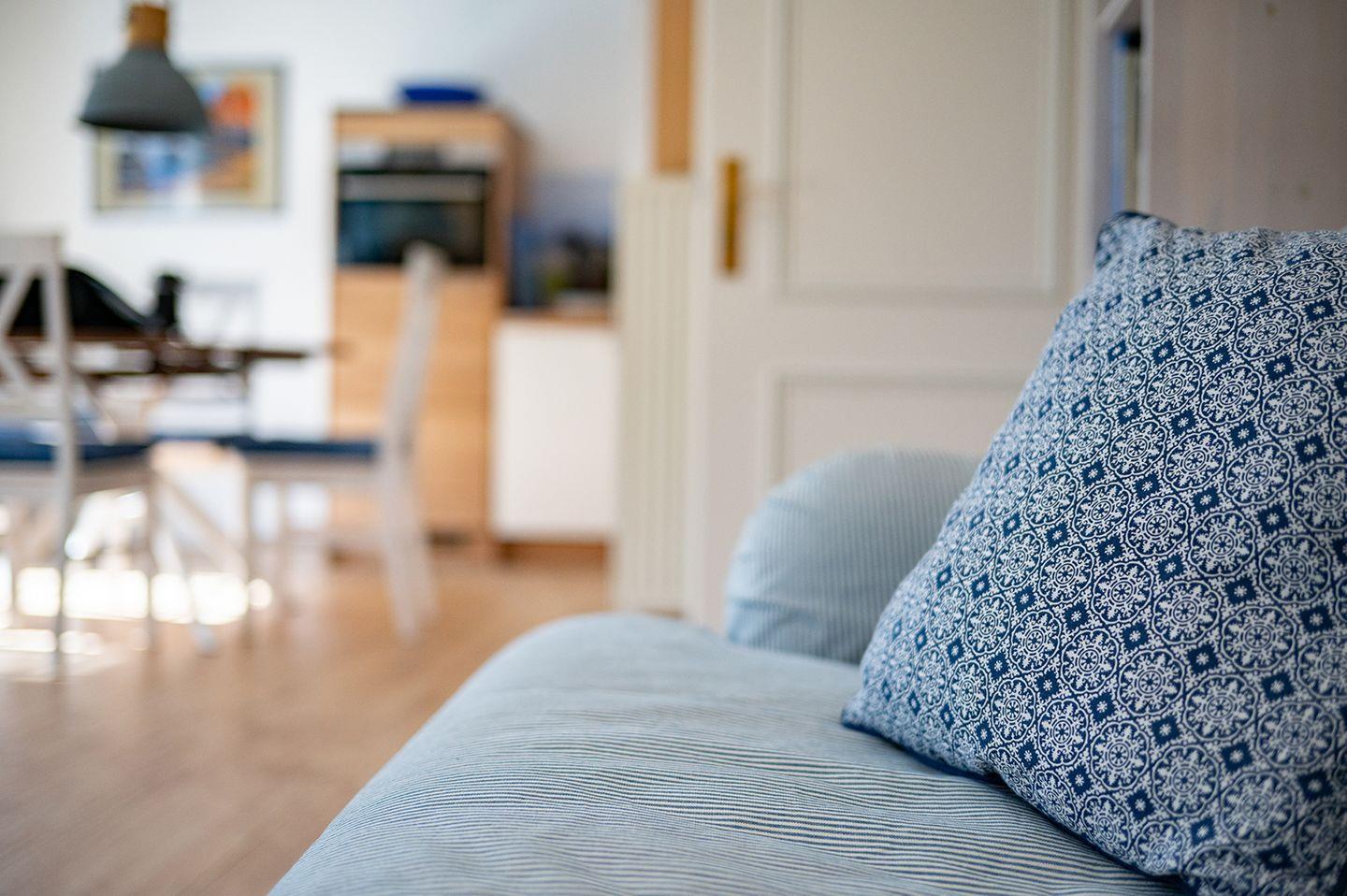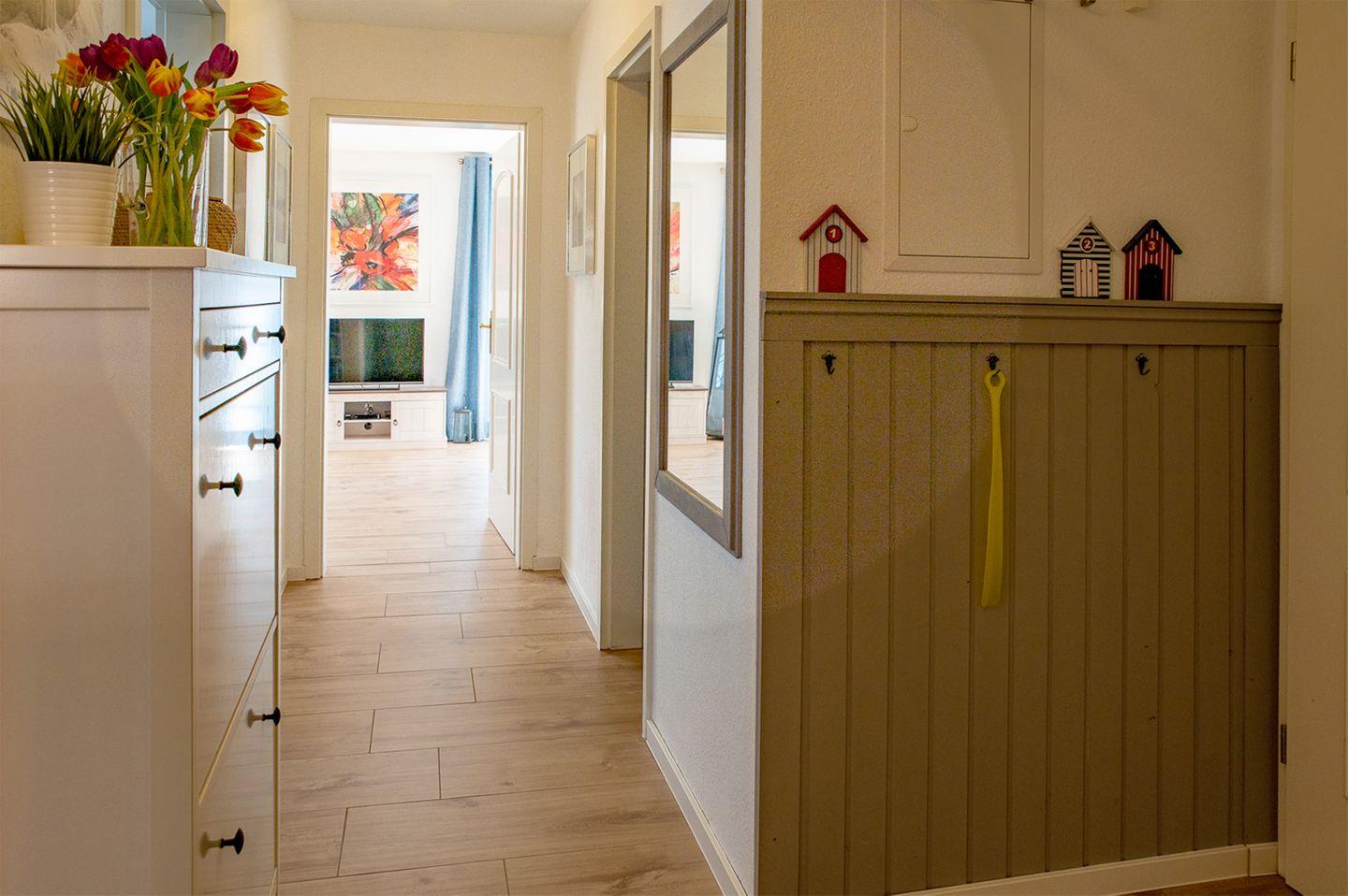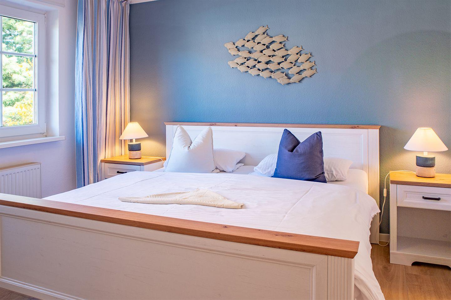 Die Ferienwohnung bietet zwei geschmackvoll eingerichtete Schlafzimmer, jeweils mit einem Doppelbett (180 x 200 cm). Hier finden Sie Platz für erholsame Nächte. Für Familien mit kleinen Kindern ist ein Kinderhochstuhl vorhanden und es steht auch eine Waschmaschine zur Verfügung.
