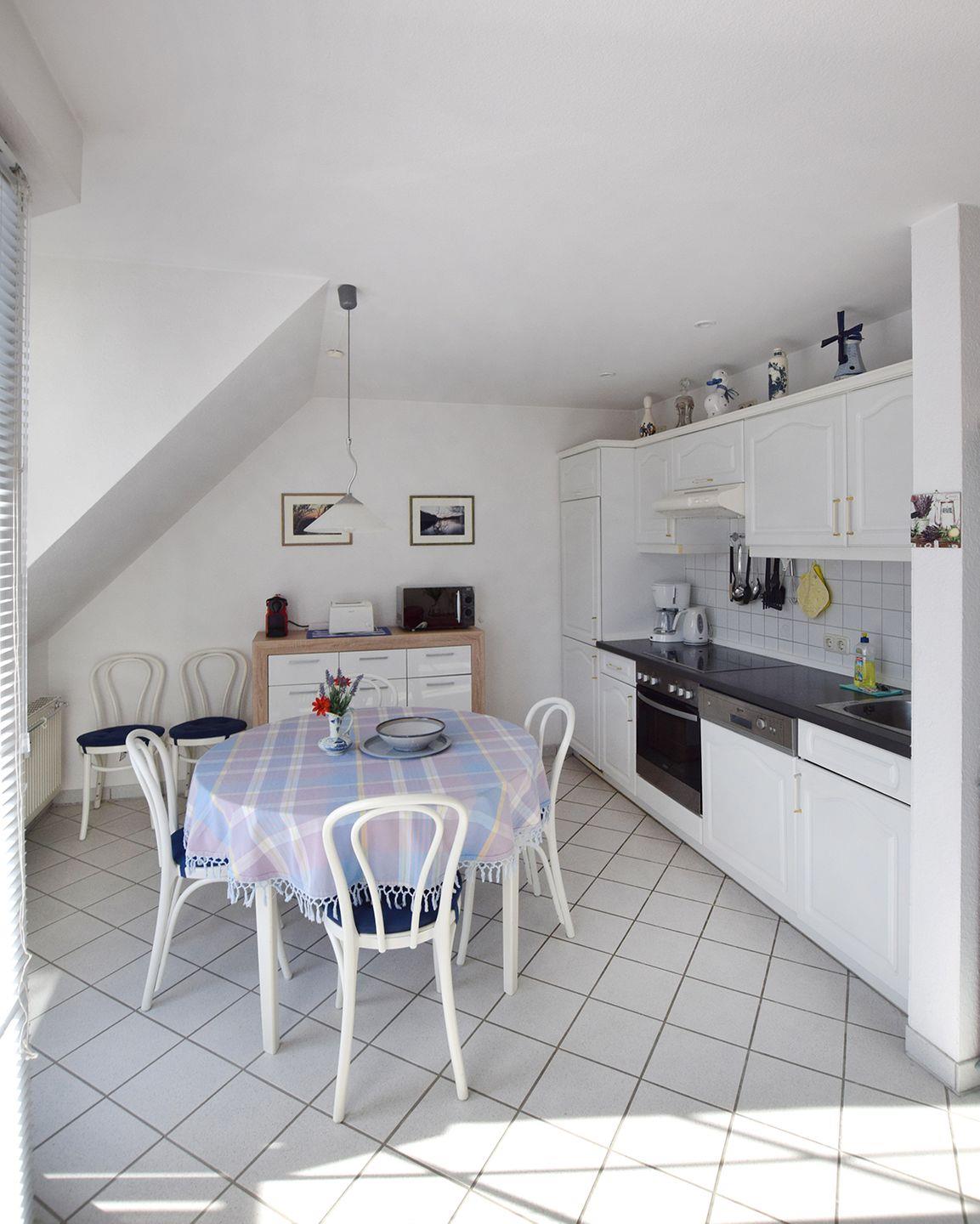 Der großzügige Wohnbereich ist mit einem gemütlichen Ecksofa und zwei Sesseln, einem Esstisch sowie einem Radio mit CD-Player und SAT-TV ausgestattet – perfekt für entspannte Abende. Die Küchenzeile ist komplett ausgestattet mit einem Backofen, Geschirrspüler, Ceran-Herd, Espressomaschine, Kaffeemaschine, Kühlschrank mit Gefrierfach, Mikrowelle, Toaster und Wasserkocher, sodass Sie sich jederzeit selbst verpflegen können. Das Badezimmer im Obergeschoss bietet eine Badewanne und ein WC.