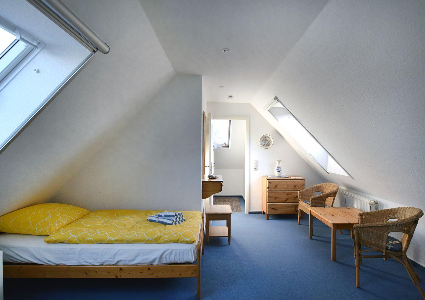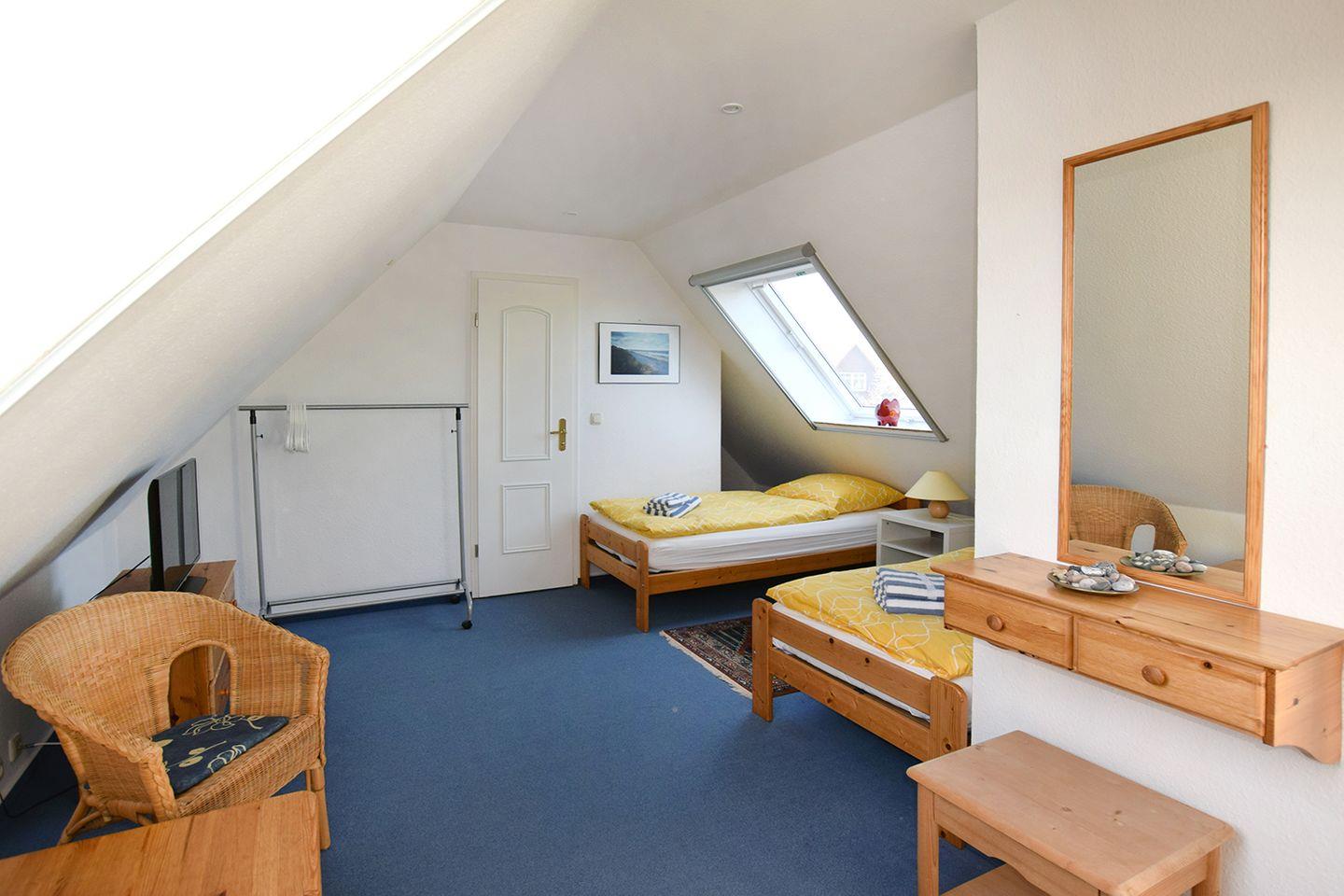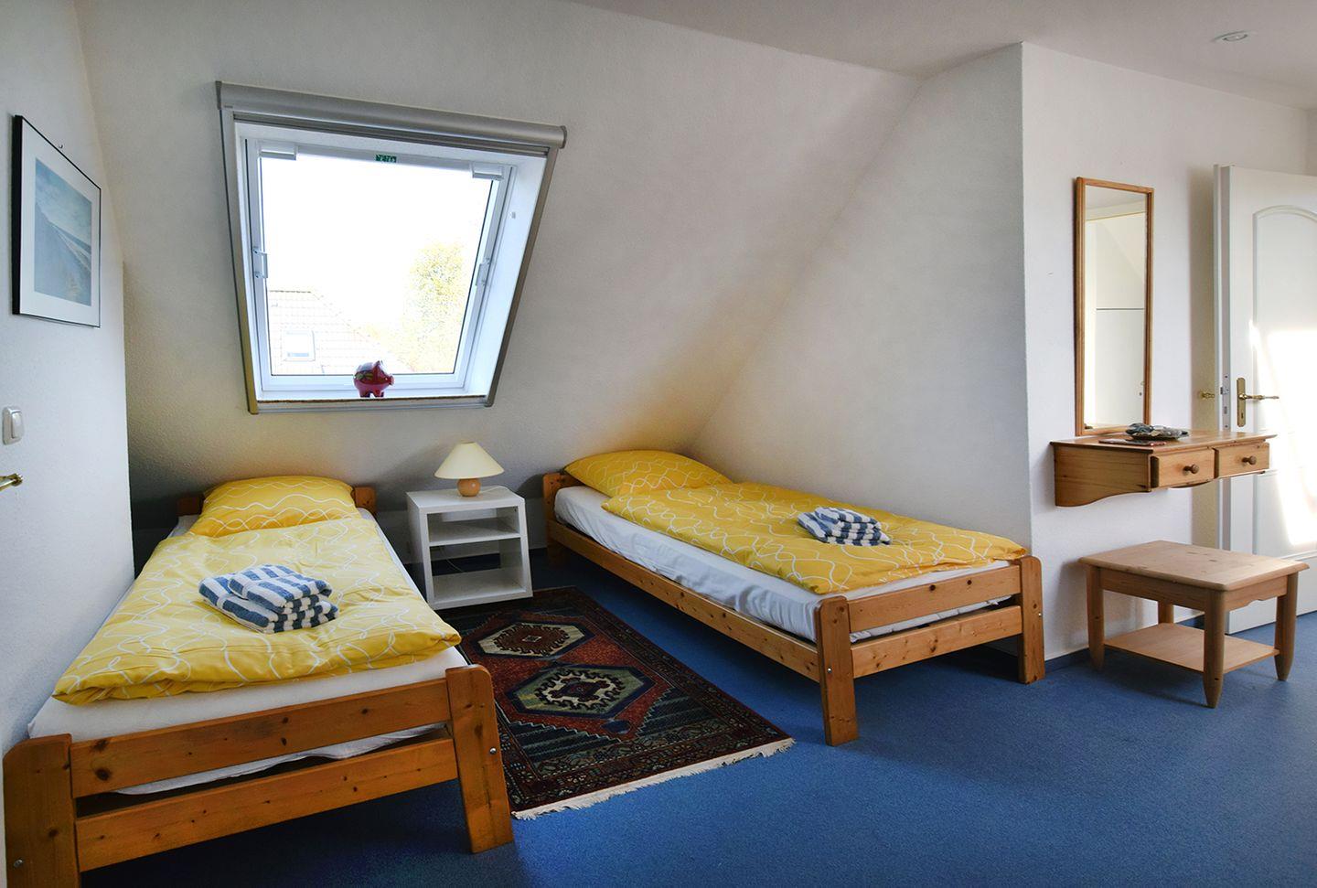 Im Dachgeschoss finden Sie ein weiteres Schlafzimmer mit zwei Einzelbetten (90 x 200 cm), ideal für Kinder oder Freunde. Zusätzlich befindet sich hier ein weiteres Badezimmer mit Dusche, WC und einer Waschmaschine.