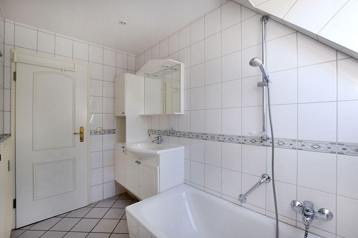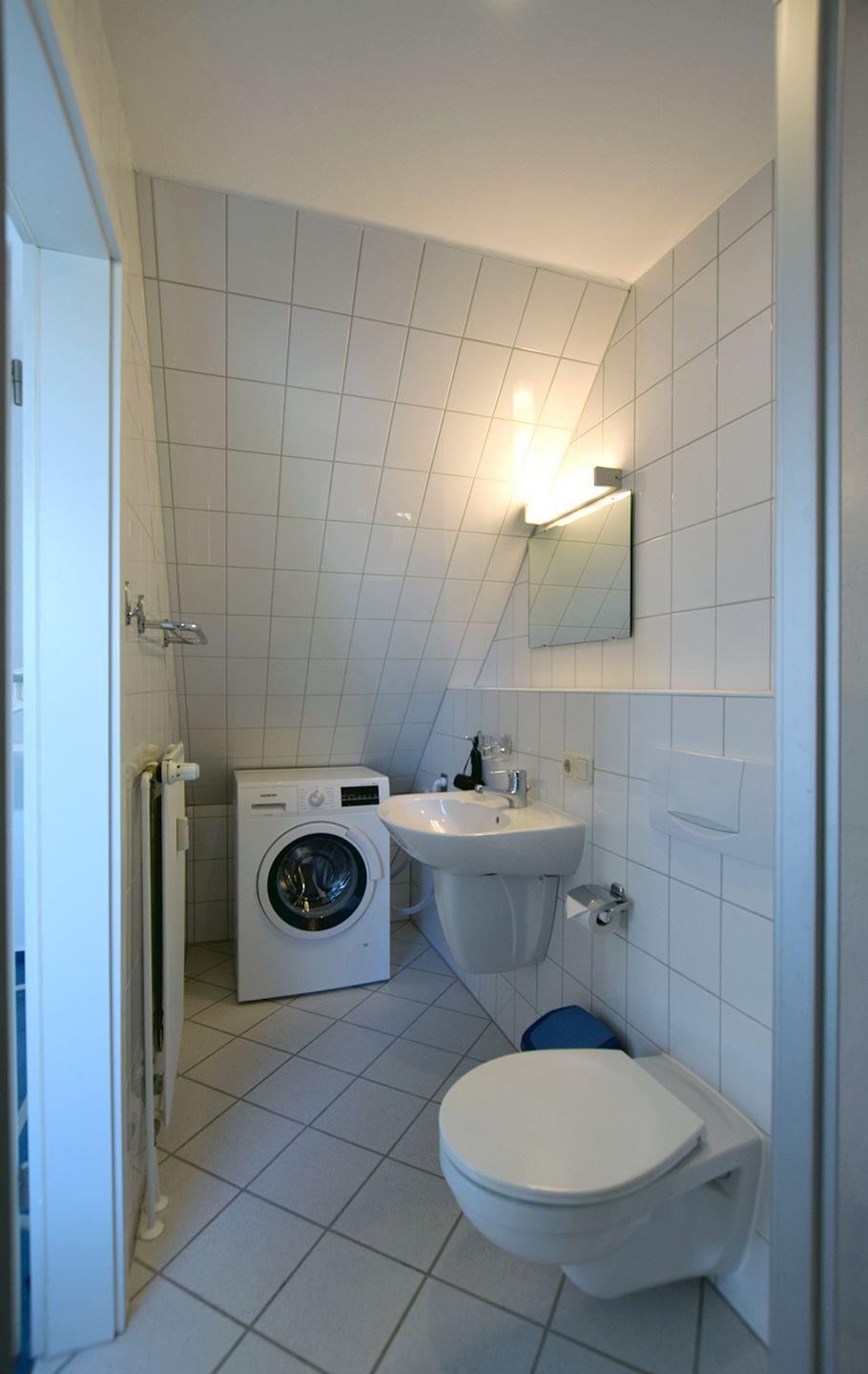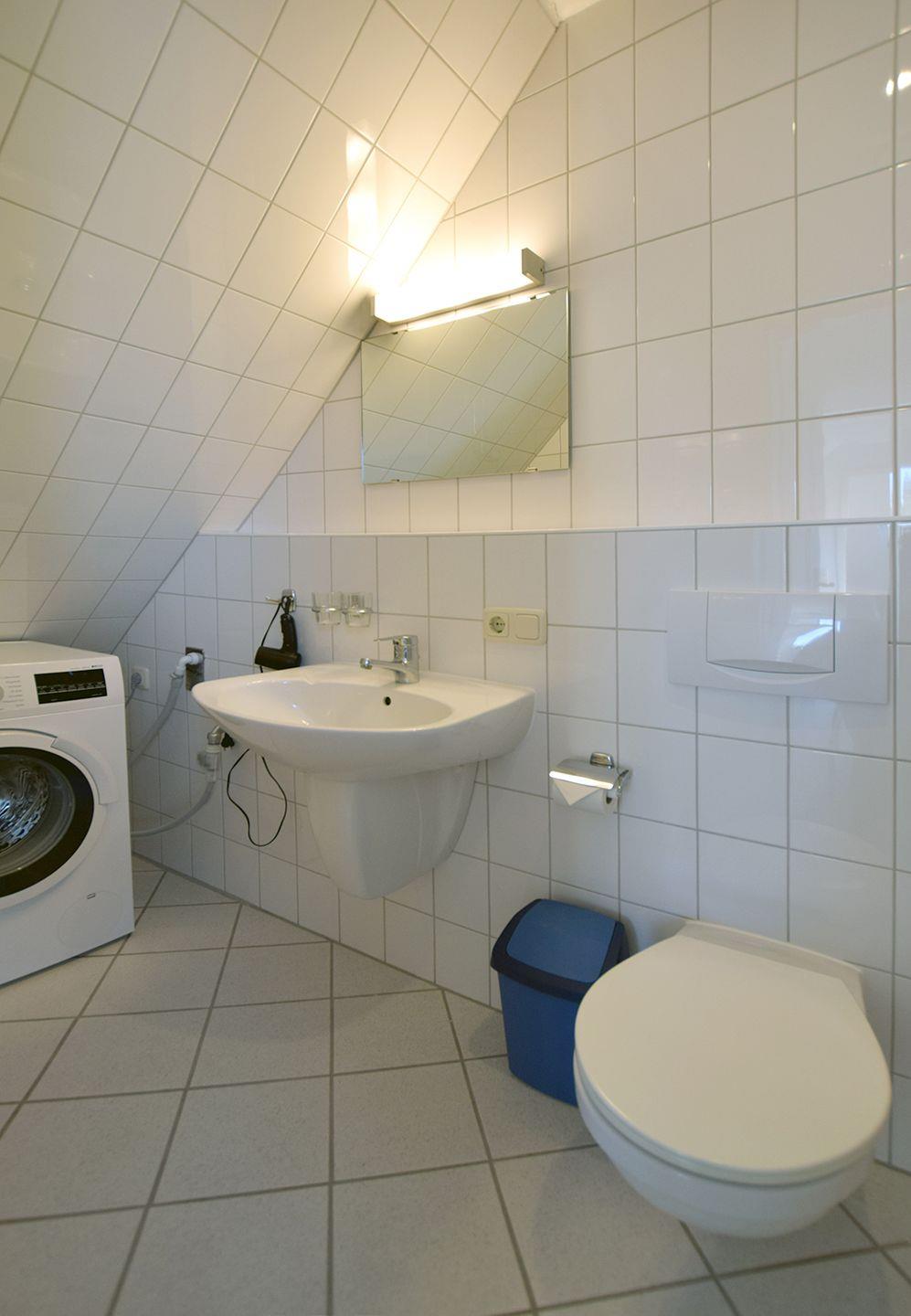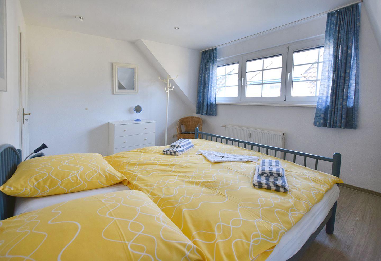 Im Dachgeschoss finden Sie ein weiteres Schlafzimmer mit zwei Einzelbetten (90 x 200 cm), ideal für Kinder oder Freunde. Zusätzlich befindet sich hier ein weiteres Badezimmer mit Dusche, WC und einer Waschmaschine.