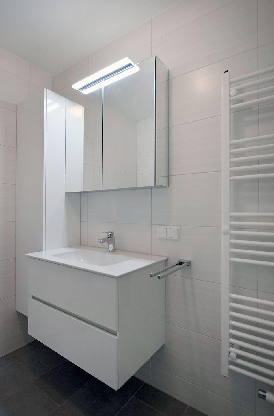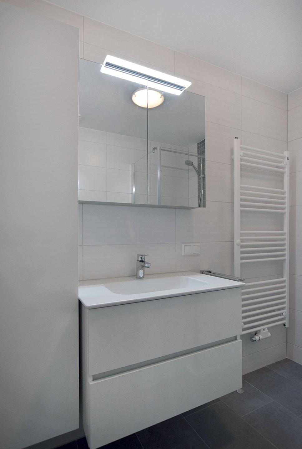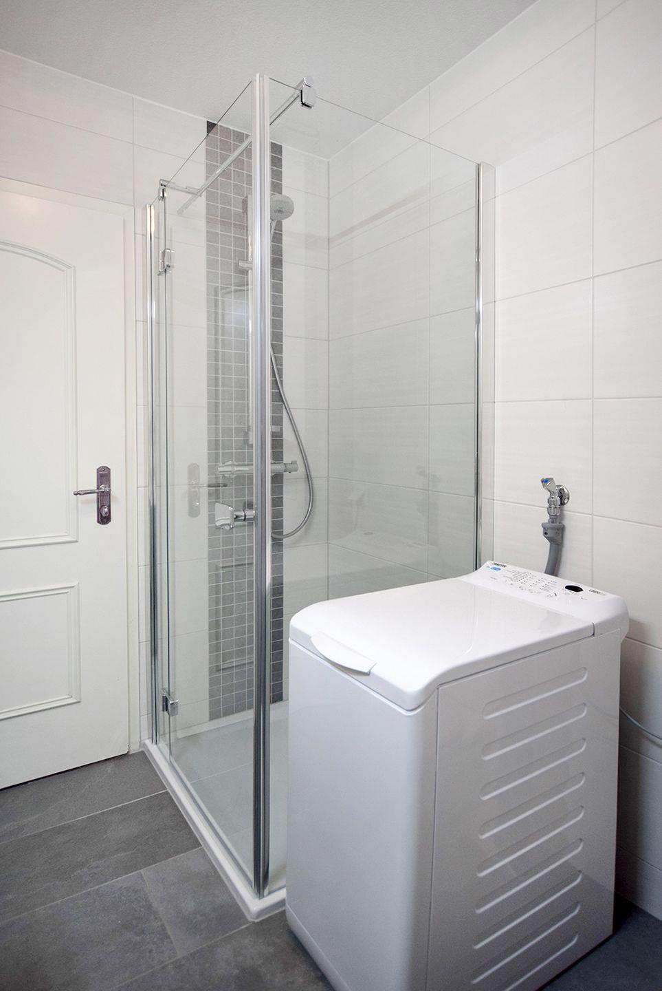 Das Duschbad verfügt über eine moderne Einrichtung mit WC und Waschmaschine, was besonders praktisch für längere Aufenthalte ist.