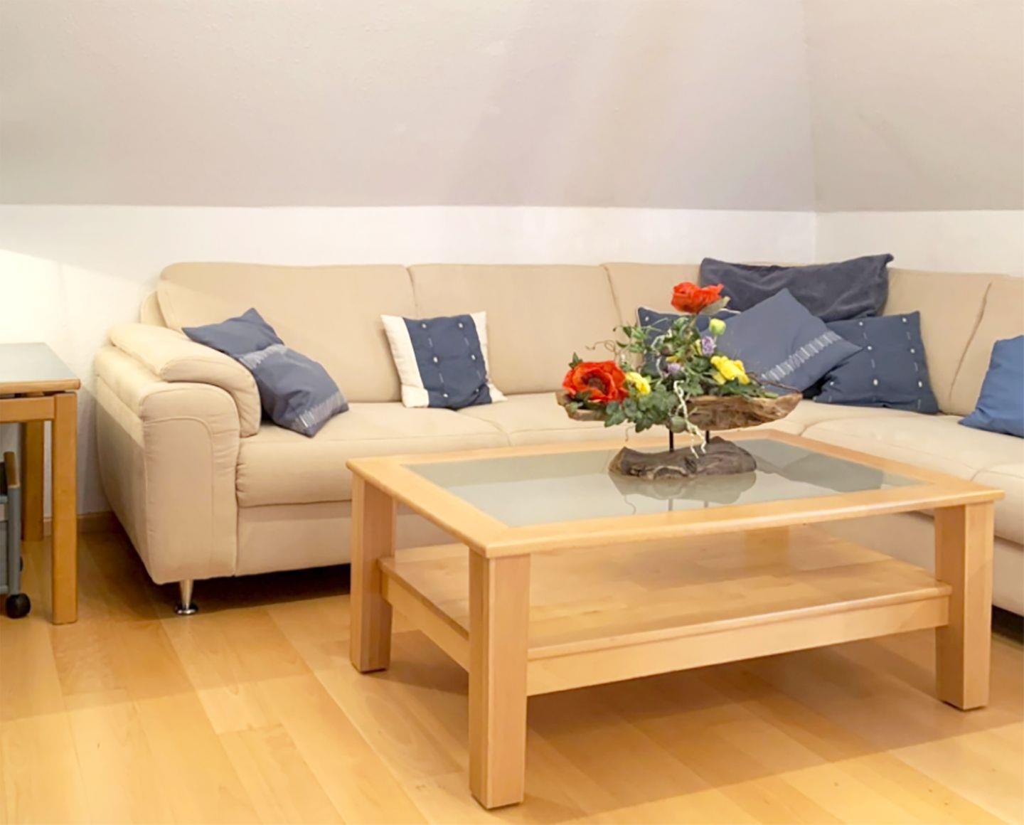 Ferienwohnung bis 4 Personen | ca. 57 qm Wohnfläche | OG Wohnbereich mit Einbauküche, Bad, 2 Schlafzimmer | 1 Parkplatz | Wohnbereich Esstisch, Sitzgarnitur, Radio mit CD-Player, TV SAT | Einbauküche Backofen, Geschirrspüler, Herd, Kaffeemaschine, Kühlschrank mit Gefrierfach, Mikrowelle, Toaster, Wasserkocher, Waschmaschine | Bad Dusche, WC | 2 Schlafzimmer 1 Doppelbett (160 x 200 cm), 2 Einzelbetten (90 x 200 cm) | DG Galerie mit Sofa und Schaukelstuhl | WLAN, Waschmaschine, Haustiere erlaubt