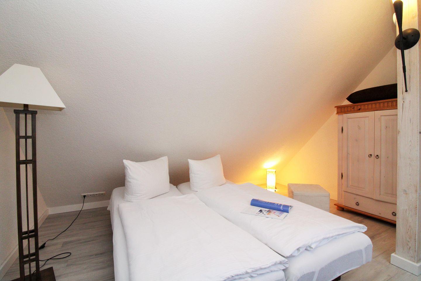 Das gemütliche 1. Schlafzimmer (in der unteren Etage) ist mit 2 bequemen zusammenstehenden Einzelbetten, 2 Nachttischen, einem geräumigen Kleiderschrank sowie 2 Stühlen eingerichtet.
