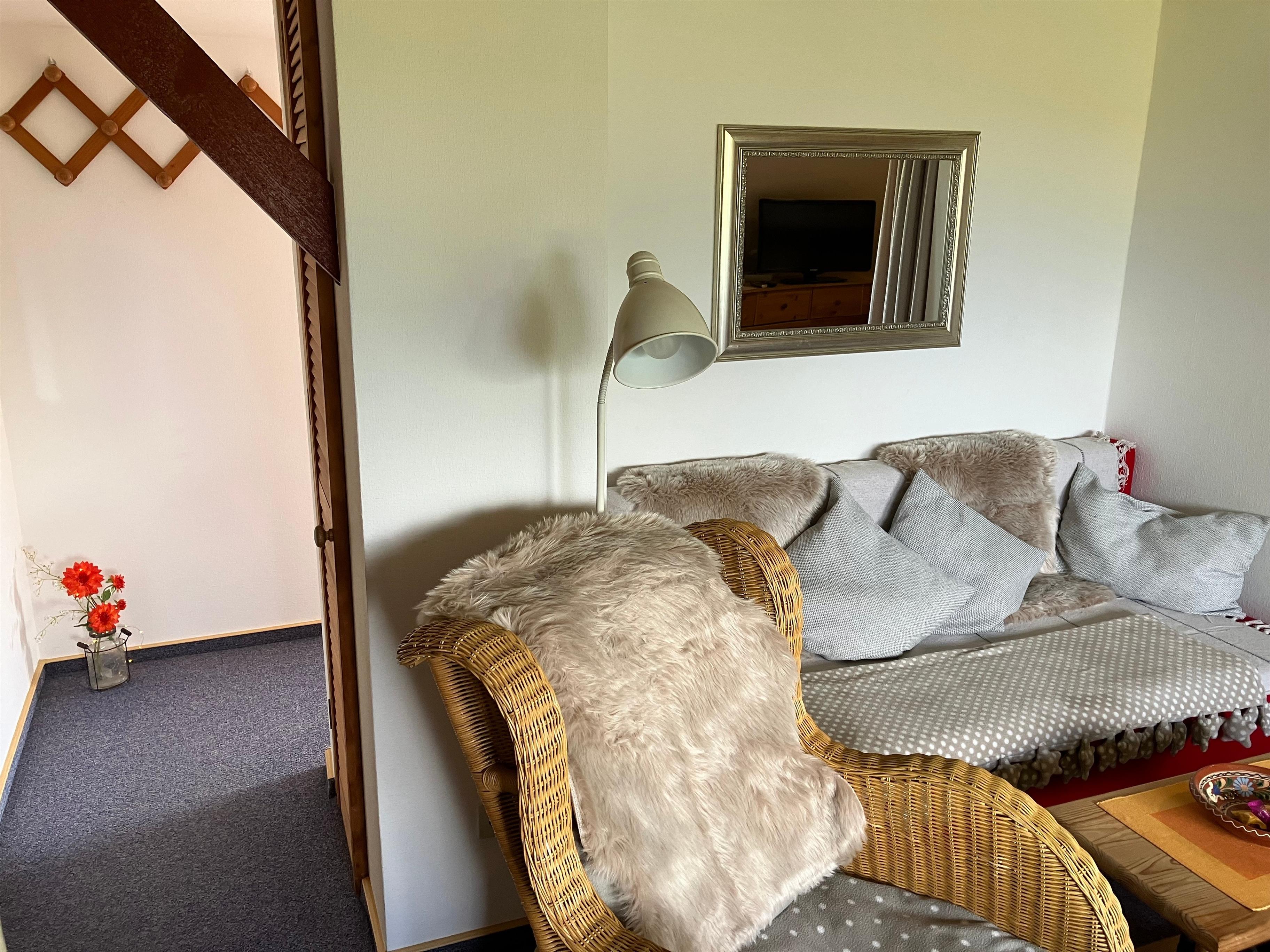 Familienfreundliche Ferienwohnung für 4 Personen im Obergeschoss mit Blick auf Ostsee, Wiesen und Felder. Die Wohnung verfügt über einen kombinierten Wohn- und Schlafraum mit Küchenzeile. Durch einen Vorhang abgetrennt befindet sich im Wohnraum ein gemütliches Doppelbett. Zudem hat die Wohnung ein weiteres Schlafzimmer mit Doppelbett für 2 Personen. Der Küchenbereich ist voll ausgestattet und lädt mit seinem großen Tisch zum Verweilen ein. Ein Badezimmer mit Dusche rundet das Angebot ab.