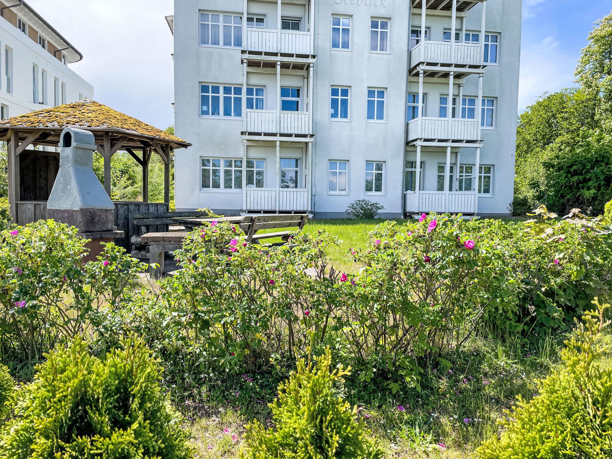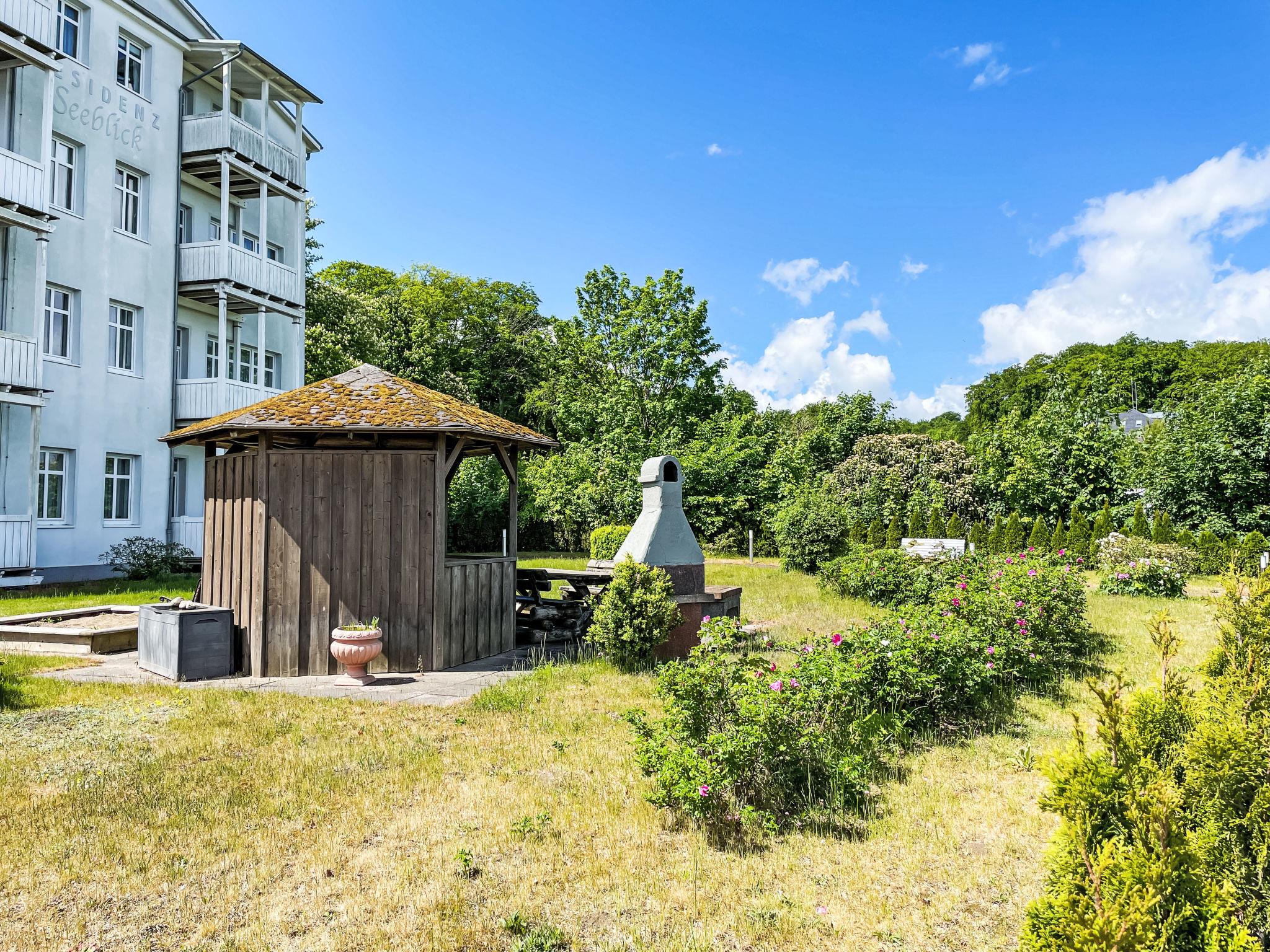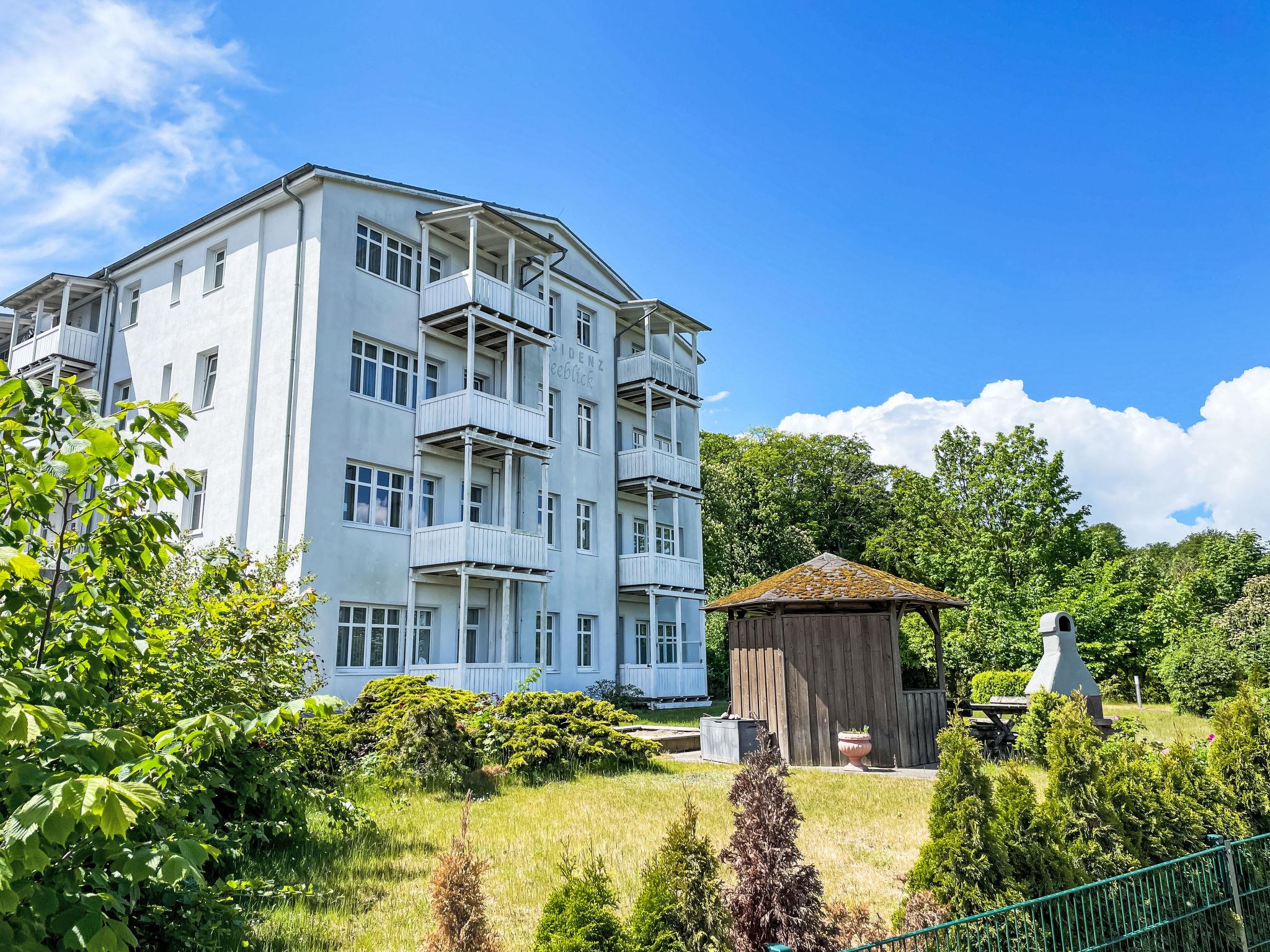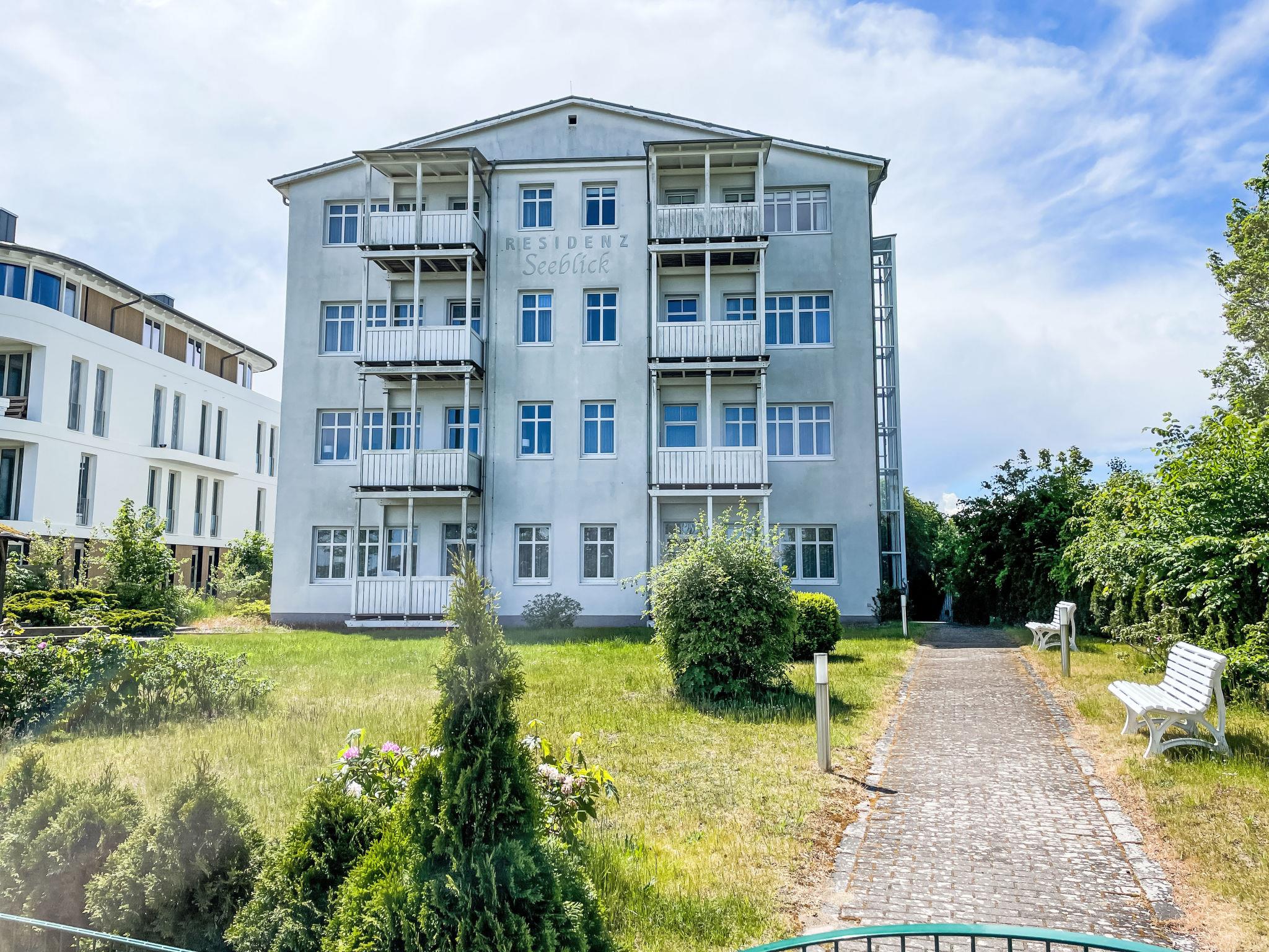 Apartment block, surrounded by trees. 28 apartments in the residence. In the resort 50 m from the centre of Sellin, 6 km from the centre of Göhren, 8 km from the centre of Binz, in an elevated position on a slope, 50 m from the edge of the forest, 30 m from the sea, 150 m from the beach. For shared use: property 2'000 m2, garden 800 m2 with lawn. Barbecue house. In the house: sauna (extra). Relaxation room, lift, storage room for bicycles, central heating system. E-charging station. Shop 300 m, supermarket 1.3 km, shopping centre 2.3 km, restaurant, bakery, café 300 m, bicycle rental 900 m, bus stop "Flix Bus Sellin" 1.1 km, railway station "Sellin (Ost)" 1.7 km, sandy beach "Seebrücke" 150 m, indoor swimming pool 1.3 km. Sports harbour 2 km, golf course (18 hole) 30 km, minigolf 1.4 km, walking paths from the house 10 m. Nearby attractions: Königsstuhl 38 km, Kap Arkona 58 km, Seebrücke Sellin 100 m.
