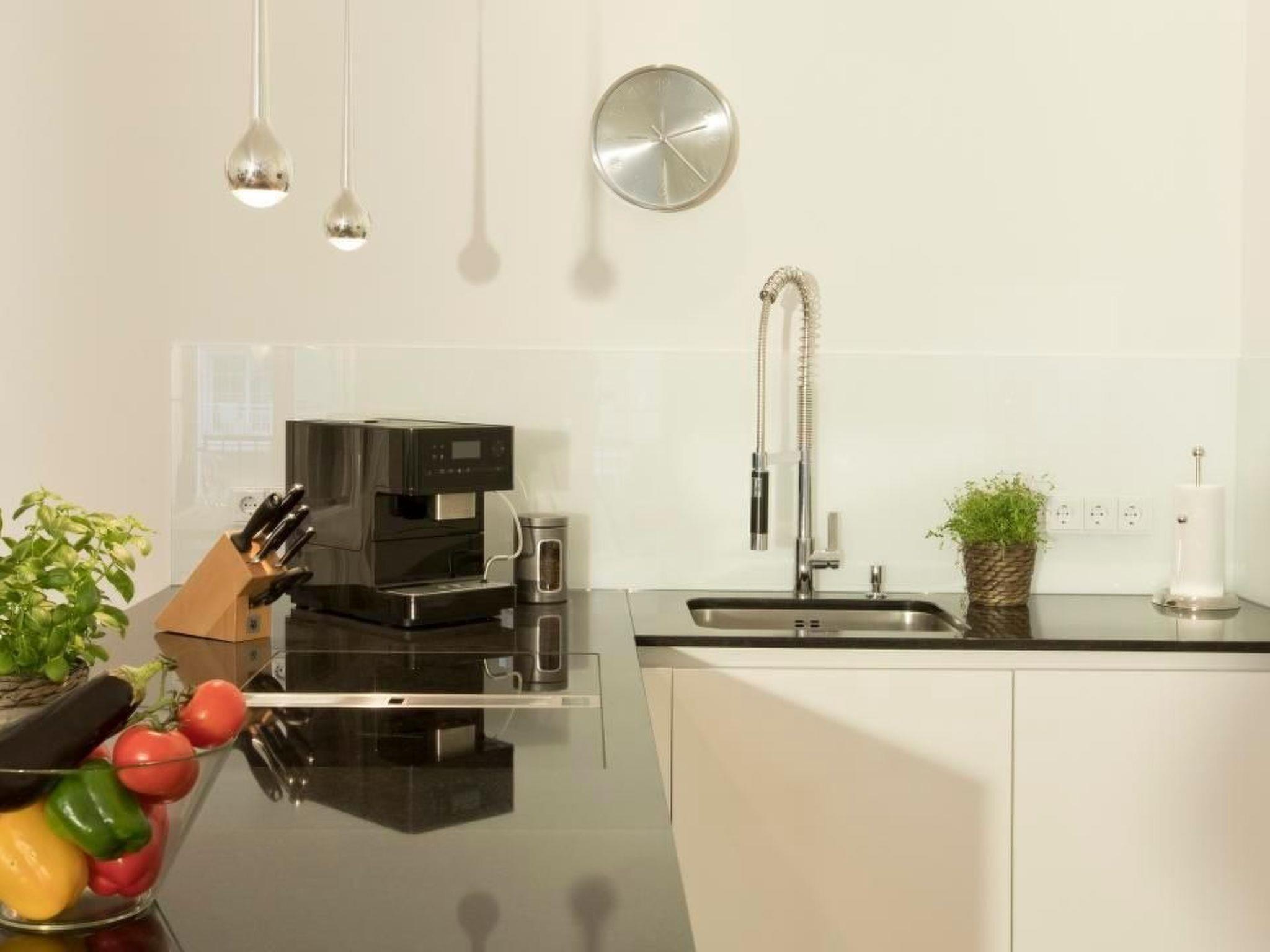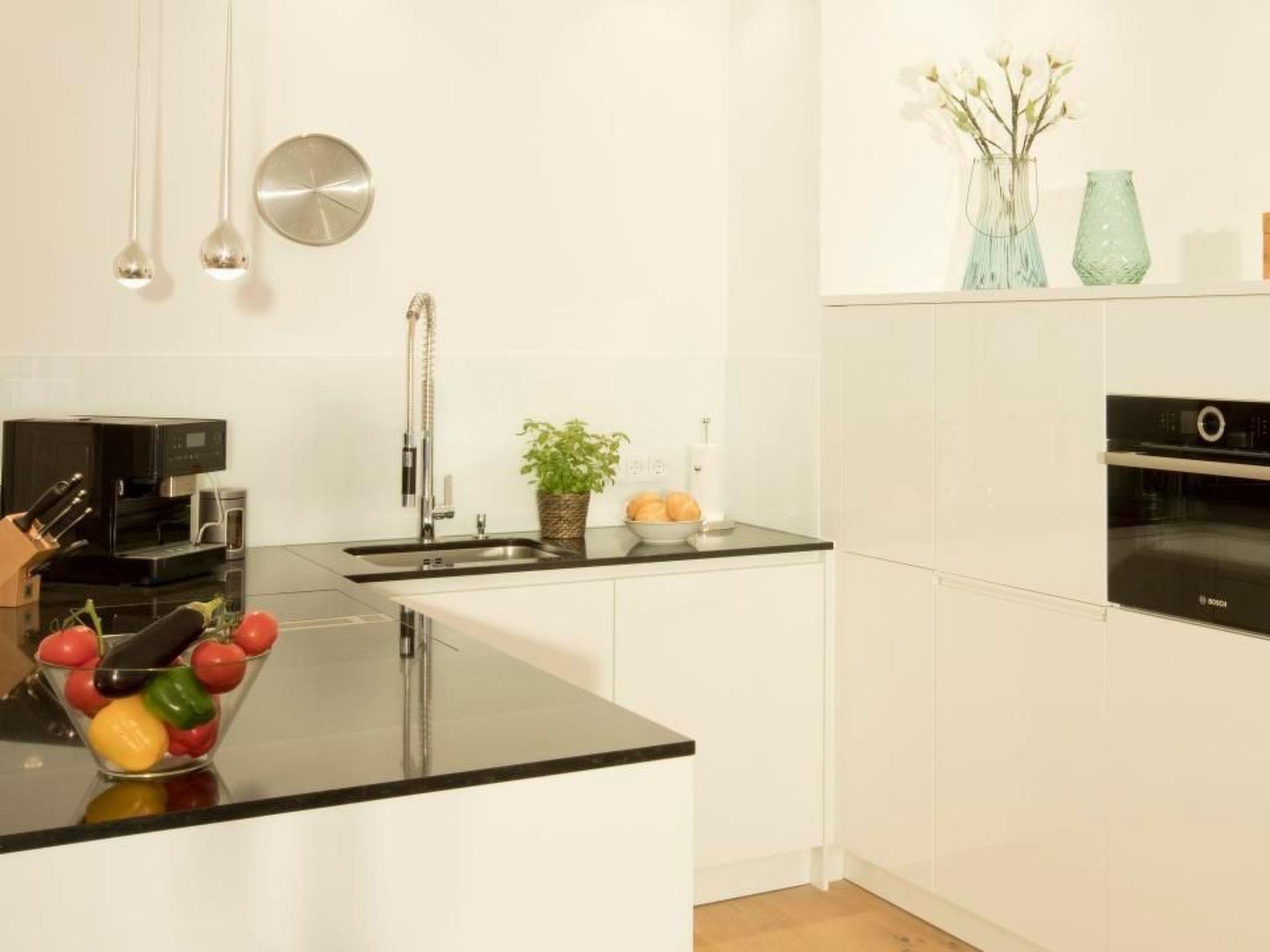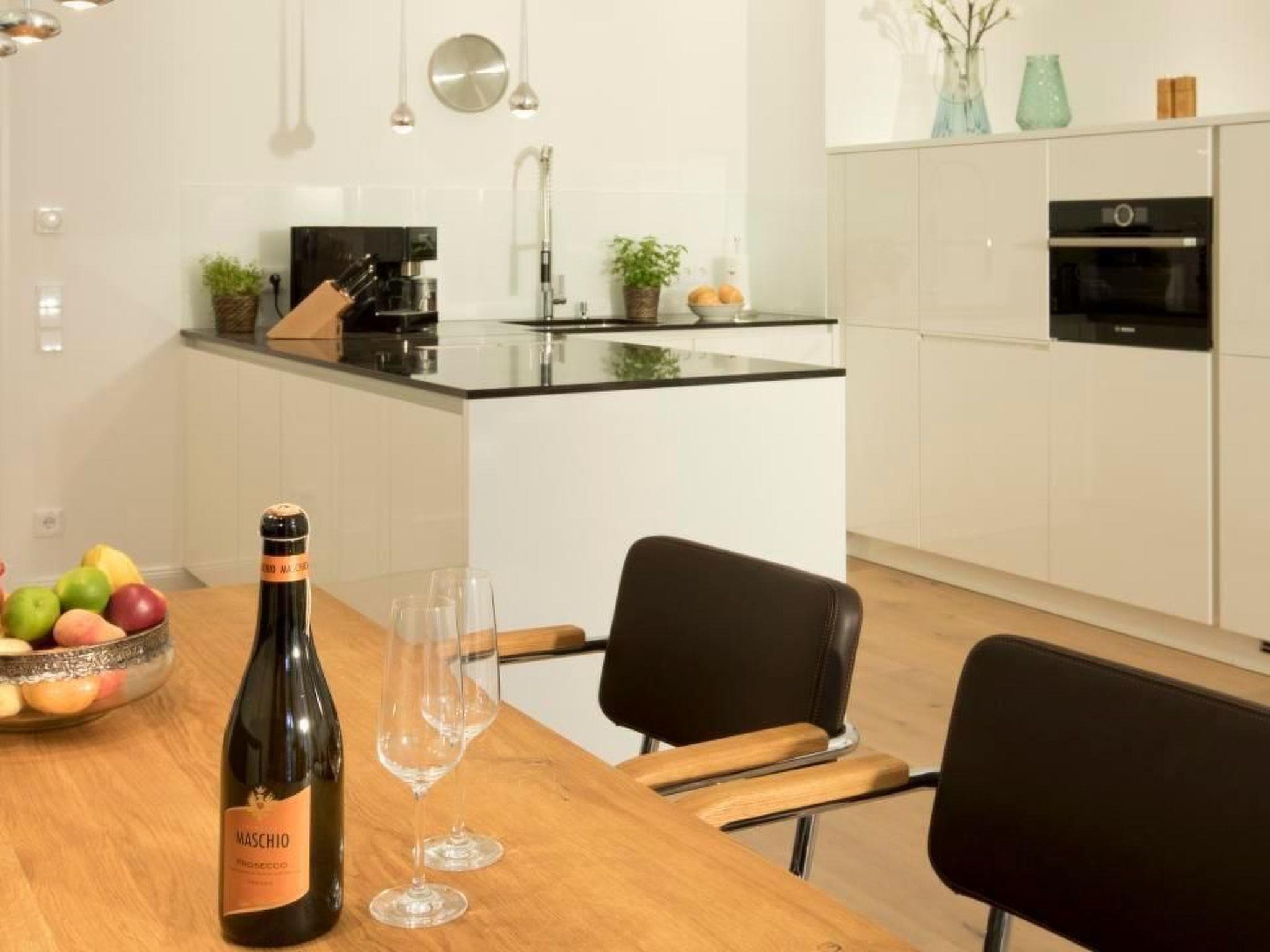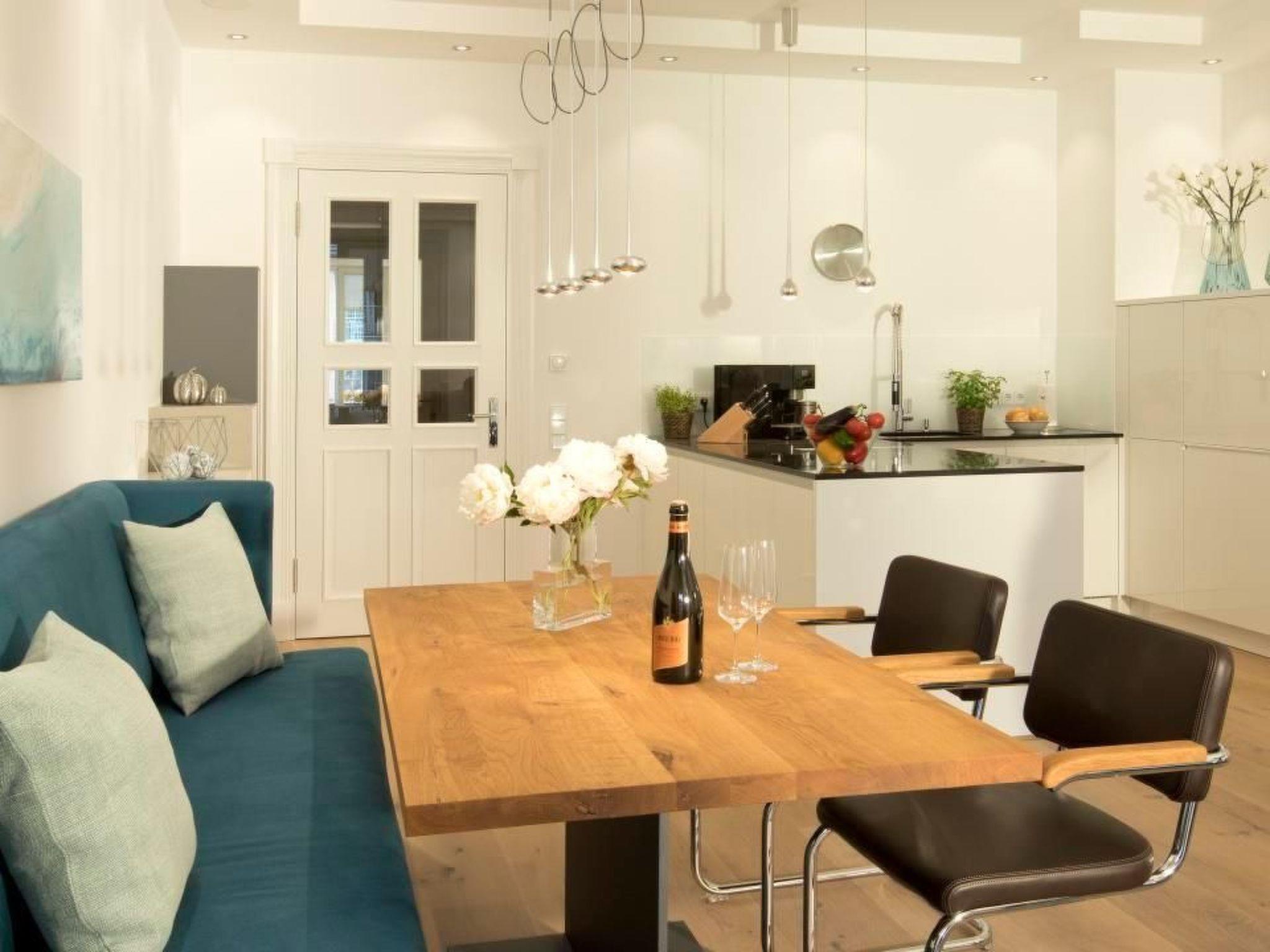 The kitchen with a view into the living room is fully equipped and invites you to cook on holiday on Rügen. Starting with the large fridge, freezer, a 4-plate induction hob, the Miele coffee machine and much more that the kitchen heart desires. The dining table with two chairs and a bench is ideal for dinner or a nice game night with the family.