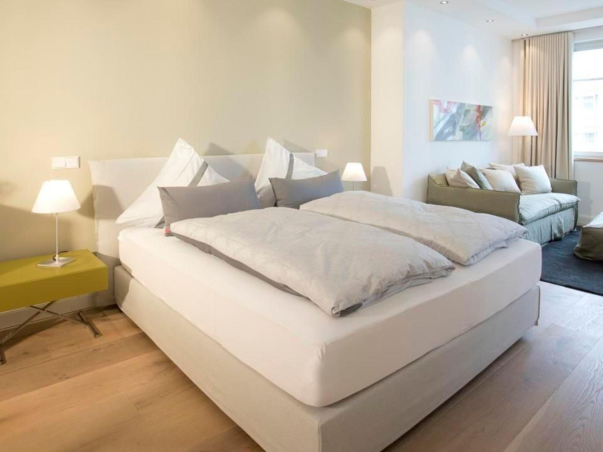 The bedroom with a small sofa area and limited sea view is furnished with great attention to detail. Starting with the large designer box spring (180x200) with a view of the TV and the integrated sauna in the bedroom. The sofa is extendable and offers space for a third person.