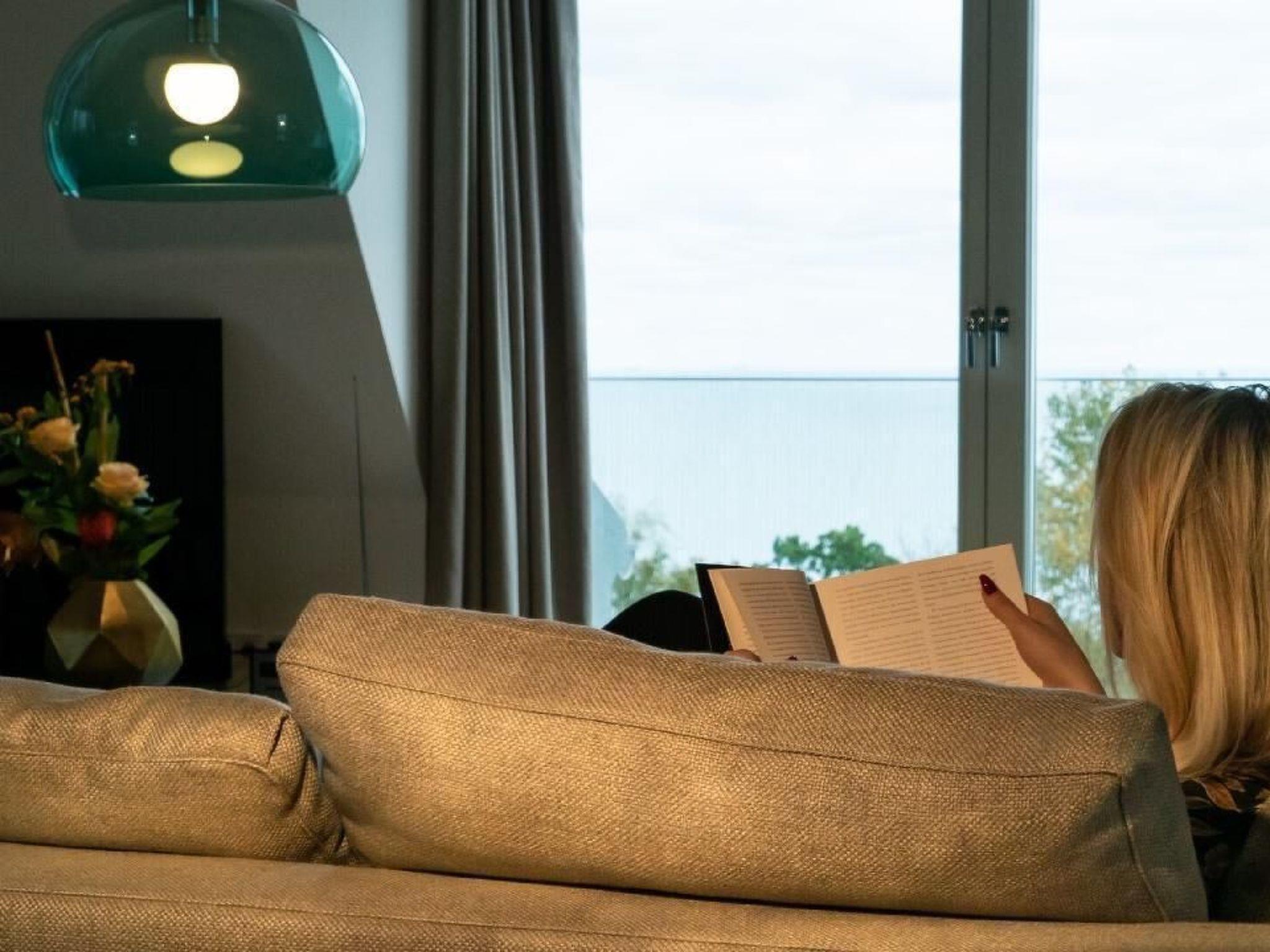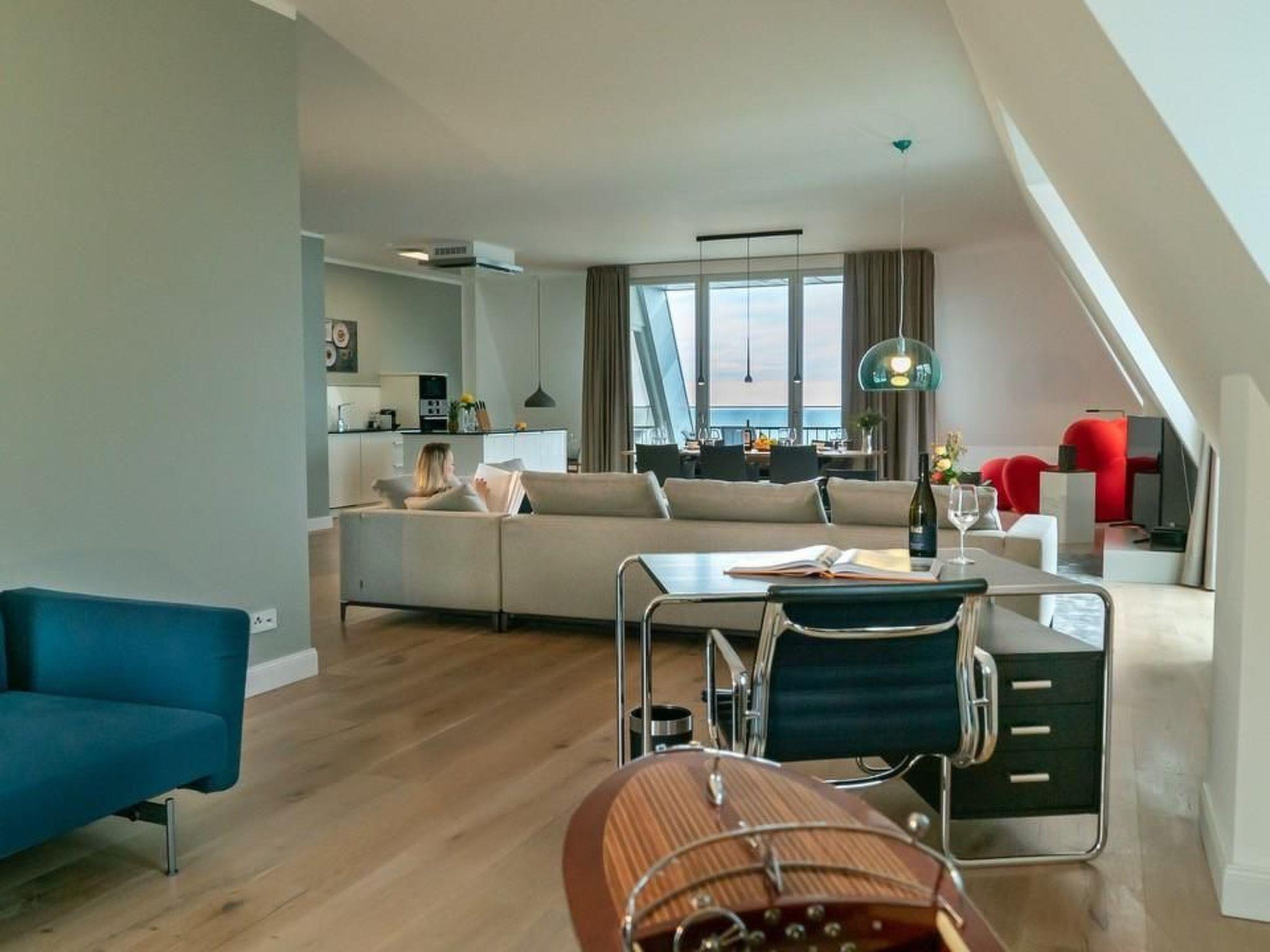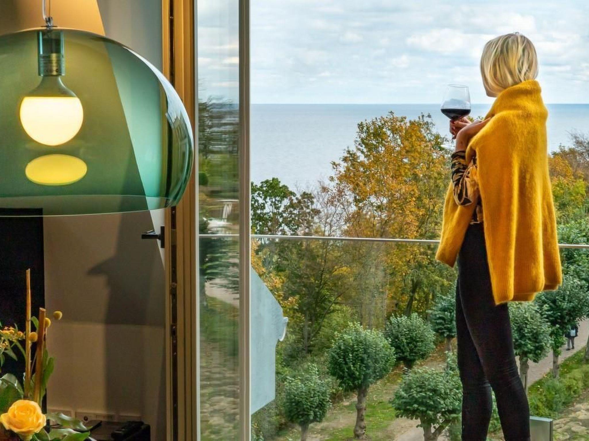 From the loggia, you can see as far as the Orizont, where the sky sinks into the sea, or the chalk coast. The living area, designed with large French windows, offers a unique view of the sea and the high shore. On the south-facing balcony, you can enjoy the sun and the view of the garden with pool and a beech forest. The indoor pool and saunas on the level above the flat can be reached via a staircase or the lift.