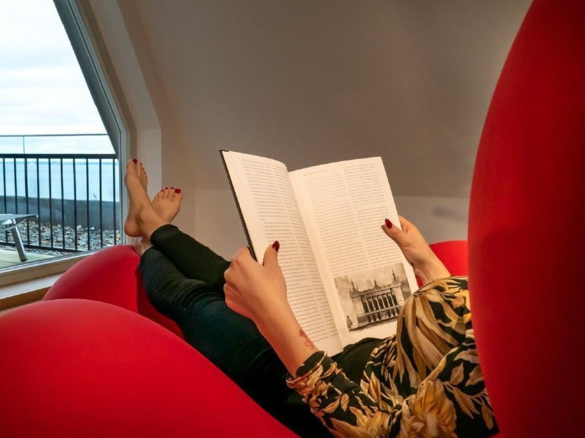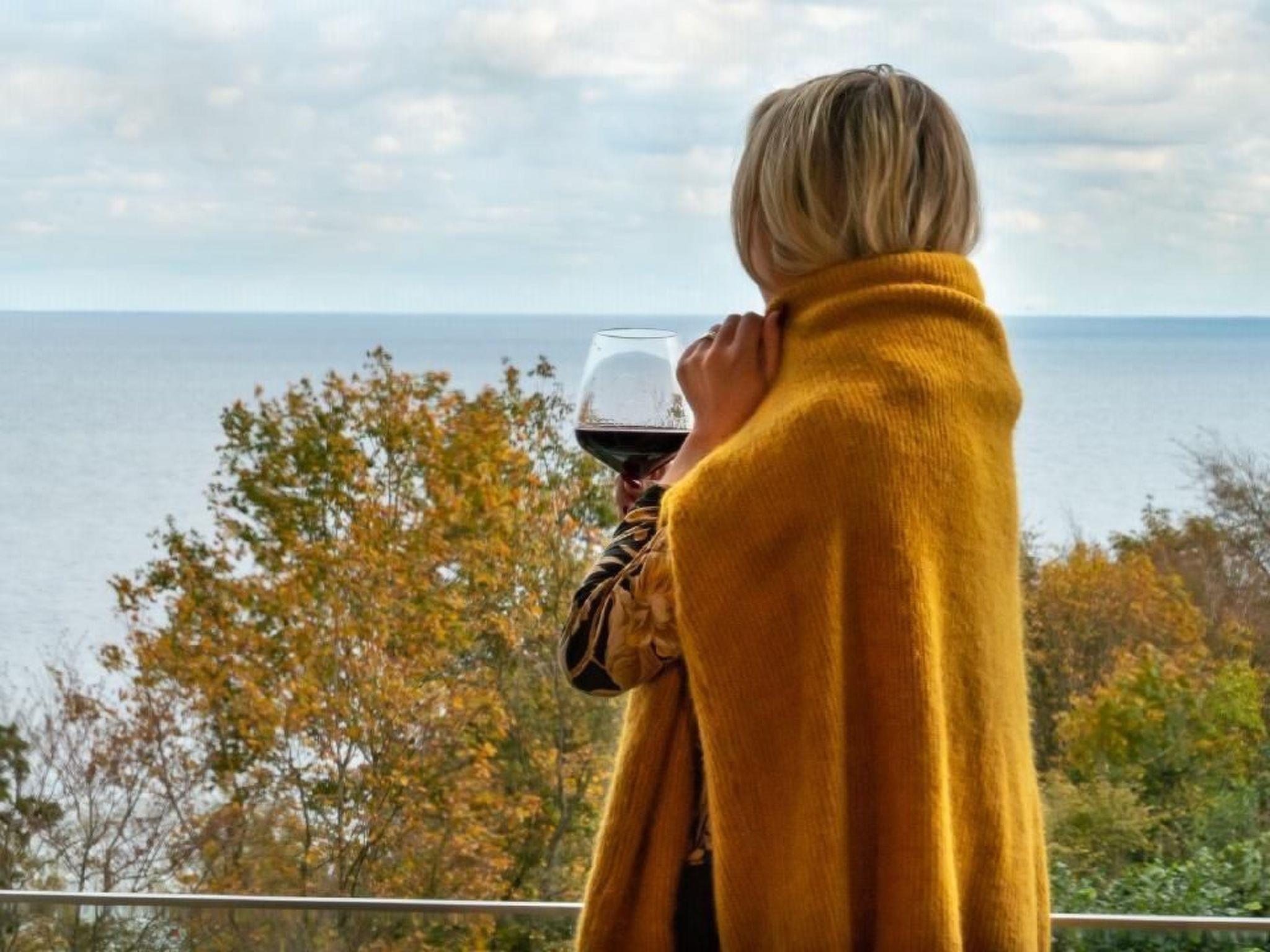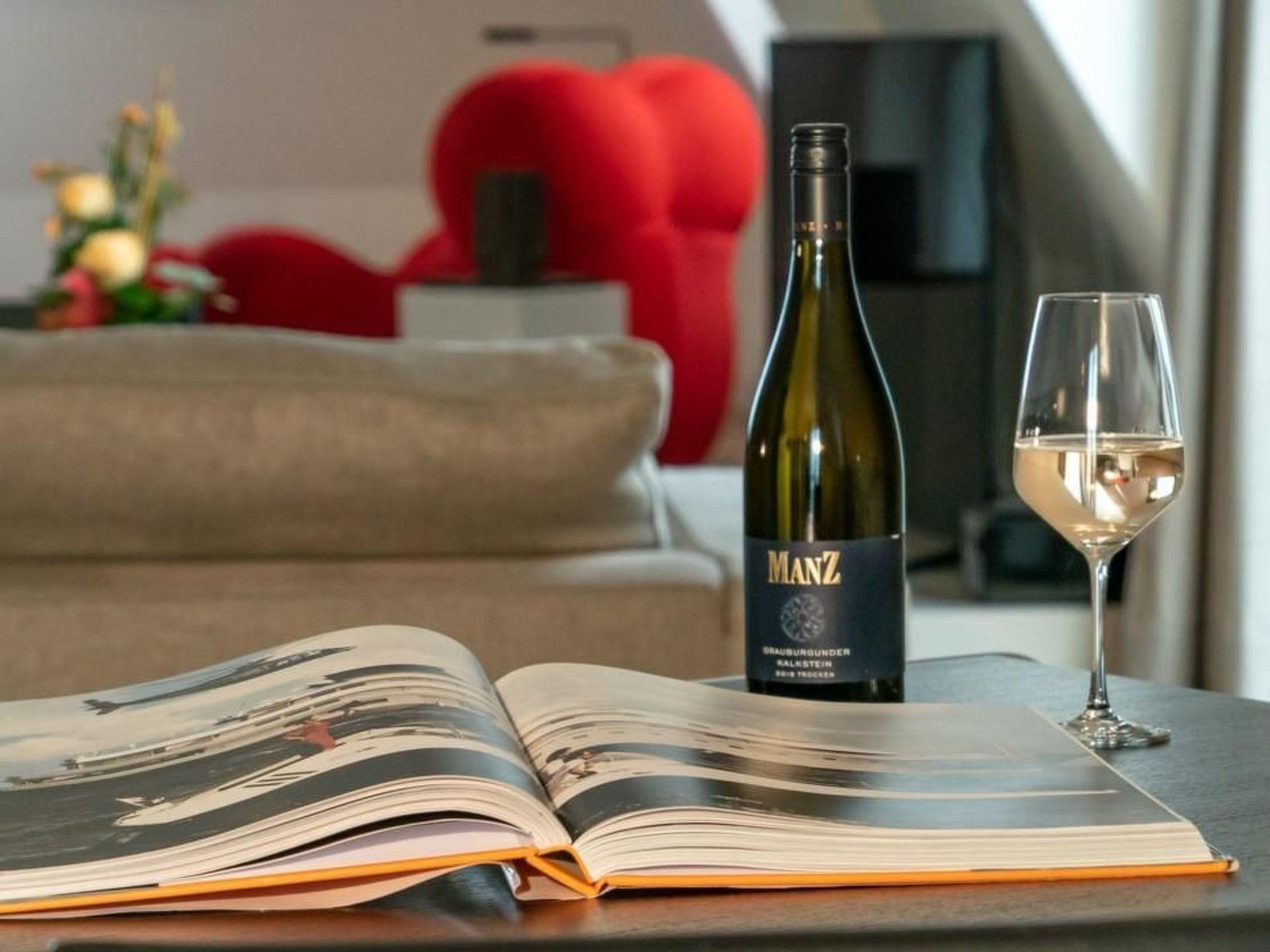 From the loggia, you can see as far as the Orizont, where the sky sinks into the sea, or the chalk coast. The living area, designed with large French windows, offers a unique view of the sea and the high shore. On the south-facing balcony, you can enjoy the sun and the view of the garden with pool and a beech forest. The indoor pool and saunas on the level above the flat can be reached via a staircase or the lift.