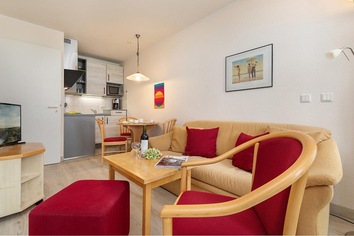 Das Appartement 506 befindet sich im 1. OG des Hauses und hat eine Wohnfläche von 37qm. Das Appartement bietet Platz für maximal 4 Personen. Ein überdachter Balkon erstreckt sich sowohl vor dem Wohnzimmer bis hin zum Schlafzimmer. Der Wohnbereich bietet neben einer gemütlichen Couch (die als Schlafcouch für 2 Personen hergerichtet werden kann) auch einen Esstisch für 4 Personen sowie eine integrierte, offene Küche, die komplett ausgestattet ist. Im hellen Schlafzimmer gibt es ein Doppelbett. Das Bad verfügt über eine ebenerdige Dusche. In der Wohnung gibt es kostenfreies WLAN. Zur Wohnung gehören ein Pkw-Stellplatz in der Tiefgarage sowie eine abschließbare Fahrradabstellmöglichkeit neben der Tiefgarage.