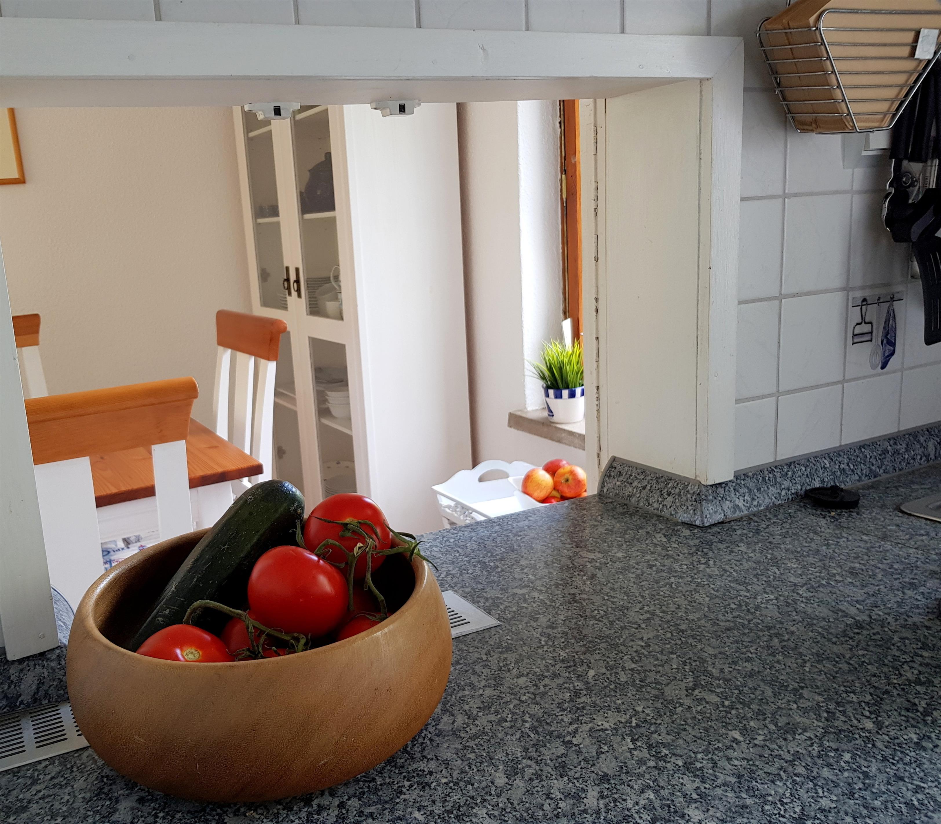 Im Erdgeschoss befindet sich eine kleine Küche, ausgestattet mit Kühlschrank , Geschirrspüler, und div. Elektrogeräten (Kaffeemaschine, Wasserkocher, Toaster) und allem anderen was man so zum Kochen benötigt. Angrenzend befindet sich die Essecke für 4-6 Personen. Zwischen Küche und Essbereich gibt es eine Durchreiche.
