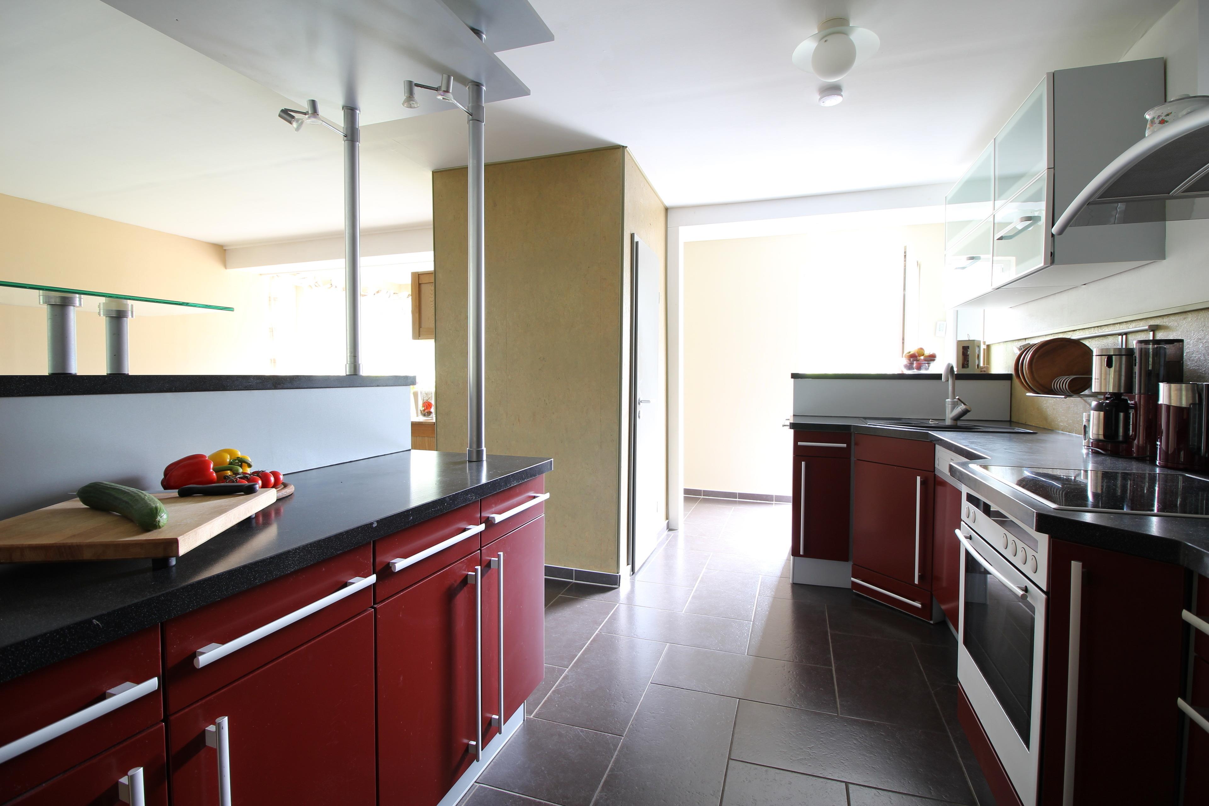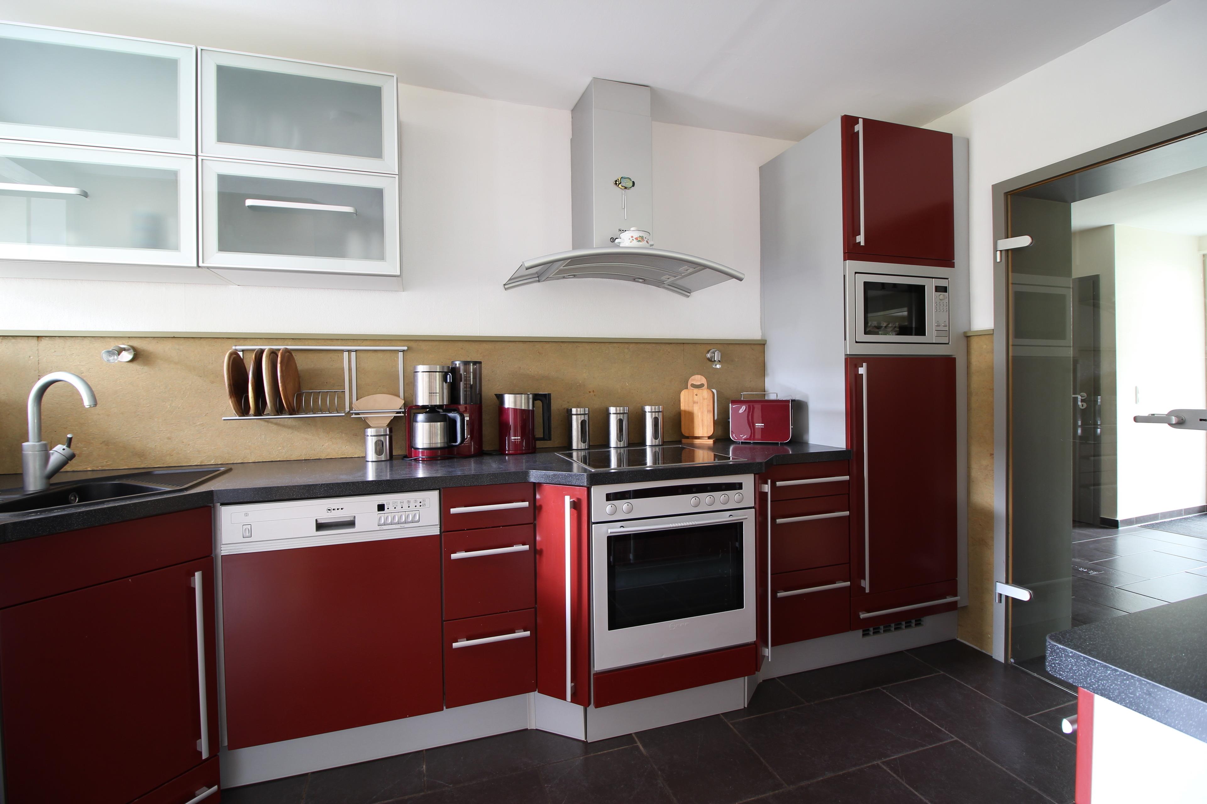 Auf gleicher Ebene befindet sich eine offene Küche, ausgestattet mit Kühlschrank (incl. Gefrierfach), Geschirrspüler, und div. Elektrogeräten (Kaffeemaschine, Wasserkocher, Toaster) und allem anderen was man so zum Kochen benötigt. Angrenzend befindet sich die Essecke für 4-6 Personen.