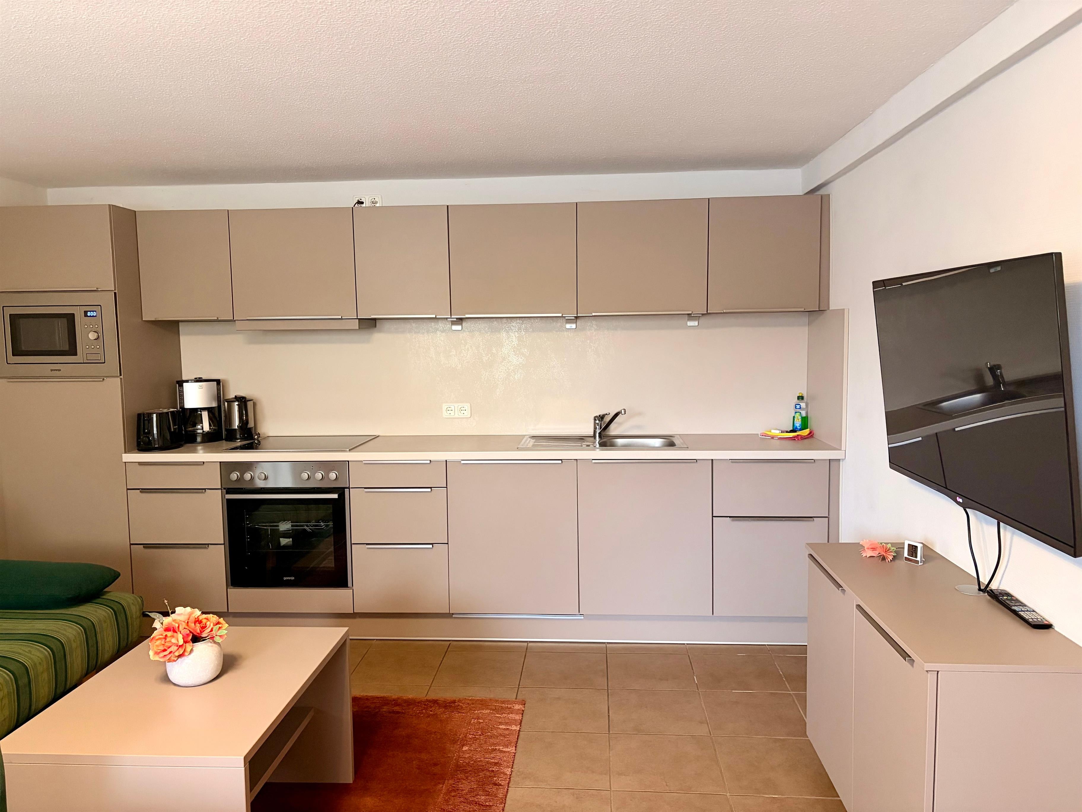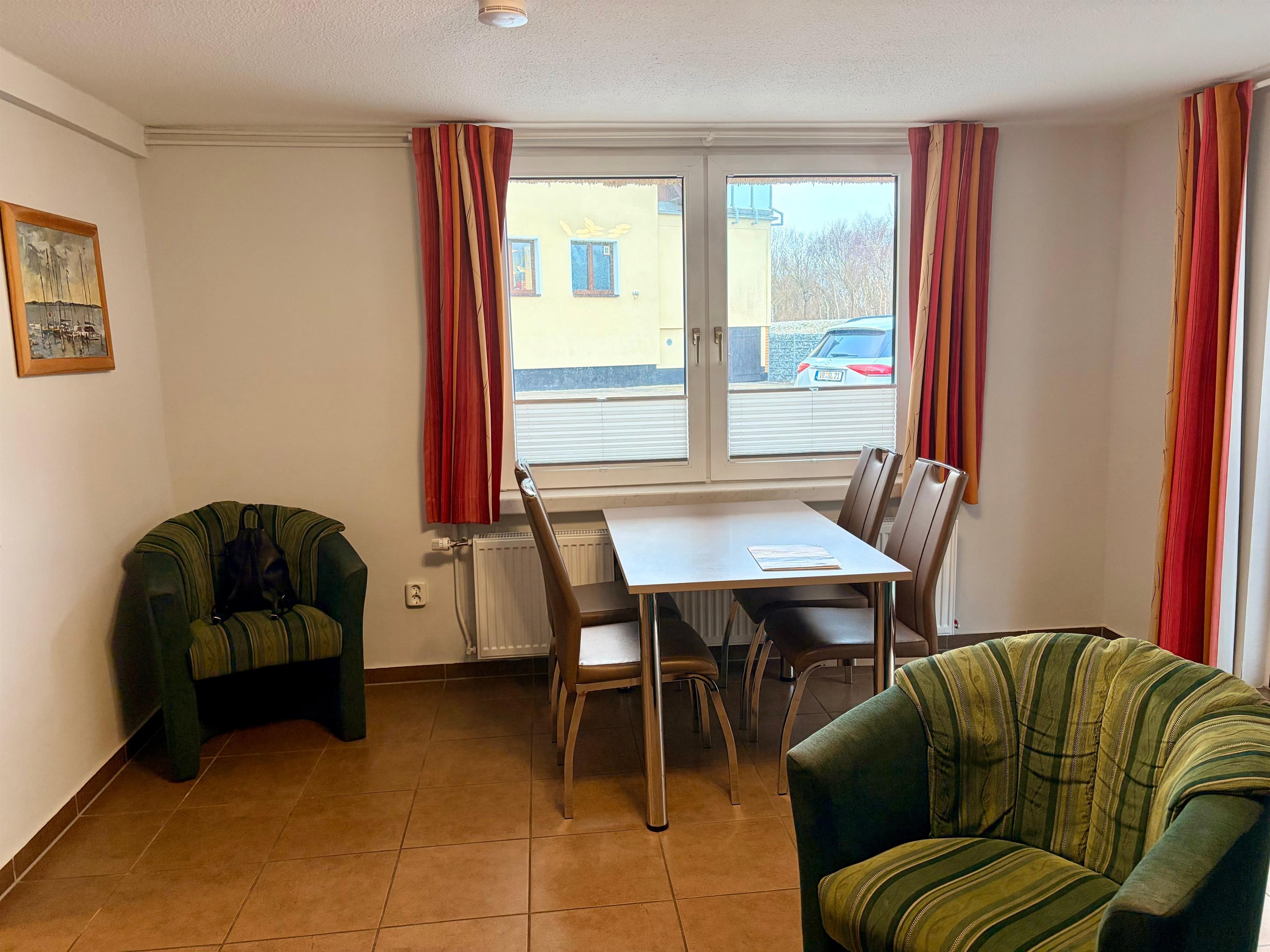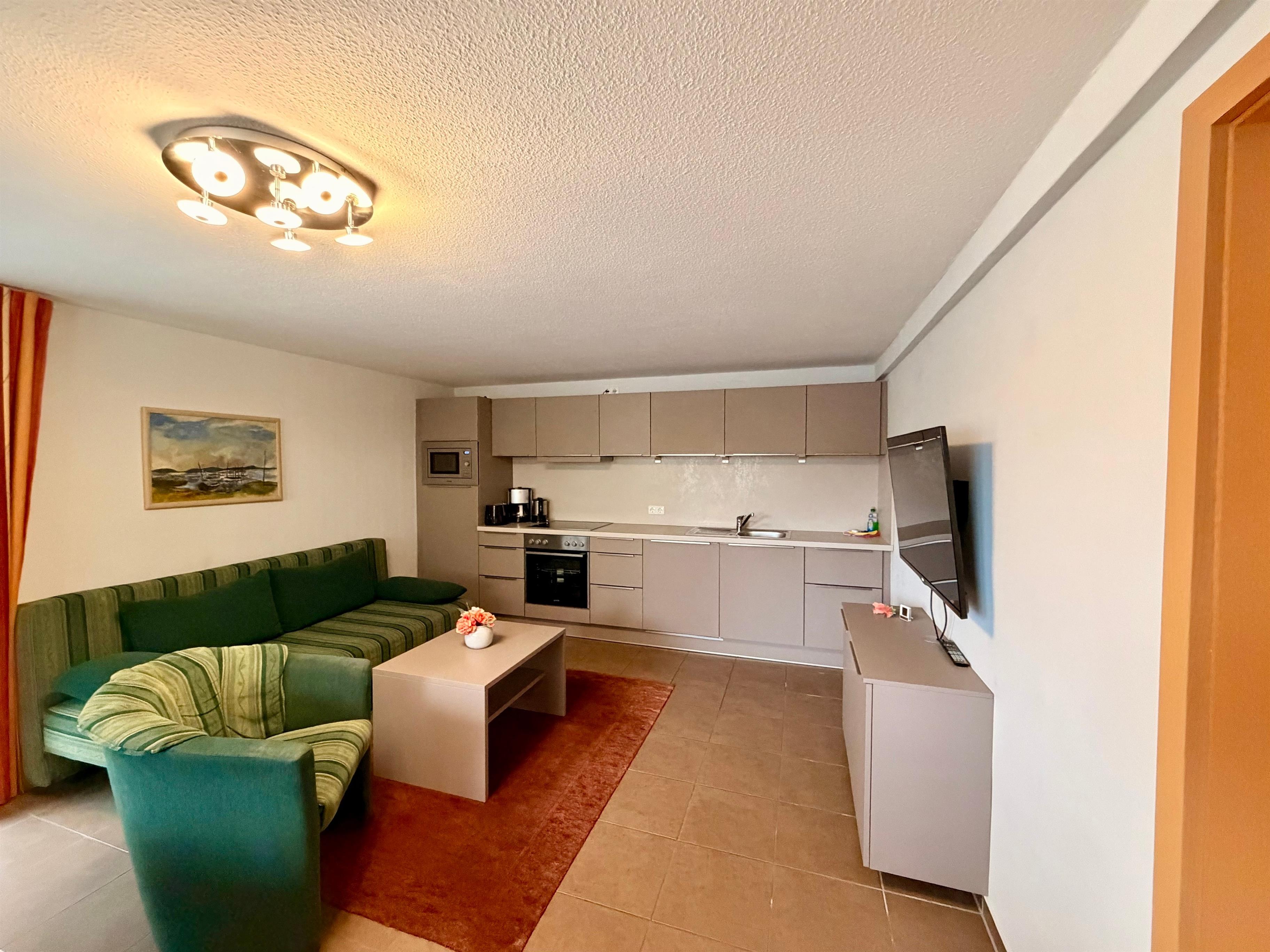 Die Wohnung befindet sich im Erdgeschoss und verfügt über einen Wohn- Essbereich mit integrierter Küchenzeile sowie zwei Schlafzimmer mit insgesamt drei Betten. Alle Fenster sind mit Fliegengittern und Plissees ausgestattet und sorgen für Komfort zu jeder Jahreszeit.