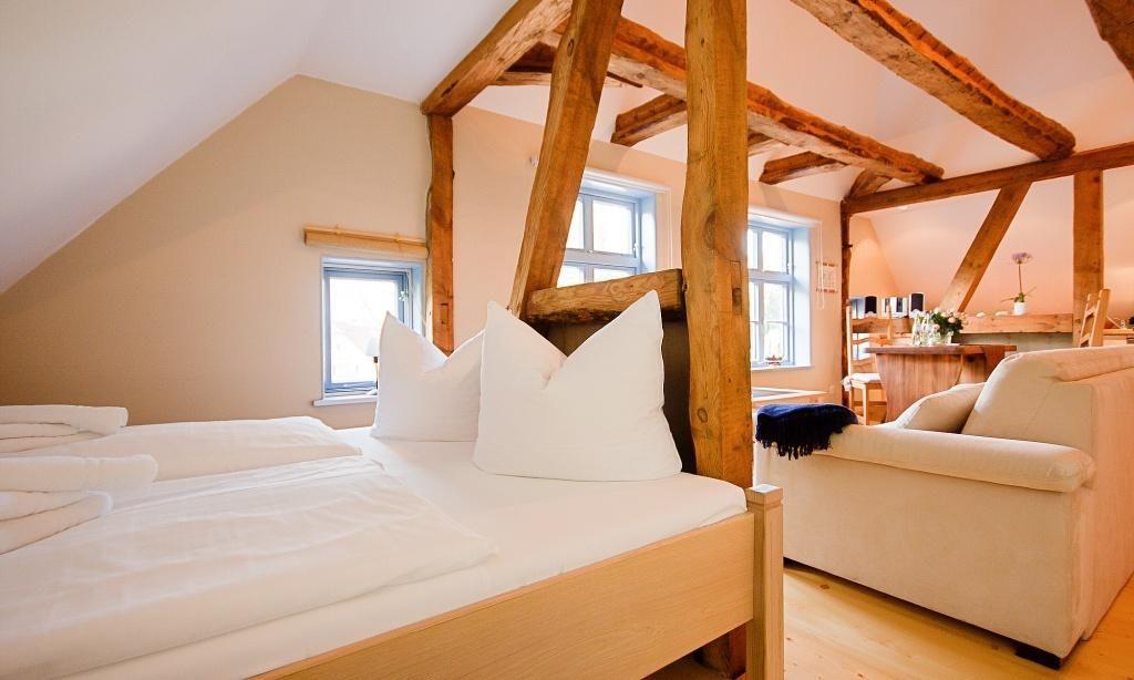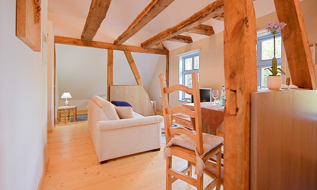 Die urige kleine Dachgeschosswohnung umfasst einen Wohn- und Schlafraum, der mit einem gemütlichen Sofa, einem Doppelbett und einer Küchenzeile ausgestattet ist. Der Esstisch befindet sich am sonnigen Fensterplatz und bietet einen schönen Ausblick ins Grüne. Die dekorativen Fachwerkbalken sind Relikte aus historischen Zeiten, die das Haus bereits erlebt hat und die jetzt zu einer heimeligen Wohnatmosphäre beitragen.