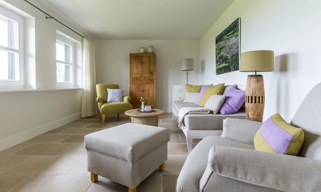 Die Ferienwohnung begeistert durch ihren liebevollen und zeitgleich sehr hochwertigen Landhausstil. Es erwartet dich ein eleganter Wohnraum mit gemütlichem Sofa, Sesseln und einem traumhaften Essbereich an bodentiefen Fenstern. Zum exklusiven Wohnraum gehören auch ein Kaminofen und ein wundervoller Blick auf den Garten. Die moderne Küche befindet sich separat und ist ebenfalls sehr komfortabel ausgestattet. Sanfte Naturtöne und -materialien führen sich auch in der Einrichtung der beiden Schlafzimmer fort, die mit exquisiten Doppelbetten und ausgesuchten Deko-Elementen möbliert sind. Hier findest du den erholsamen Schlaf, den du dir im Urlaub wünschst. Zwei moderne Bäder mit Dusche/WC vervollständigen die komfortable und 90 Quadratmeter große Ferienwohnung.