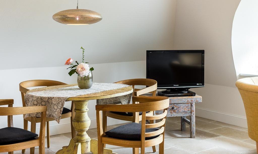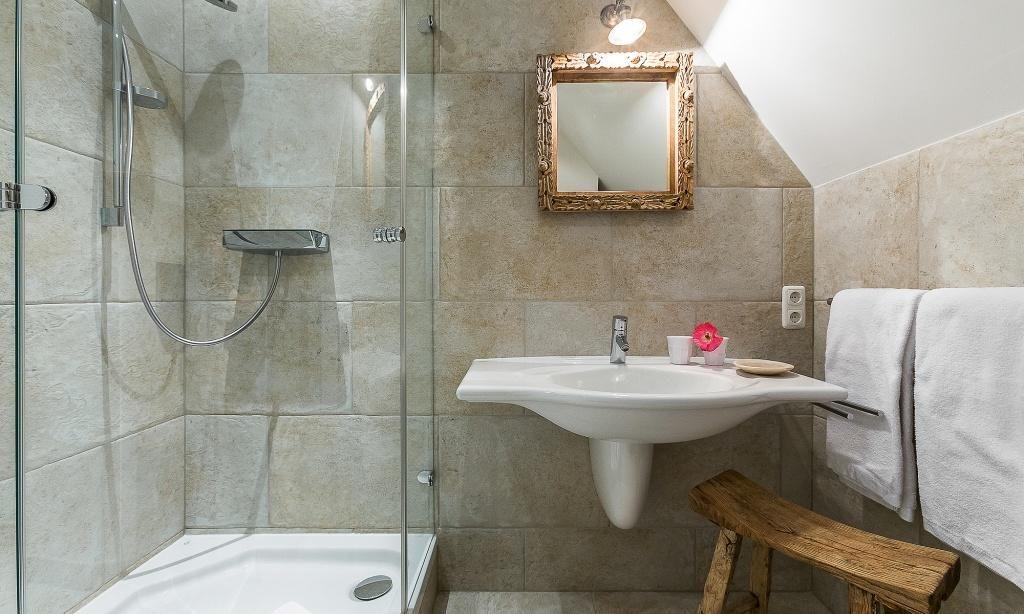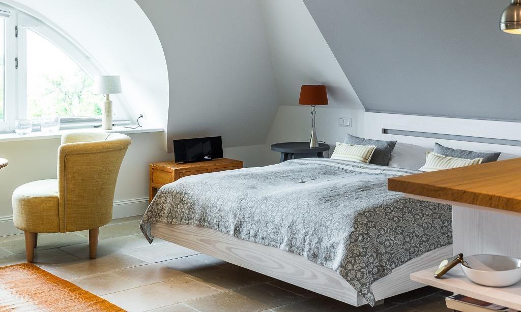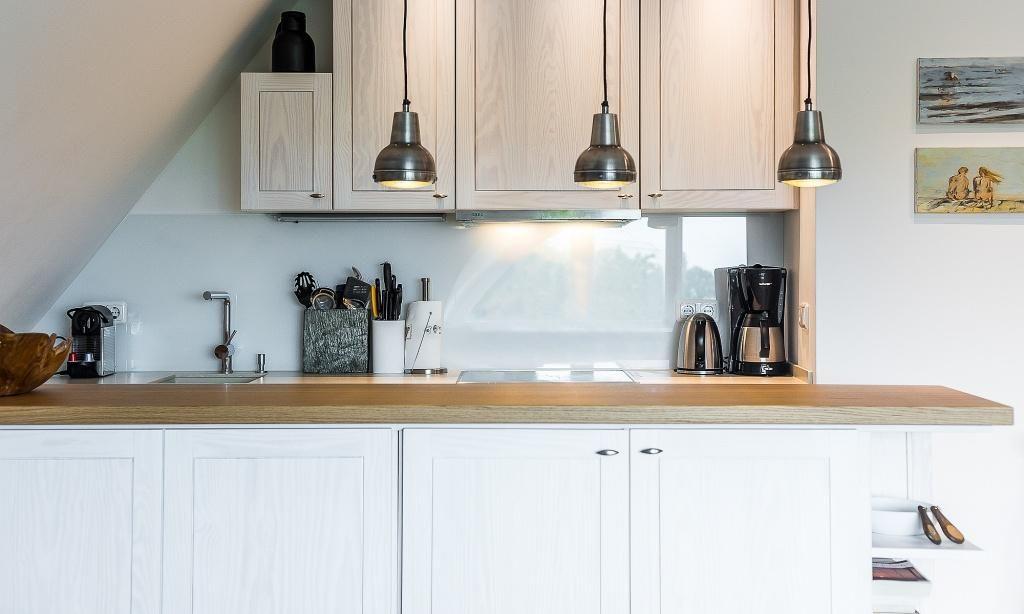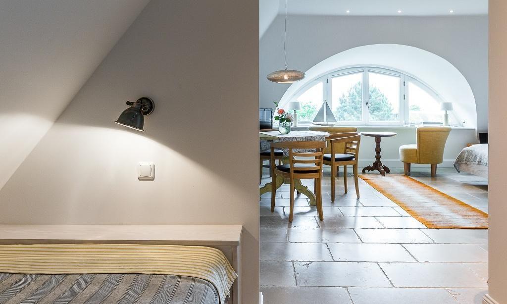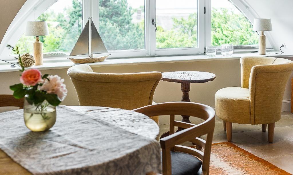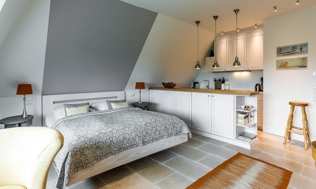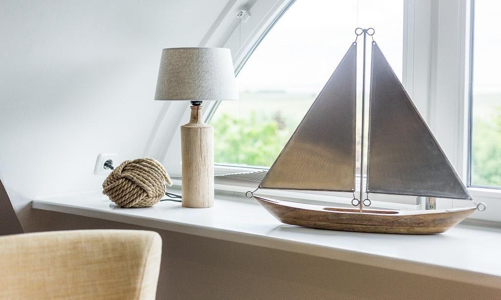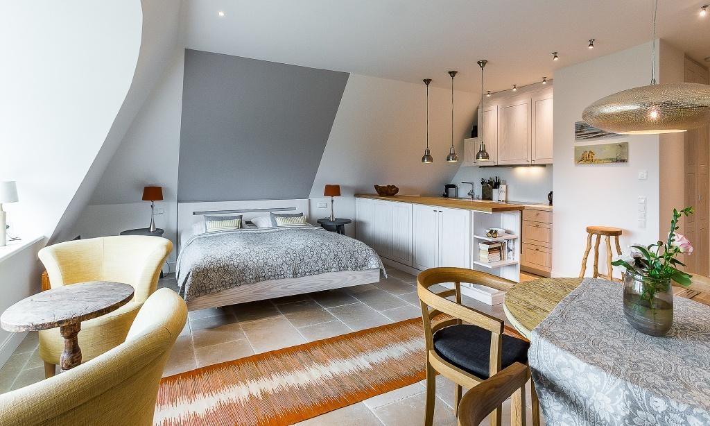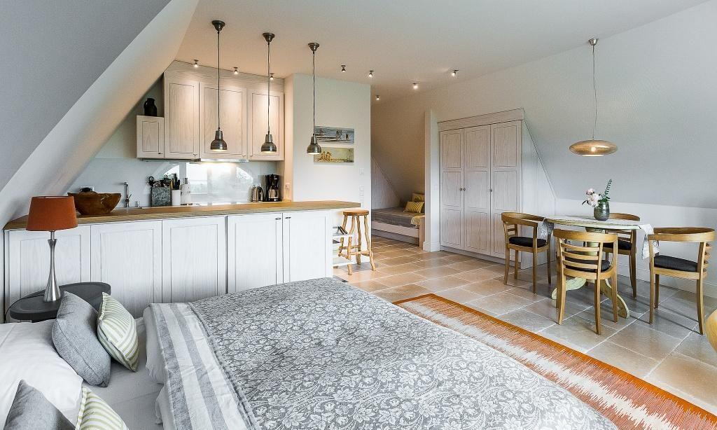 Die Studiowohnung im Dachgeschoss begeistert durch ihre stilvolle Einrichtung und komfortable Aufteilung. Es erwartet dich ein eleganter Wohn- und Schlafraum mit einem gemütlichen Sitzplatz am Gaubenfenster mit traumhaftem Boddenblick, ein Esstisch, ein exquisites Doppelbett und eine moderne Küchenzeile. Sanfte Naturtöne und -materialien sowie ausgesuchte Deko-Elemente machen den Wohlfühl- und Wohnkomfort perfekt. Eine separate Schlafnische mit einem Einzelbett und ein elegantes Bad mit Dusche/WC vervollständigen die komfortable und 50 Quadratmeter große Ferienwohnung.