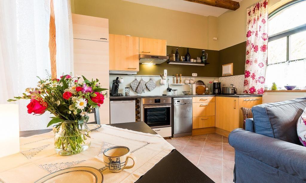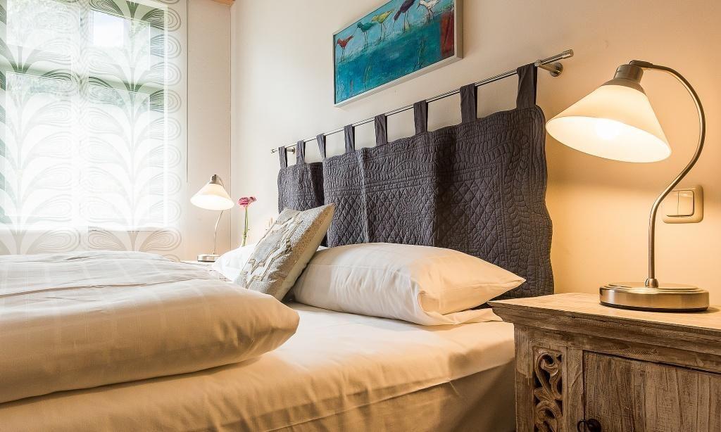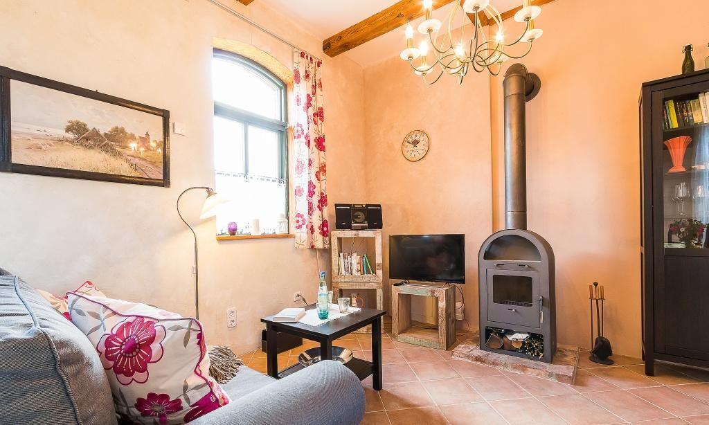 Der liebevoll eingerichtete Wohnbereich mit gemütlichem Sofa (Aufbettung möglich) am Kamin gehört zum "alten" Teil der ehemaligen Tischlerei und ist gemeinsam mit der integrierten Küchenzeile und dem Essplatz der Mittelpunkt des heimeligen Ferienhauses. Das teilweise erhaltene Mauerwerk und die Fachwerkbalken sorgen für einen besonderen Charakter und tolle Wohnatmosphäre. Ein Schlafzimmer mit einem Doppelbett sowie ein kleines Bad mit Dusche/WC runden das niedliche Ferienhaus ab.