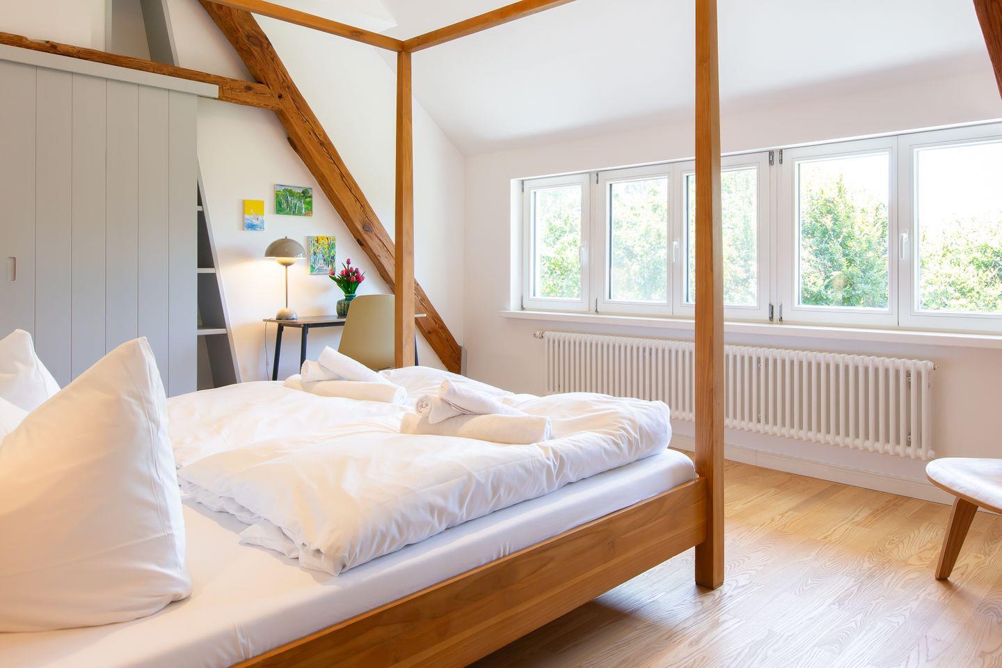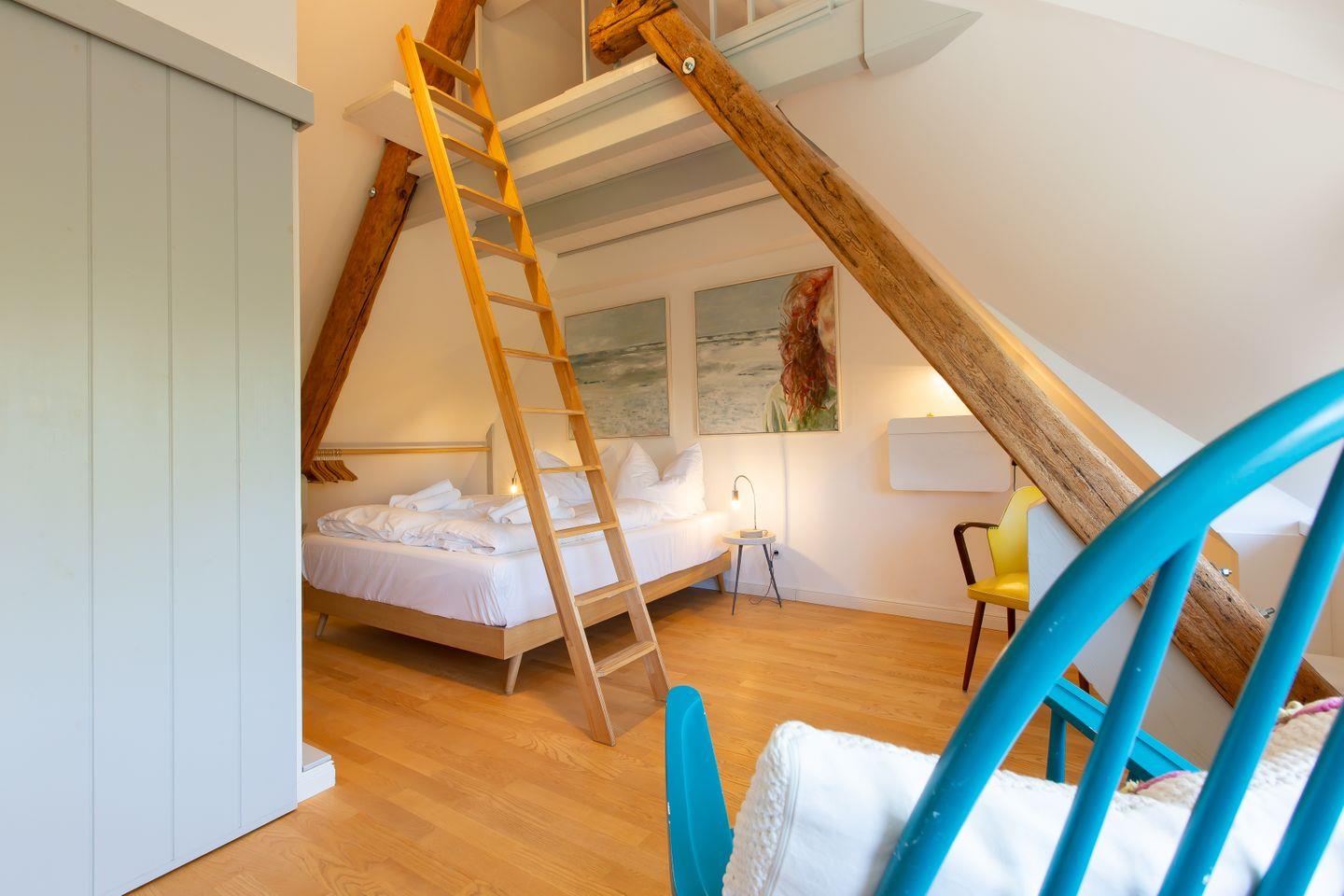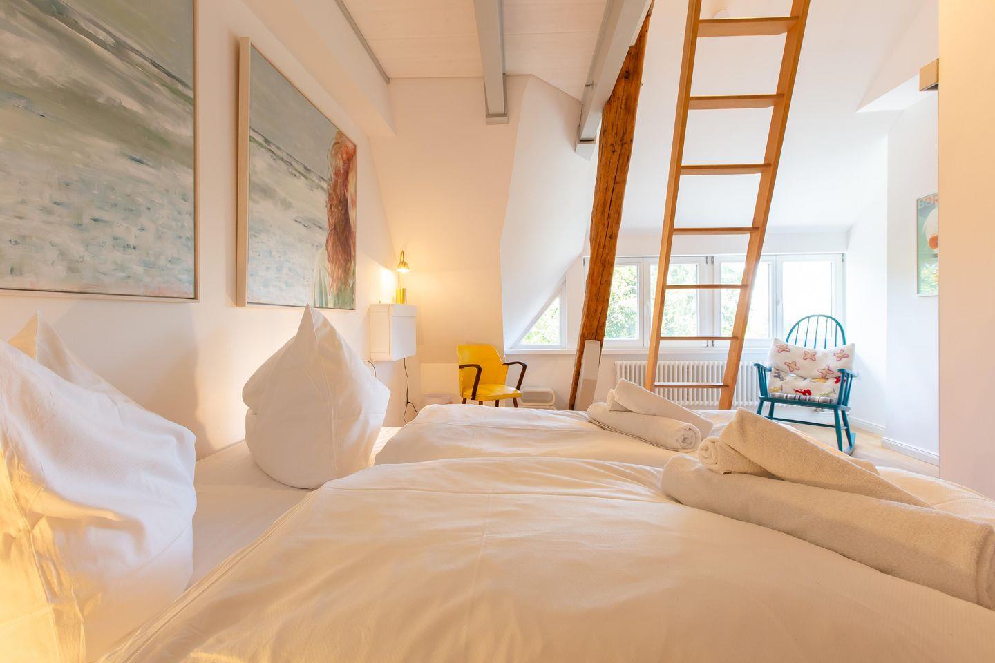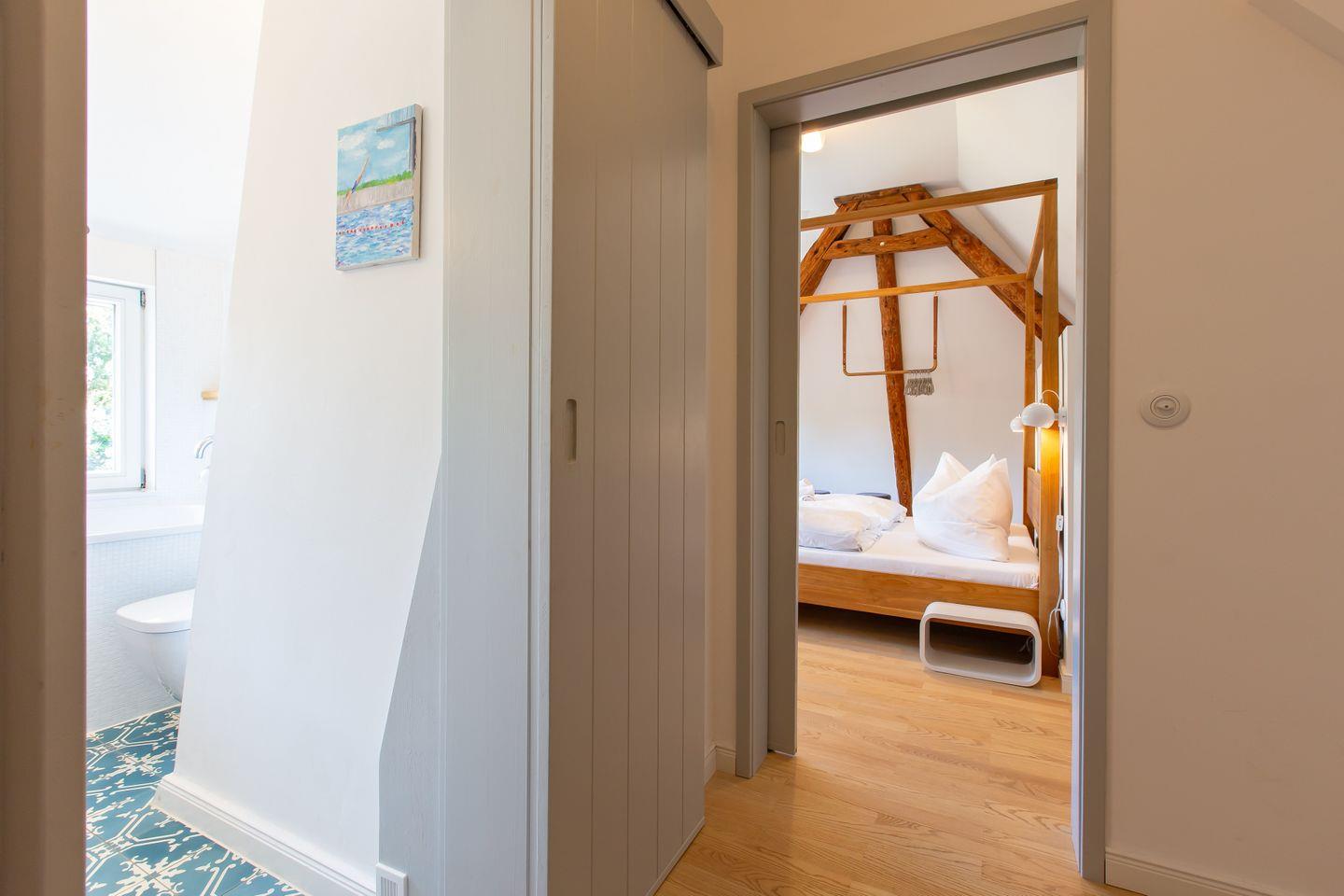 Es ist dieser unerwartete Kontrast zwischen traditioneller Fischlandarchitektur und moderner Inneneinrichtung, die den Aufenthalt in dieser hochwertig sanierten Doppelhaushälfte zu einem ganz besonderen Urlaubserlebnis macht. Freigelegte Holzbalken, schiefe Wände und massive Holztüren sind Zeitzeugen einer uralten Baukultur und zugleich liebevolle Dekoration der stilvollen und eleganten Inneneinrichtung. Die 115 Quadratmeter Wohnfläche verteilen sich auf zwei Etagen. Beim Betreten des Flurs sieht man bereits, dass das Ambiente durch warme Naturmaterialien, helle Farben und eine offene und großzügige Raumaufteilung geprägt ist. Ein komfortables Badezimmer mit Dusche, eine topmoderne Küche mit Esstisch sowie der boheme und künstlerisch gestaltete Wohnbereich befinden sich im Erdgeschoss. Über eine Holztreppe gelangt man in ein weiteres Badezimmer mit Badewanne sowie die zwei Schlafzimmer des Hauses. Die offen gelegten Holzbalken sowie Einbauten wirken wie Designobjekte und bieten ein Höchstmaß an Erholung.