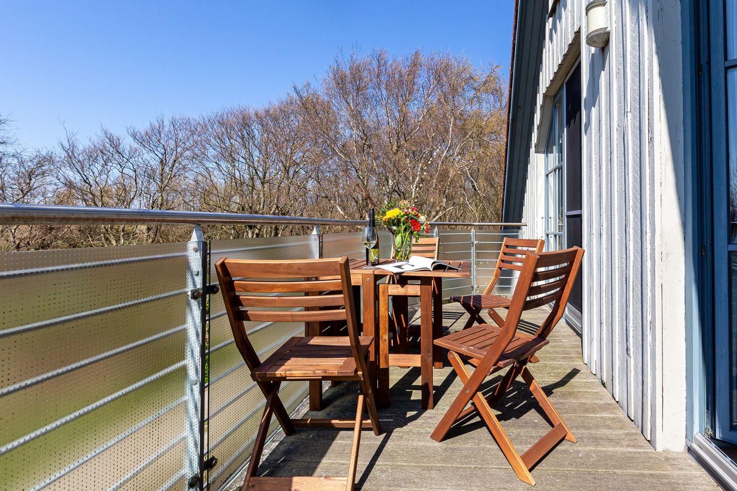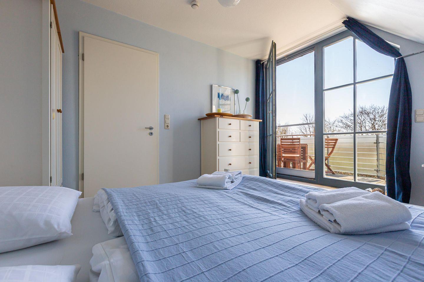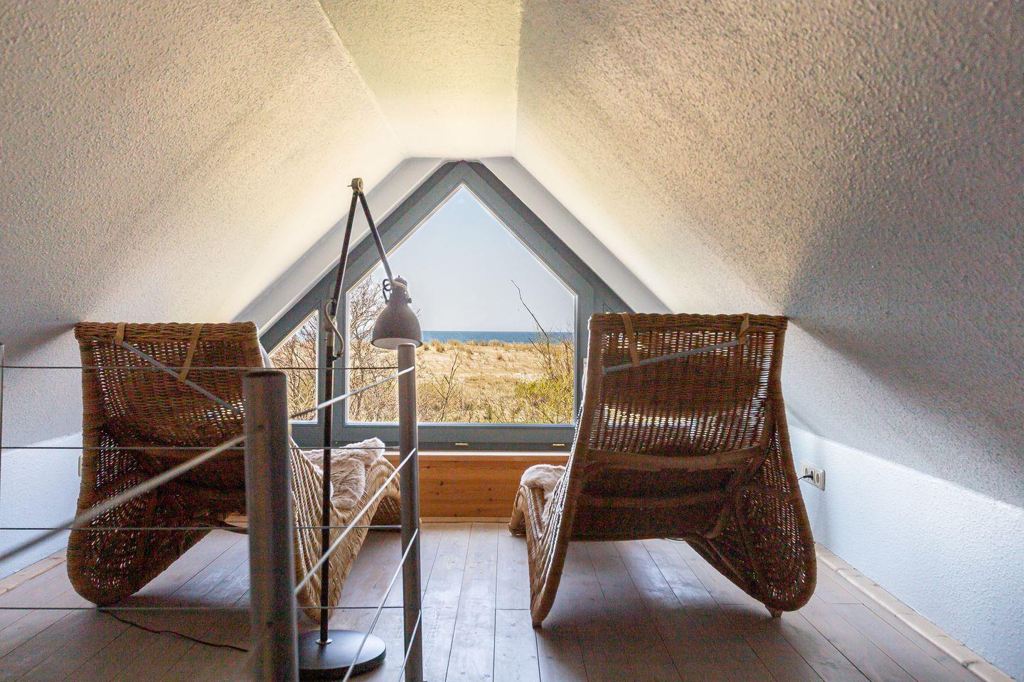 Die gemütliche Ferienwohnung befindet sich im Obergeschoss des Strandhauses und begeistert mit einer tollen Raumaufteilung und Highlights wie der Lesegalerie mit Relaxliegen und Blick auf das Ostseepanorama. Mittelpunkt der Wohnung ist der offene Wohn- und Küchenbereich mit Kamin und Zutritt zum Balkon. Das gemütliche Sofa, der sonnige Essbereich und die großen Fensterfronten mit Blick in die Natur sorgen für eine herrliche Urlaubsatmosphäre und bieten den perfekten Rückzugsort nach einem ausgiebigen Strandtag. Über eine Leiter gelangt man auf die Empore. Mit den Entspannungsliegen und dem Ausblick findet man hier einen zusätzlichen Ruheraum. Das Hauptschlafzimmer befindet sich gleich nebenan und verfügt neben einem Doppelbett und ausreichend Stauraum für die Kleidung ebenfalls über einen Zugang zum Balkon. Ein zweites Schlafzimmer ist mit zwei Einzelbetten ausgestattet, das sich hervorragend als Kinderzimmer eignet. Abgerundet wird die Wohnung durch ein Tageslichtbad mit Dusche, Fön und Handtuchhalter.