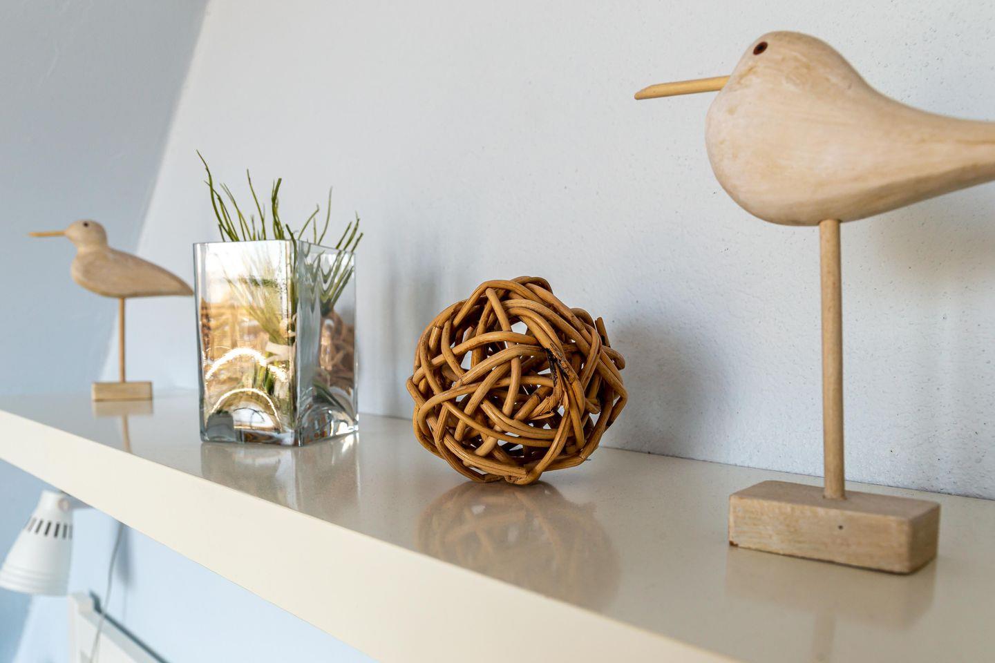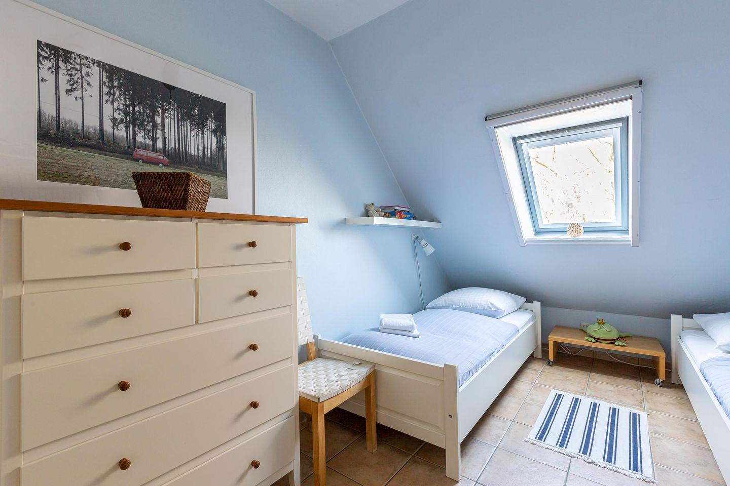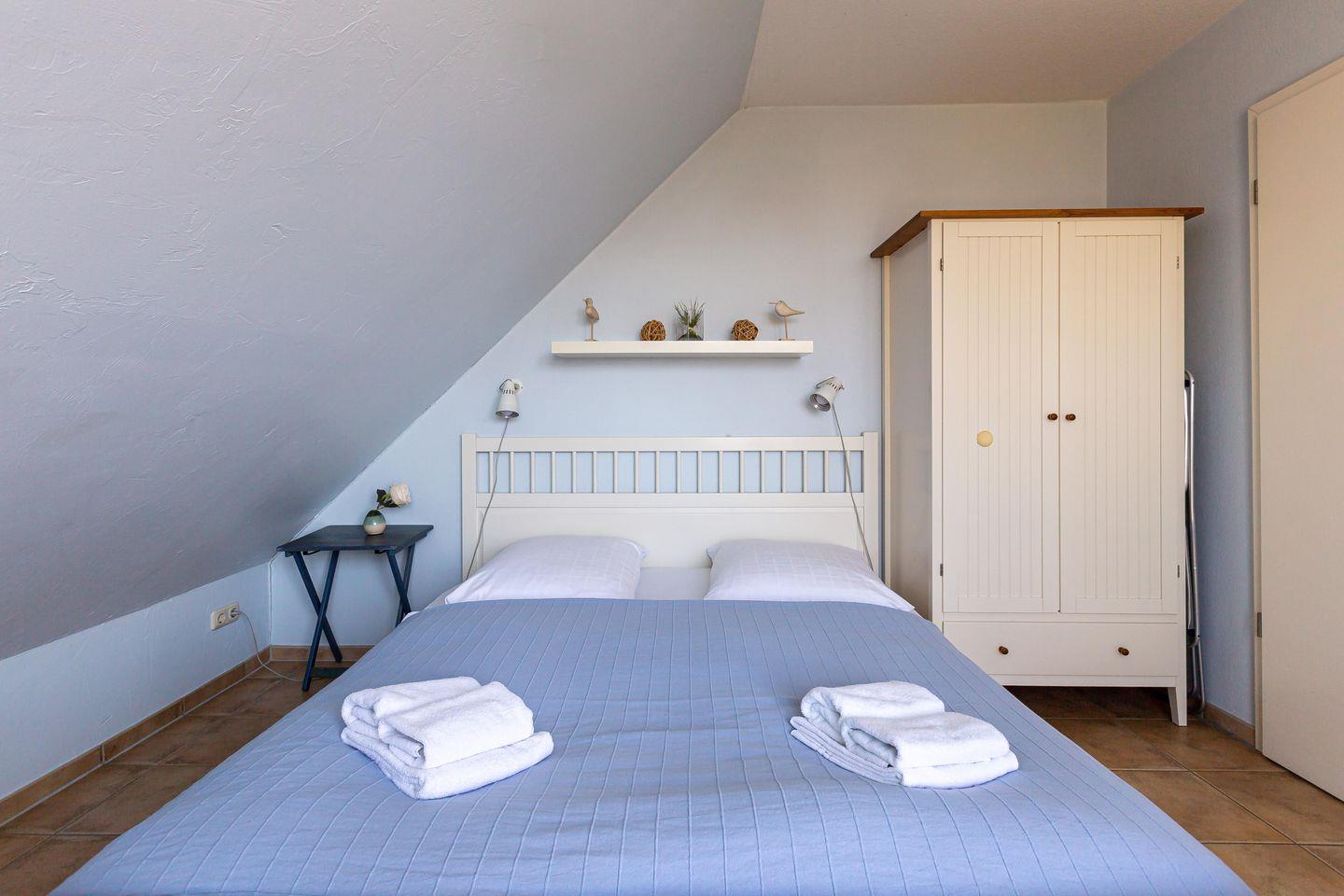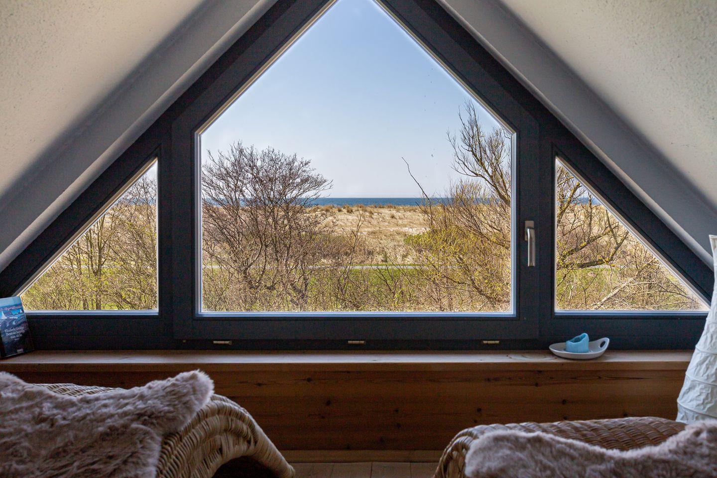 Die gemütliche Ferienwohnung befindet sich im Obergeschoss des Strandhauses und begeistert mit einer tollen Raumaufteilung und Highlights wie der Lesegalerie mit Relaxliegen und Blick auf das Ostseepanorama. Mittelpunkt der Wohnung ist der offene Wohn- und Küchenbereich mit Kamin und Zutritt zum Balkon. Das gemütliche Sofa, der sonnige Essbereich und die großen Fensterfronten mit Blick in die Natur sorgen für eine herrliche Urlaubsatmosphäre und bieten den perfekten Rückzugsort nach einem ausgiebigen Strandtag. Über eine Leiter gelangt man auf die Empore. Mit den Entspannungsliegen und dem Ausblick findet man hier einen zusätzlichen Ruheraum. Das Hauptschlafzimmer befindet sich gleich nebenan und verfügt neben einem Doppelbett und ausreichend Stauraum für die Kleidung ebenfalls über einen Zugang zum Balkon. Ein zweites Schlafzimmer ist mit zwei Einzelbetten ausgestattet, das sich hervorragend als Kinderzimmer eignet. Abgerundet wird die Wohnung durch ein Tageslichtbad mit Dusche, Fön und Handtuchhalter.