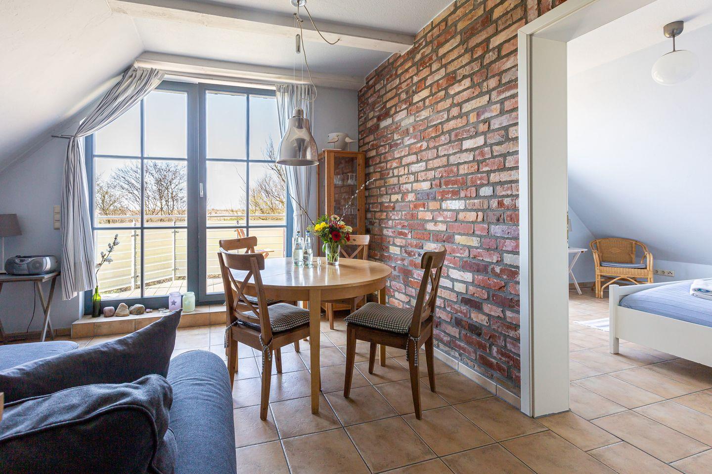 Im Außenbereich steht dir ein Balkon zur Verfügung. Von hieraus siehst du beim Ausklang des Abends auf die wunderschöne Deichlandschaft, Möwengeschrei, Meeresrauschen und teils spektakuläre Sonnenuntergänge inklusive. Zur Ferienwohnung gehört außerdem ein PKW-Stellplatz.