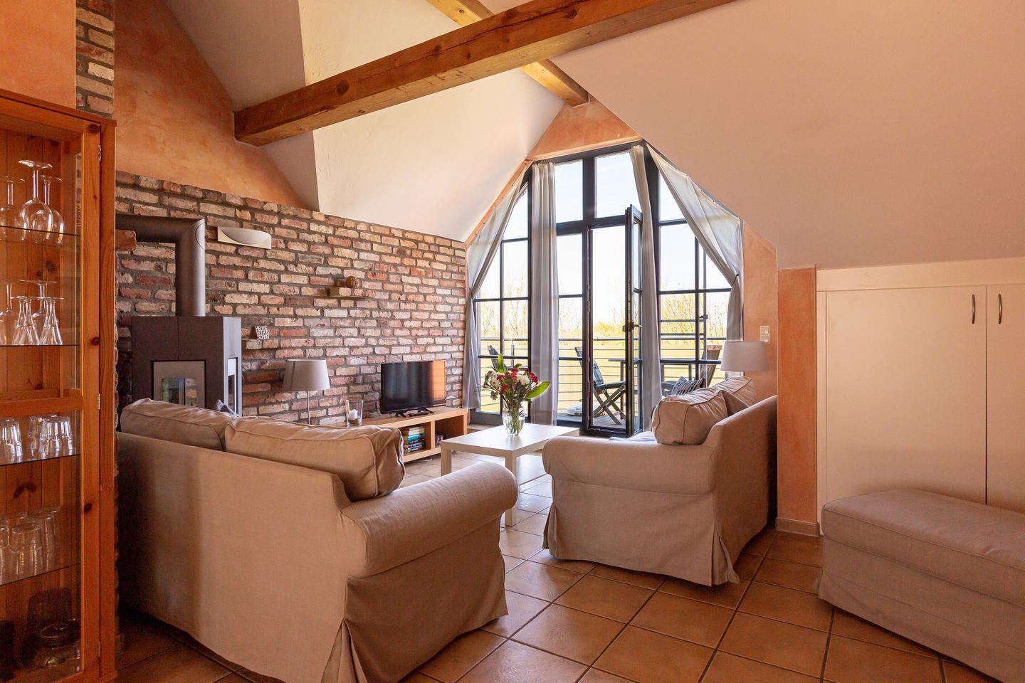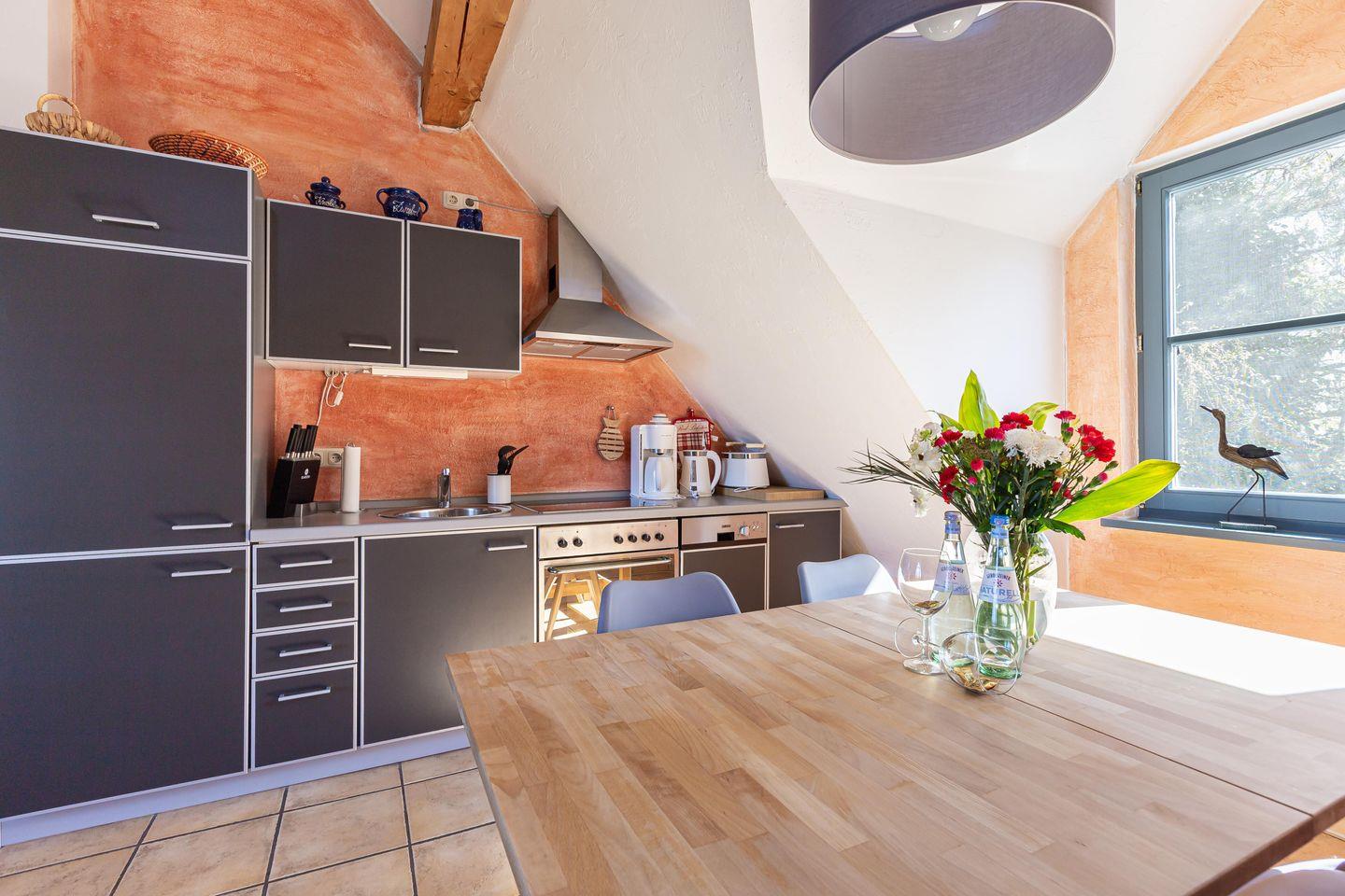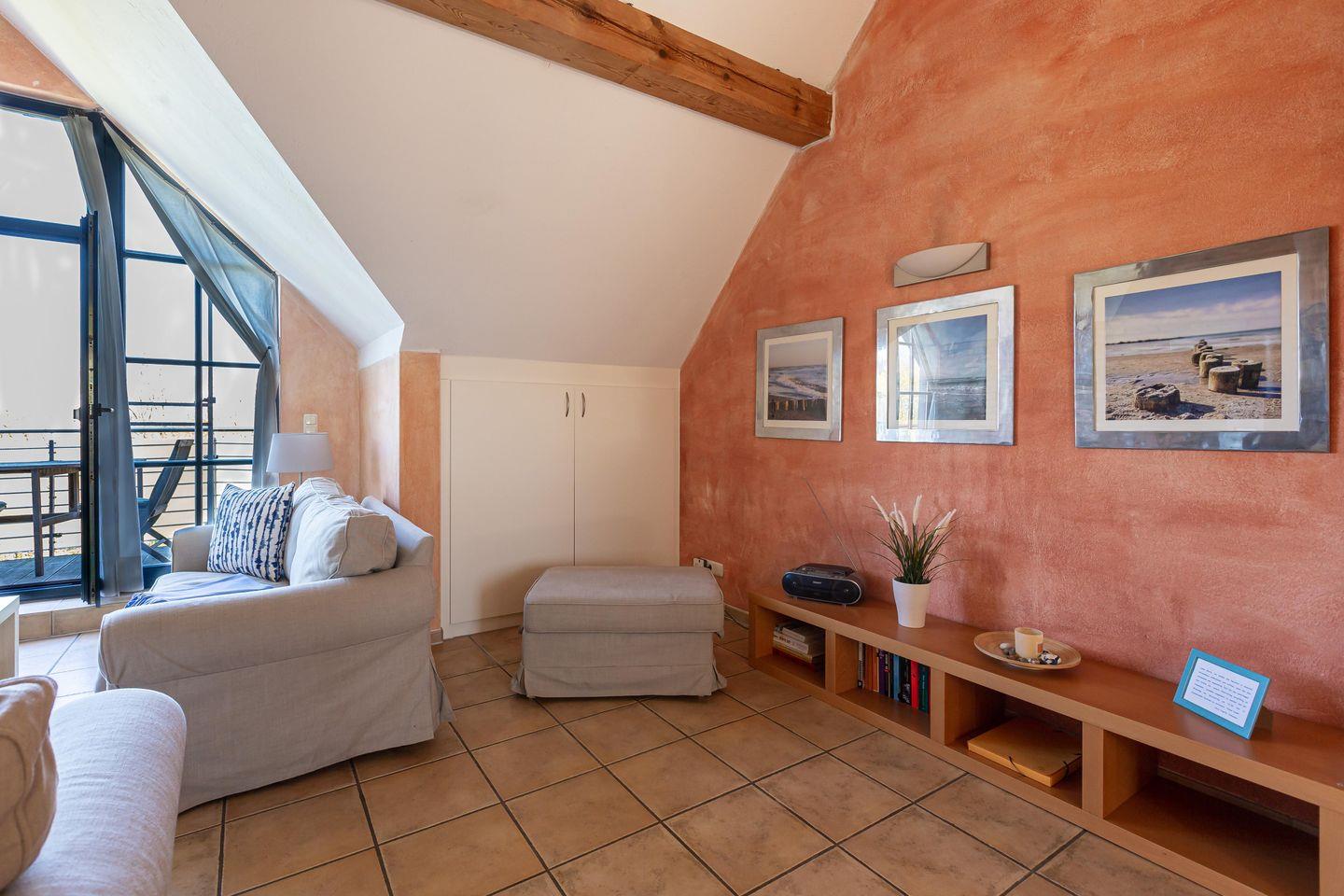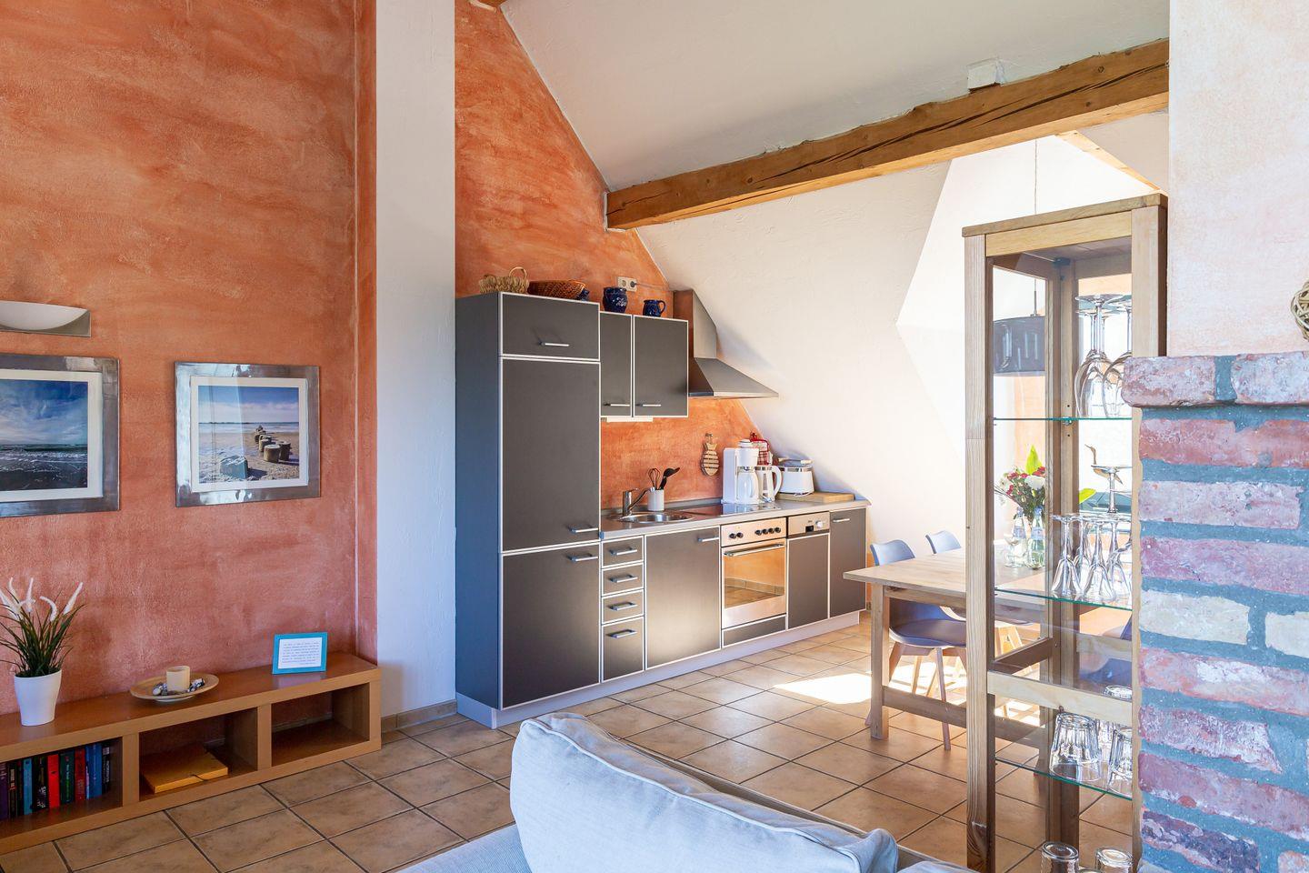 Diese heimelige Maisonette-Wohnung befindet sich im ersten Stock des Strandhauses und garantiert einen traumhaften Blick über den Deich auf der Westseite und auf den Bodden zur Ostseite. Das Herzstück der Wohnung ist der offen gestaltetet Wohn- und Küchenbereich, der mit seinem freigelegten Holzbalken, dem Kamin und der gemauerten Ziegelwand eine dekorative und urgemütliche Wohnatmosphäre schafft. Zur Wohnung gehört eine top ausgestattete Küchenzeile mit Esstisch und Blick auf die überfluteten Fischlandwiesen. Ruhe und Erholung findest du auch im Hauptschlafzimmer, das mit einem Doppelbett und Kleiderschrank ausgestattet ist. Wie von jedem Punkt der Wohnung genießt du auch hier einen fantastischen Blick in die Natur. Ein weiterer Schlafbereich befindet sich im offenen Spitzboden über dem Wohnraum und ist über eine steile Holztreppe begehbar. Vervollständigt wird die Wohnung durch ein modernes Tageslichtbad mit ebenerdiger Dusche.