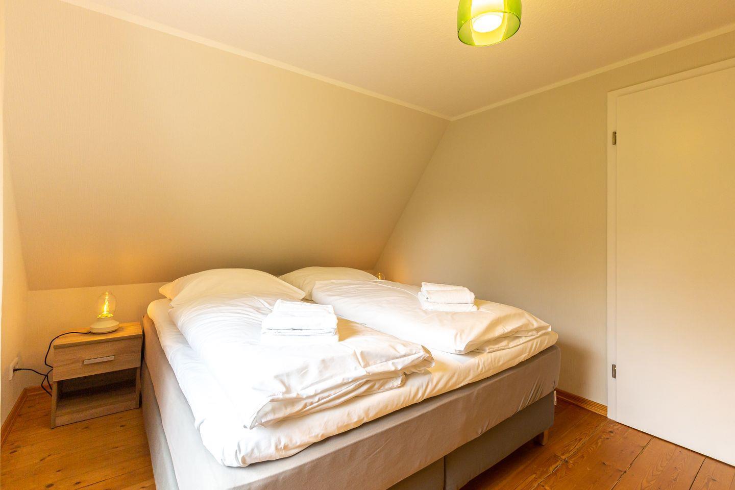 Das ehemalige Sommerhaus ist in 2022 aufwendig saniert worden und begeistert mit einem ganzjährig erholsamen Ostseeurlaub. Es vereint fischlandtypische Architektur, natürliche Baumaterialien und eine moderne Ausstattung, die zusammen eine entspannte Urlaubsatmosphäre schaffen. Der großzügige Wohn- und Essbereich ist zweifelsohne der Mittelpunkt des Hauses. Hier kann man es sich auf dem großen XXL-Sofa gemütlich machen oder gemeinsam mit der Familie am Esstisch klönen. Dank der vollausgestatteten Küche, die ein wenig separat und doch offen gestaltet ist, lässt es sich hier nach Herzenslust kochen. Auch das Tageslichtbad mit Dusche/ WC und Handtuchhalter befindet sich im Erdgeschoss. Über die Treppe im Eingangsbereich gelangt man in die zwei Schlafzimmer des Ferienhauses. Hochwertige Doppelbetten, warme Farben und ausreichend Stauraum für die Kleidung schaffen die perfekten Rückzugsorte für einen erholsamen Schlaf.
