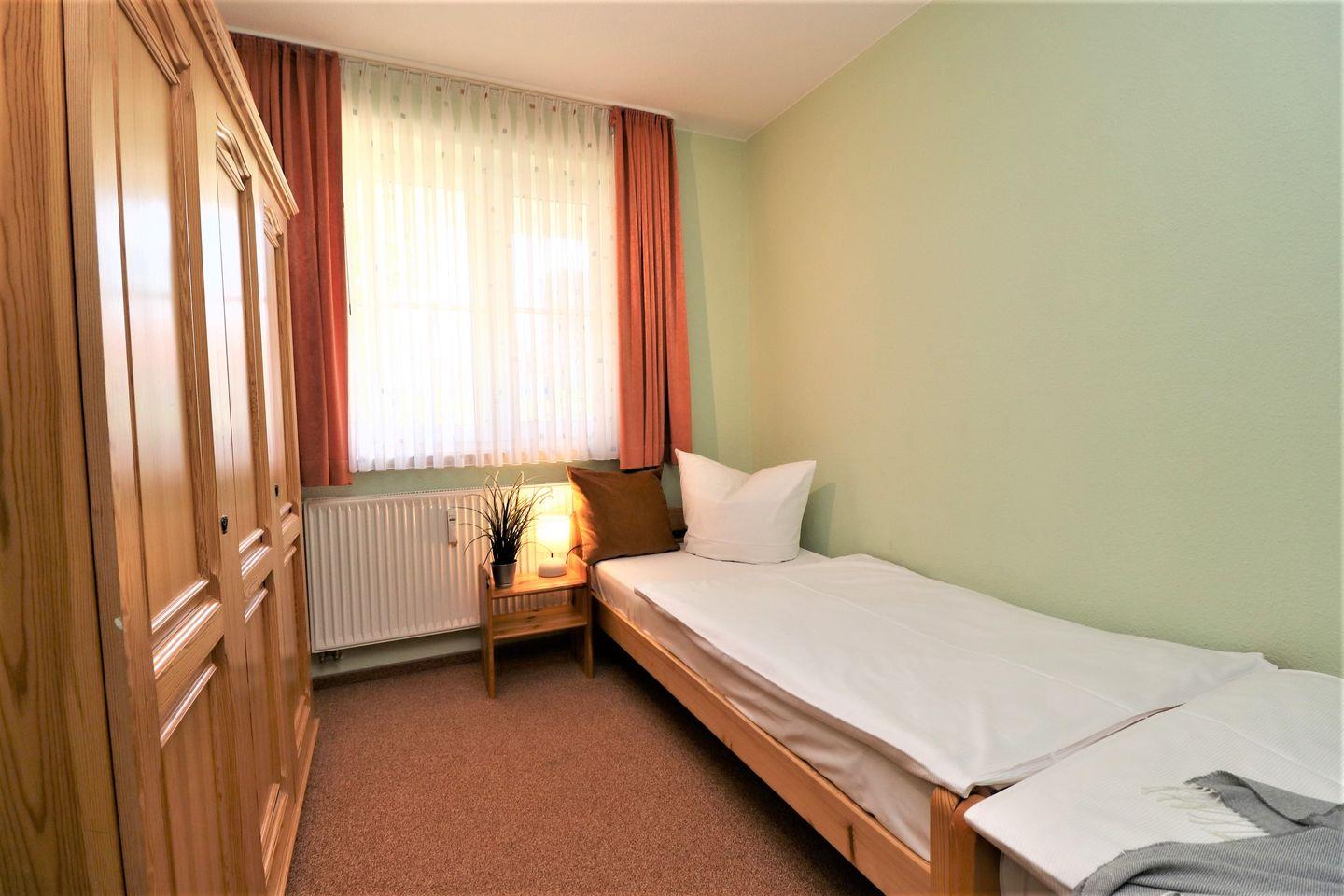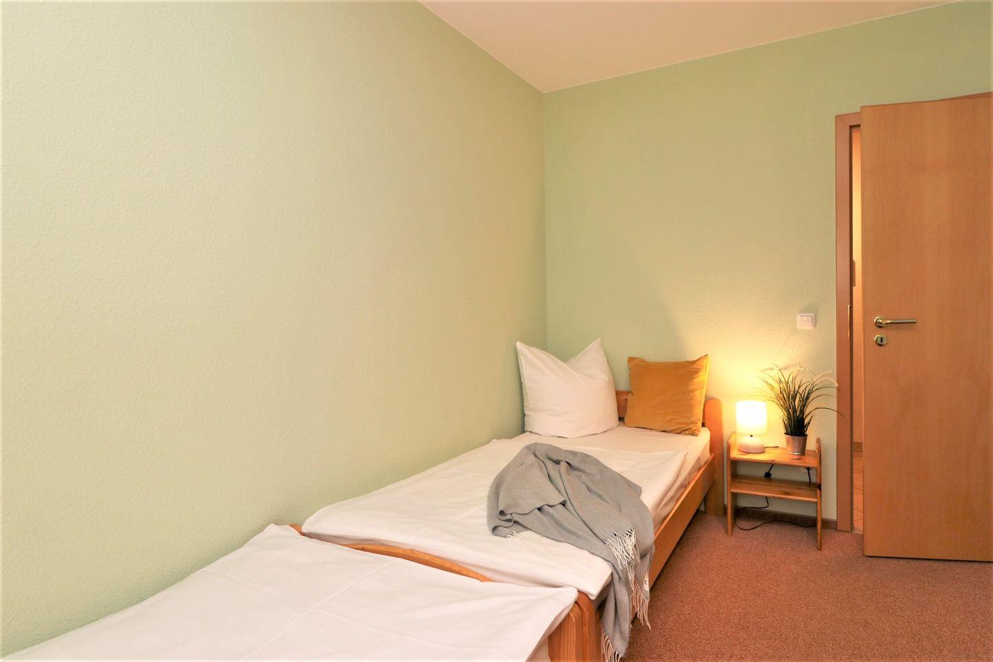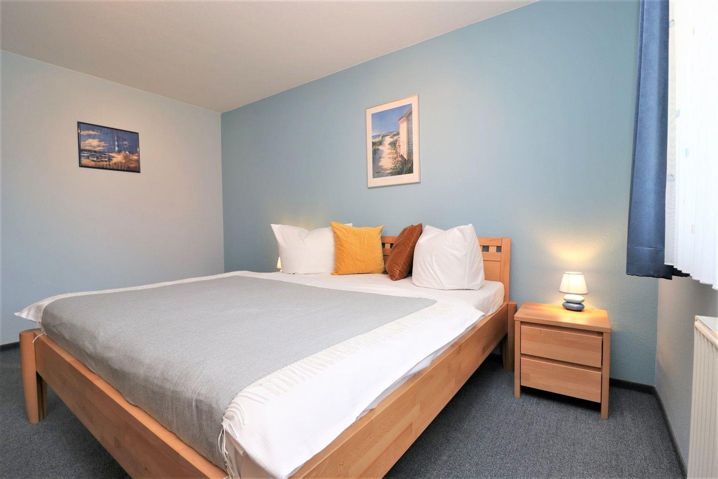 Dieses geräumige Erdgeschoss-Appartement bietet auf ca. 67 m² Platz für maximal 4 Personen und ist ideal für einen komfortablen Aufenthalt. Das Wohnzimmer ist mit einer integrierten Küchenzeile ausgestattet, die Ihnen alle nötigen Annehmlichkeiten bietet, um Ihre Mahlzeiten selbst zuzubereiten. Die gemütliche Einrichtung sorgt für eine entspannte Atmosphäre. Es gibt zwei Schlafzimmer: Ein Schlafzimmer mit einem gemütlichen Doppelbett und ein weiteres Schlafzimmer mit Einzelbetten, die flexibel genutzt werden können. Das Badezimmer verfügt über eine Badewanne, ein Waschtrockner für Ihre Wäsche sowie ein WC. Die Terrasse, die nach Osten ausgerichtet ist, bietet einen idealen Platz, um den Morgenkaffee zu genießen oder den Tag mit einem entspannenden Moment im Freien zu beginnen. Haustiere sind in diesem Appartement nicht gestattet, ebenso ist das Rauchen nicht erlaubt. WLAN steht Ihnen selbstverständlich kostenlos zur Verfügung, sodass Sie während Ihres Aufenthalts bequem surfen können. Für die sichere Aufbewahrung Ihrer Fahrräder steht Ihnen ein abschließbarer Fahrradraum zur Verfügung. Der zugehörige PKW-Stellplatz Nr. 09 befindet sich direkt auf dem Grundstück. Dieses Appartement ist perfekt für Familien oder Freunde, die eine praktische und komfortable Unterkunft mit allen modernen Annehmlichkeiten suchen.