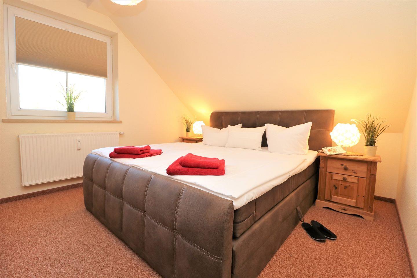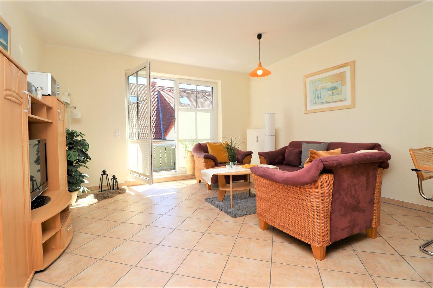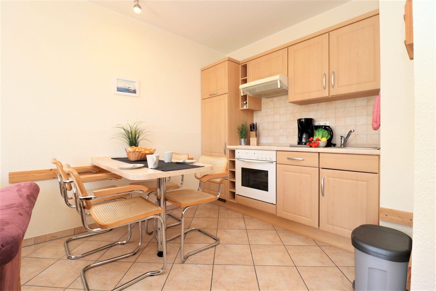 Dieses geräumige Appartement im Obergeschoss bietet auf ca. 60 m² Platz für bis zu 4 Personen und ist ideal für einen entspannenden Aufenthalt an der Ostsee. Das Wohnzimmer ist mit einer integrierten Küchenzeile ausgestattet, die es Ihnen ermöglicht, Mahlzeiten bequem selbst zuzubereiten. Der offene Bereich lädt zum Entspannen und Verweilen ein, während Sie die Zeit im Appartement genießen. Das Appartement verfügt über zwei Schlafzimmer: Eines ist mit einem gemütlichen Doppelbett ausgestattet, das andere mit Einzelbetten, die auch als Ehebett genutzt werden können, je nach Bedarf. Das Badezimmer ist mit einer Dusche und einem WC ausgestattet und bietet Ihnen alles, was Sie für Ihre Erholung benötigen. Genießen Sie den Ostbalkon, der Ihnen einen herrlichen Ausblick bietet, ideal für den morgendlichen Kaffee oder ein entspanntes Frühstück an der frischen Luft. Für Ihre Internetanbindung steht Ihnen kostenloses WLAN zur Verfügung, sodass Sie während Ihres Aufenthalts bequem online sein können. Das Appartement bietet Ihnen zudem einen abschließbaren Fahrradraum, in dem Sie Ihre Fahrräder sicher abstellen können, um sie vor Diebstahl oder Beschädigung zu schützen. Der PKW-Stellplatz Nr. 13 befindet sich direkt auf dem Grundstück und sorgt für eine bequeme Parkmöglichkeit während Ihres Aufenthalts. Haustiere sind in diesem Appartement leider nicht gestattet, und auch das Rauchen ist nicht erlaubt, um allen Gästen eine angenehme und gesunde Atmosphäre zu gewährleisten. Dieses Appartement bietet Ihnen den perfekten Rückzugsort, um die Ostsee zu genießen und sich nach einem erlebnisreichen Tag zu entspannen.