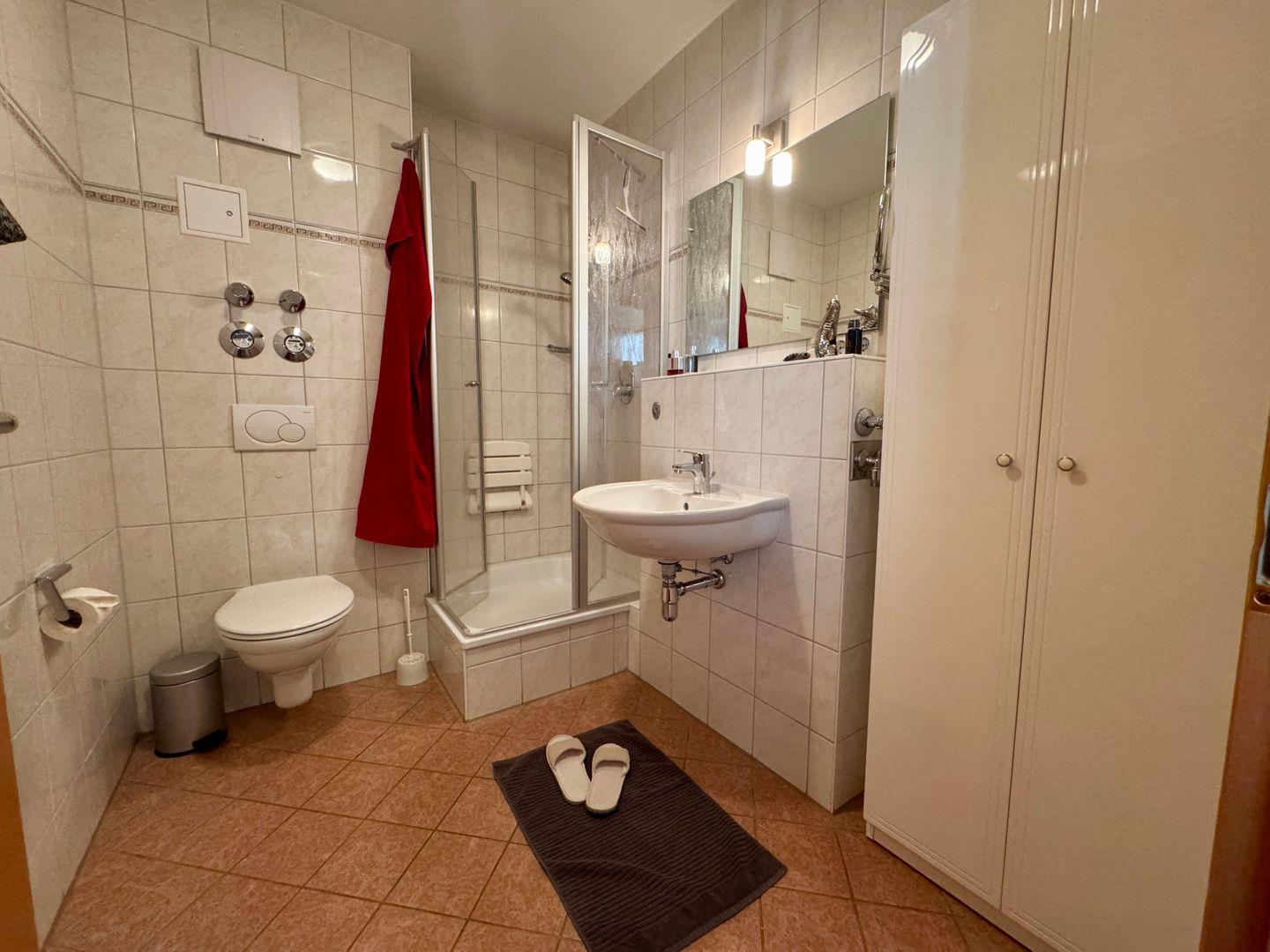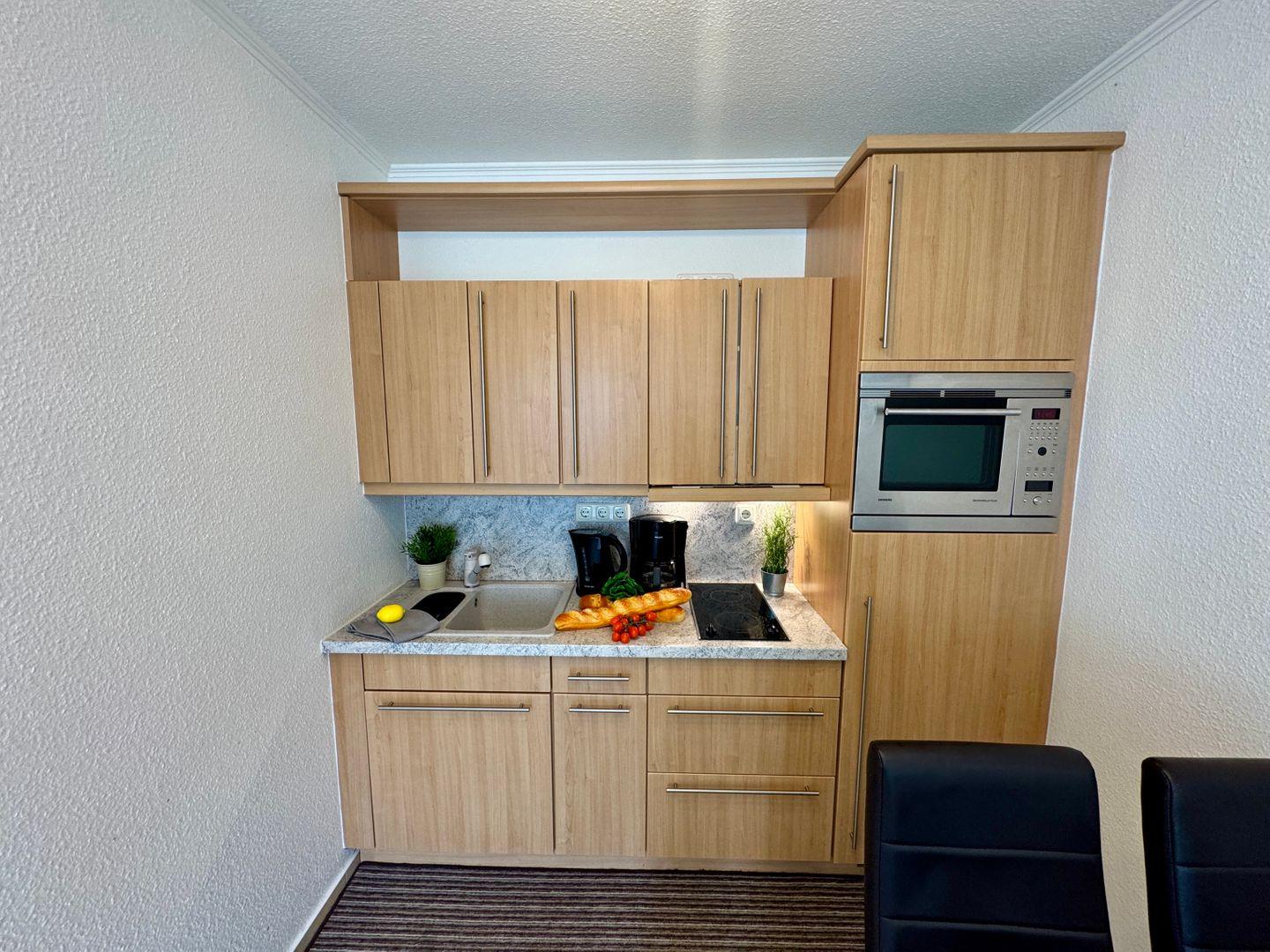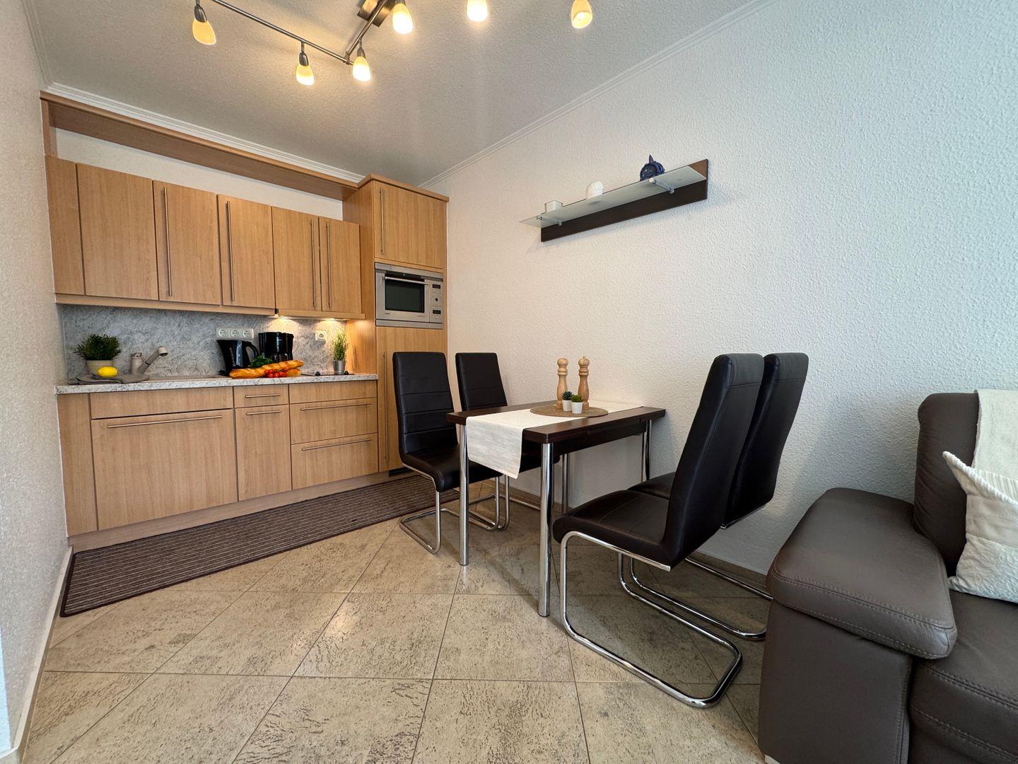 Dieses gemütliche Appartement im Obergeschoss bietet auf ca. 40 m² Platz für maximal 2 Personen und ist ideal für Paare oder Alleinreisende, die eine ruhige und entspannte Unterkunft suchen. Das Wohnzimmer verfügt über eine integrierte Küchenzeile, die mit allem ausgestattet ist, was Sie für eine einfache Zubereitung von Mahlzeiten benötigen. Ein Geschirrspüler ist jedoch nicht vorhanden, aber die Küche bietet dennoch ausreichend Platz für komfortables Kochen. Der offene Wohnbereich lädt zum Entspannen ein, während Sie auf der Couch die Umgebung genießen. Das Schlafzimmer ist mit einem gemütlichen Doppelbett ausgestattet, das für erholsamen Schlaf sorgt. Es bietet den idealen Rückzugsort nach einem Tag voller Aktivitäten oder Entspannung. Das Badezimmer ist mit einer Dusche und einem WC ausgestattet und bietet Ihnen alles, was Sie für Ihre tägliche Hygiene benötigen. Genießen Sie den Ostbalkon, auf dem Sie die Morgen- und Mittags sonne genießen können – der perfekte Ort für ein Frühstück im Freien oder eine kleine Auszeit. WLAN steht Ihnen kostenlos zur Verfügung, sodass Sie jederzeit einen bequemen Internetzugang haben – ideal, um auch während Ihres Urlaubs mit der Außenwelt verbunden zu bleiben. Der PKW-Stellplatz Nr. 15 befindet sich direkt auf dem Grundstück, sodass Sie bequem mit dem Auto anreisen können. Haustiere sind in diesem Appartement nicht gestattet, ebenso wie das Rauchen. So können Sie in einer angenehmen und frischen Umgebung entspannen. Dieses Appartement ist eine hervorragende Wahl für alle, die eine einfache, aber komfortable Unterkunft suchen, um die Umgebung zu erkunden oder einfach nur Ruhe und Erholung zu genießen.