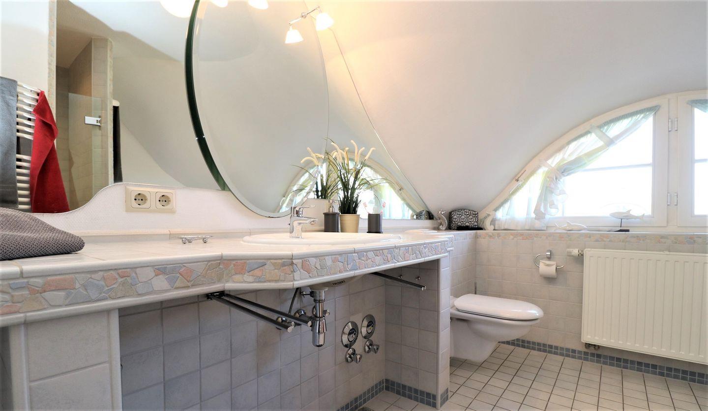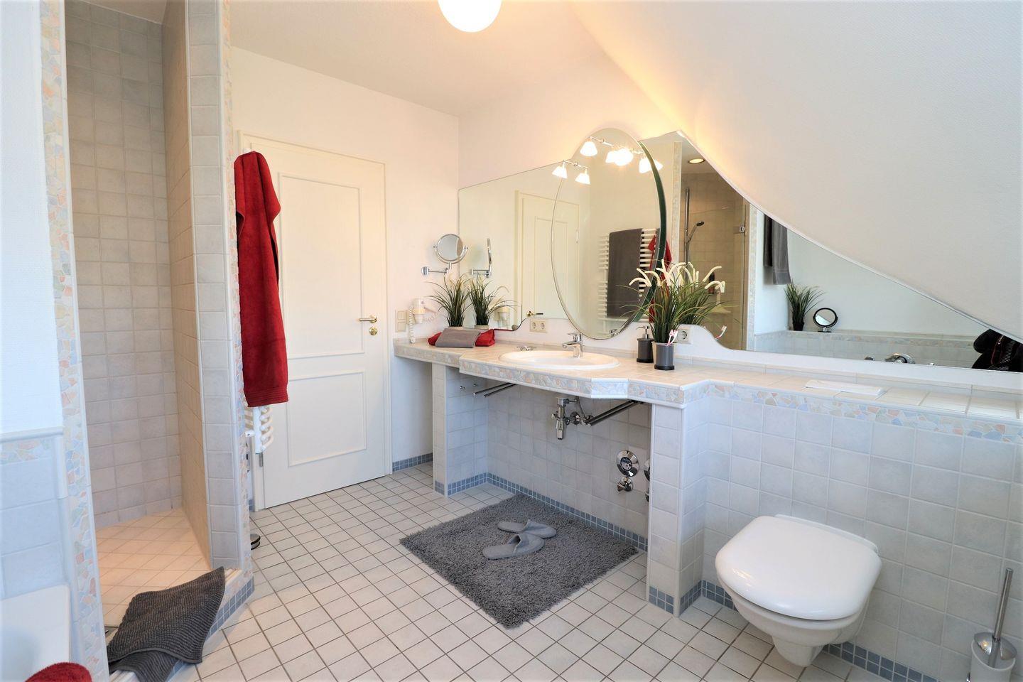 Das Schlafzimmer ist ein einladender Rückzugsort und lädt mit seinem bequemen Boxspringbett zu erholsamen Nächten ein. Ein zusätzliches Gäste-WC sowie ein Badezimmer mit bodengleich eingehender Dusche und Badewanne runden die Räumlichkeiten ab. Zudem stehen Ihnen eine Waschmaschine und ein Trockner zur Eigennutzung zur Verfügung, was besonders für längere Aufenthalte von Vorteil ist.