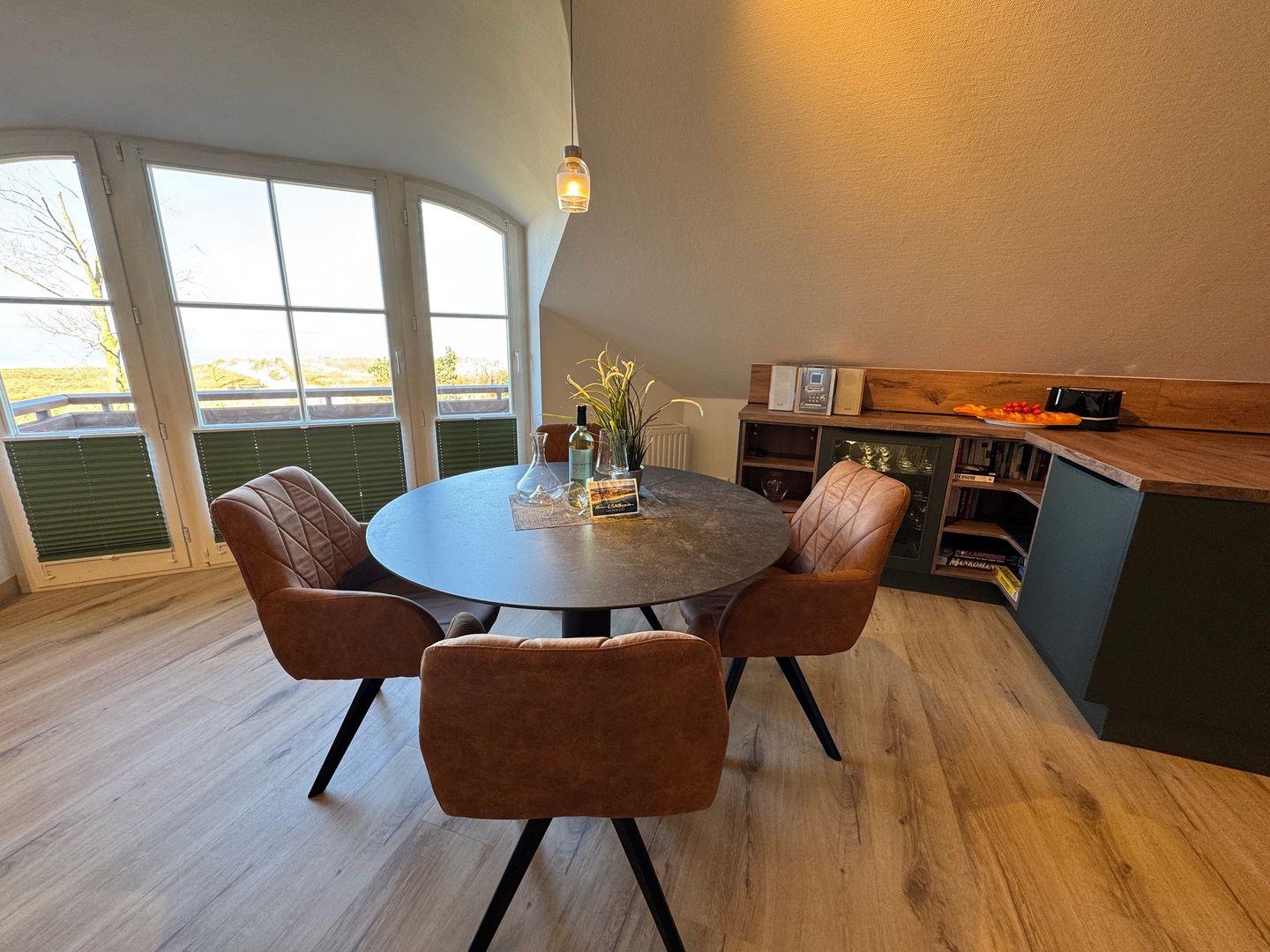 Die Wohnung erstreckt sich über 65 m² und befindet sich in der zweiten Etage des Hauses, von wo aus Sie einen herrlichen Blick auf das Meer genießen können. Der direkte Zugang zum Sandstrand ist nur 50 Meter entfernt, was diese Unterkunft besonders attraktiv für Strandliebhaber macht. Die hervorragend ausgestattete Ferienwohnung beinhaltet ein gemütliches Wohnzimmer, das mit einem bequemen Sofa und einem Sessel zum Entspannen einlädt. Hier finden Sie auch einen Fernseher mit digitalem Satellitenanschluss und einen DVD-Player. Für gesellige Abende steht Ihnen ein Essbereich zur Verfügung, der in die offene Küche übergeht. Diese ist mit modernen Geräten wie einem Herd, Backofen, Kühlschrank mit Gefrierfach, Spülmaschine und weiteren Küchenutensilien ausgestattet. Kaffeemaschine, Toaster und Wasserkocher sind ebenfalls vorhanden, um Ihnen den Aufenthalt so angenehm wie möglich zu gestalten.