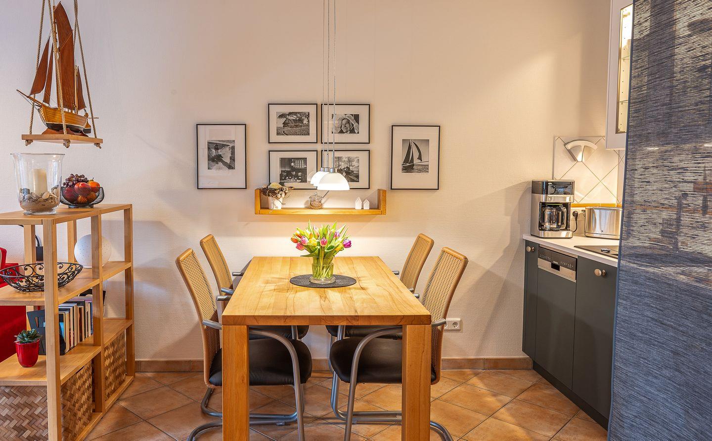 Im Wohnzimmer befinden sich bequeme Polstermöbel, u.a. ein komfortabler Fernsehsessel. Das Sofa kann mit nur wenigen Handgriffen in einen vollwertigen Schlafplatz umgewandelt werden. Ein Fernseher, Radio, Wlan usw. sind obligatorisch. Der Essplatz sowie die Einbauküche sind im Wohnbereich integriert. In der neuen Küche fehlt es an nichts. Es ist alles vorhanden, was eine Küche bieten muss. Küche, Essplatz und Wohnzimmer bilden eine harmonische, sehr wohnliche Einheit.