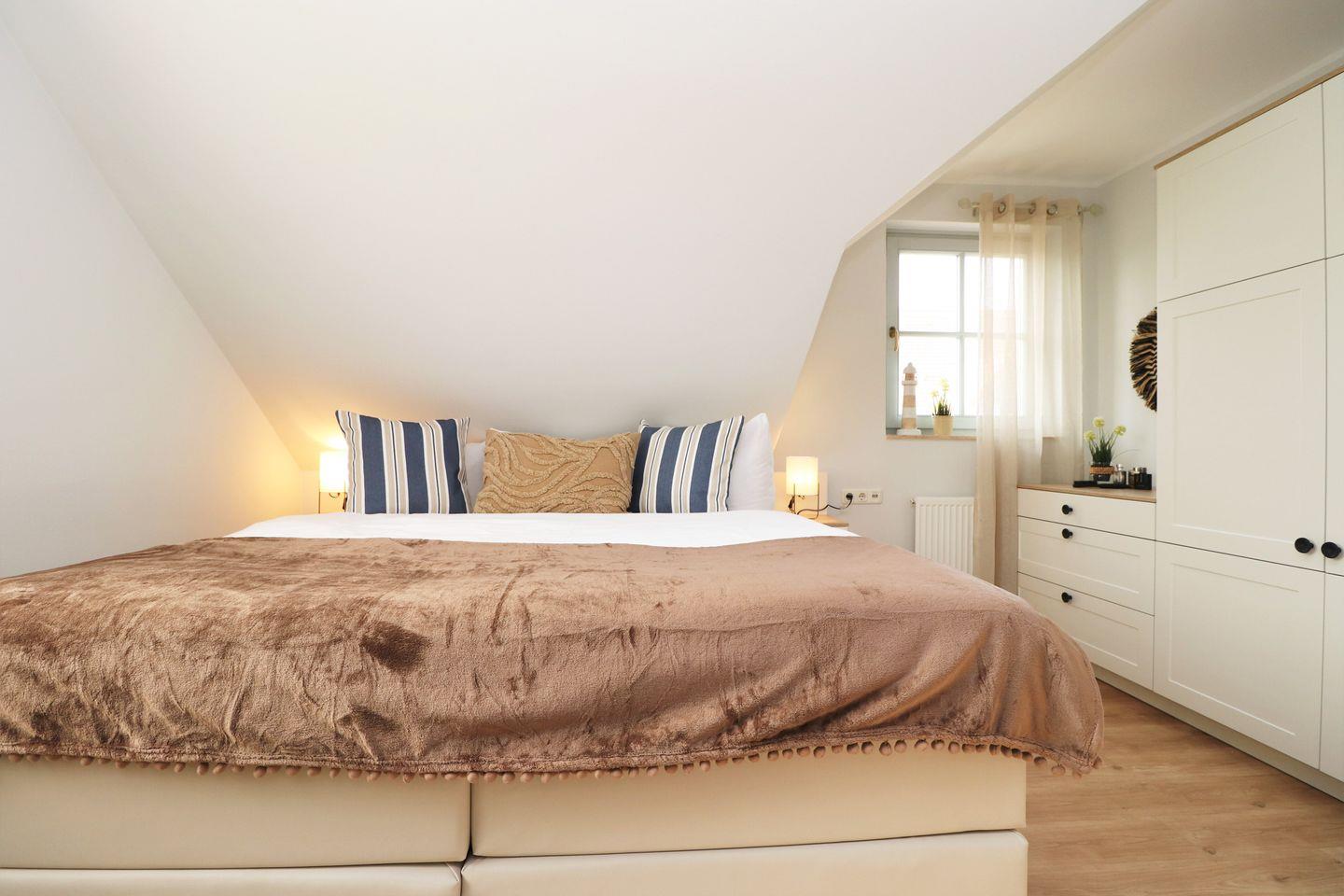 Das Schlafzimmer ist ein ruhiger Rückzugsort mit einem komfortablen Bett, das erholsame Nächte verspricht. Im modernen Badezimmer finden Sie eine bodengleiche Dusche, die nicht nur Praktikabilität bietet, sondern auch für ein hochwertiges Ambiente sorgt.