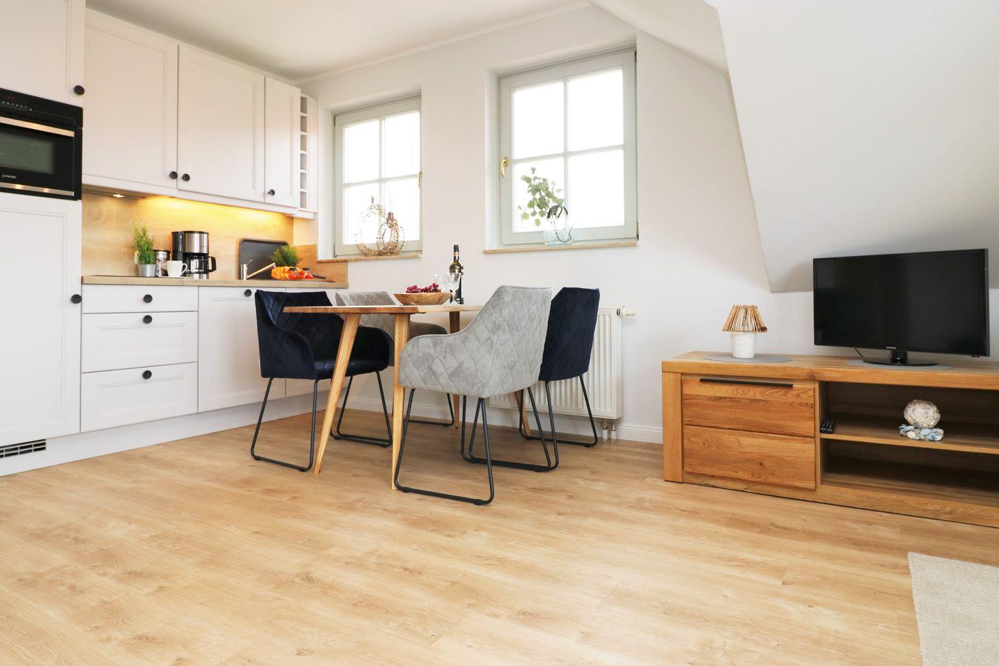 Mit einer Wohnfläche von 48 m² befindet sich die Ferienwohnung im ersten Stock und wurde 2022 vollständig renoviert. Der zur Ostsee ausgerichtete Balkon lädt dazu ein, die frische Seeluft zu genießen. Die großzügig gestalteten Räume sind mit einem Vinyleboden ausgestattet und sorgen für eine einladende Wohlfühlatmosphäre. Das offene Konzept der Wohnung vereint eine gut ausgestattete Küche mit einem hellen und freundlichen Wohnzimmer, in dem Sie nach einem Tag am Strand entspannen können.