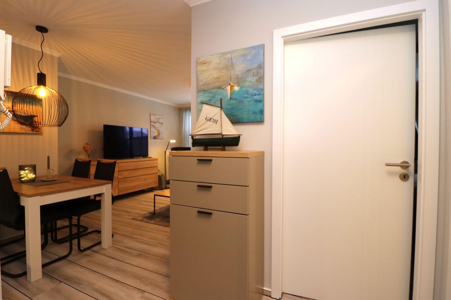 Ein charmantes, in 2024 komplett neu renoviertes Erdgeschoss-Appartement für bis zu 4 Personen mit einer Terrasse nach Süden ausgerichtet. Das Appartement verfügt über ein Wohnzimmer mit Schlafcouch und integrierter Küchenzeile und ein Schlafzimmer mit einem hochwertigen Boxspringbett, für erholsamen Schlaf. Das Badezimmer ist mit einer Dusche und WC ausgestattet. Haustiere und das Rauchen sind in diesem Appartement nicht gestattet. WLAN ist verfügbar, um Ihren Aufenthalt zu vervollständigen. Im Gemeinschaftsraum in der Tiefgarage stehen Waschmaschine und Trockner gegen Gebühr zur Verfügung. Ideal für einen entspannten Aufenthalt! Diesem Appartement ist der Tiefgaragenstellplatz Nr. 41 zugeordnet.