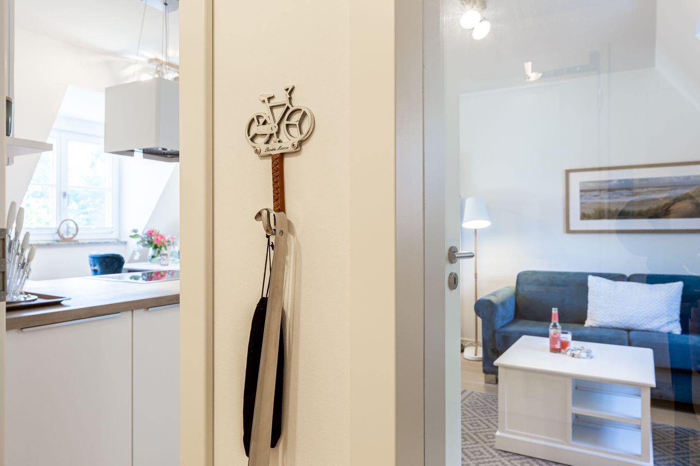 Im Außenbereich steht eine kleine Terrasse mit Strandkorb zur Verfügung. Außerdem gehört der PKW-Stellplatz Nr. 20 in der Tiefgarage zur Ferienwohnung.