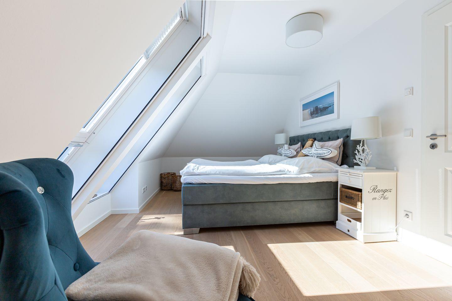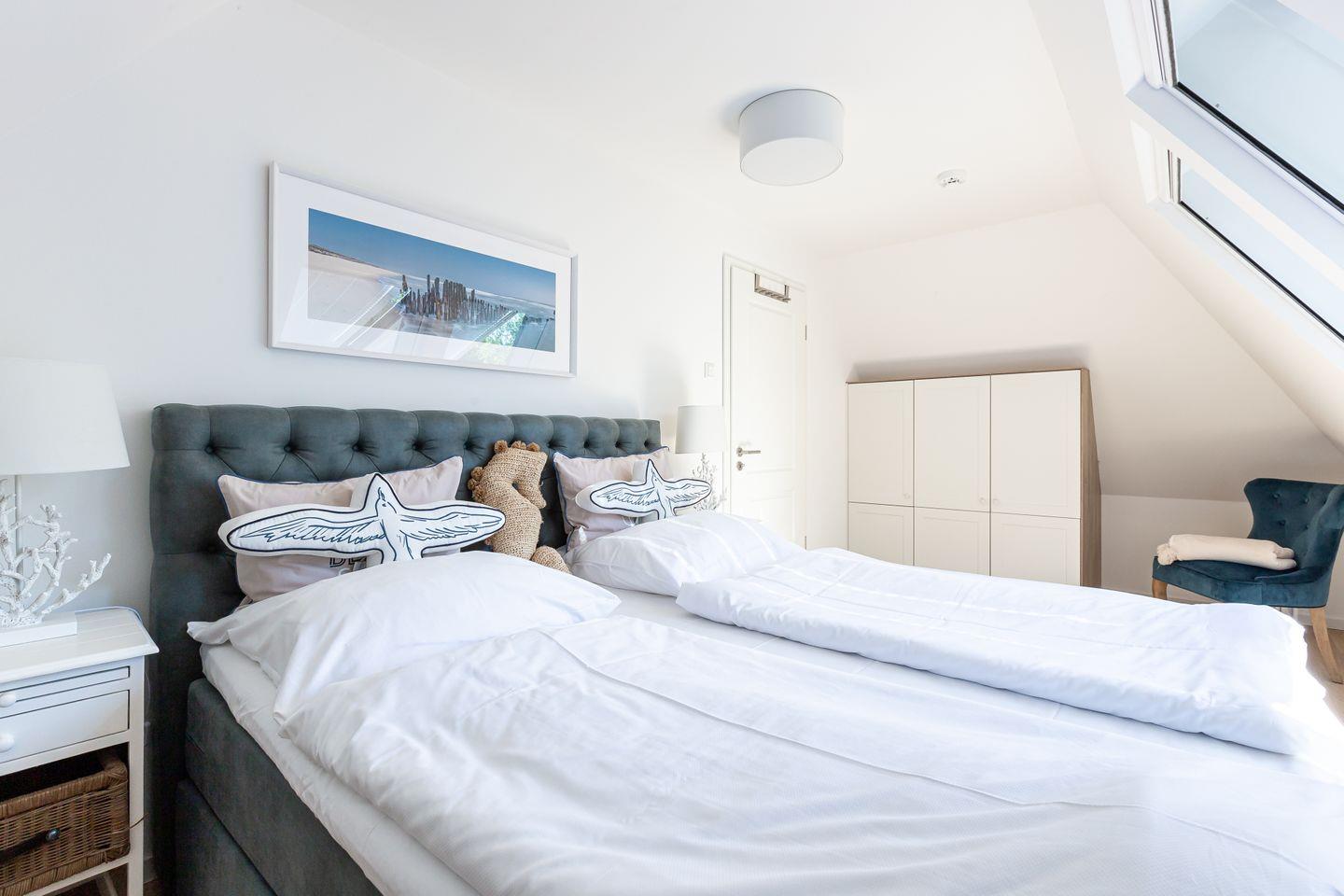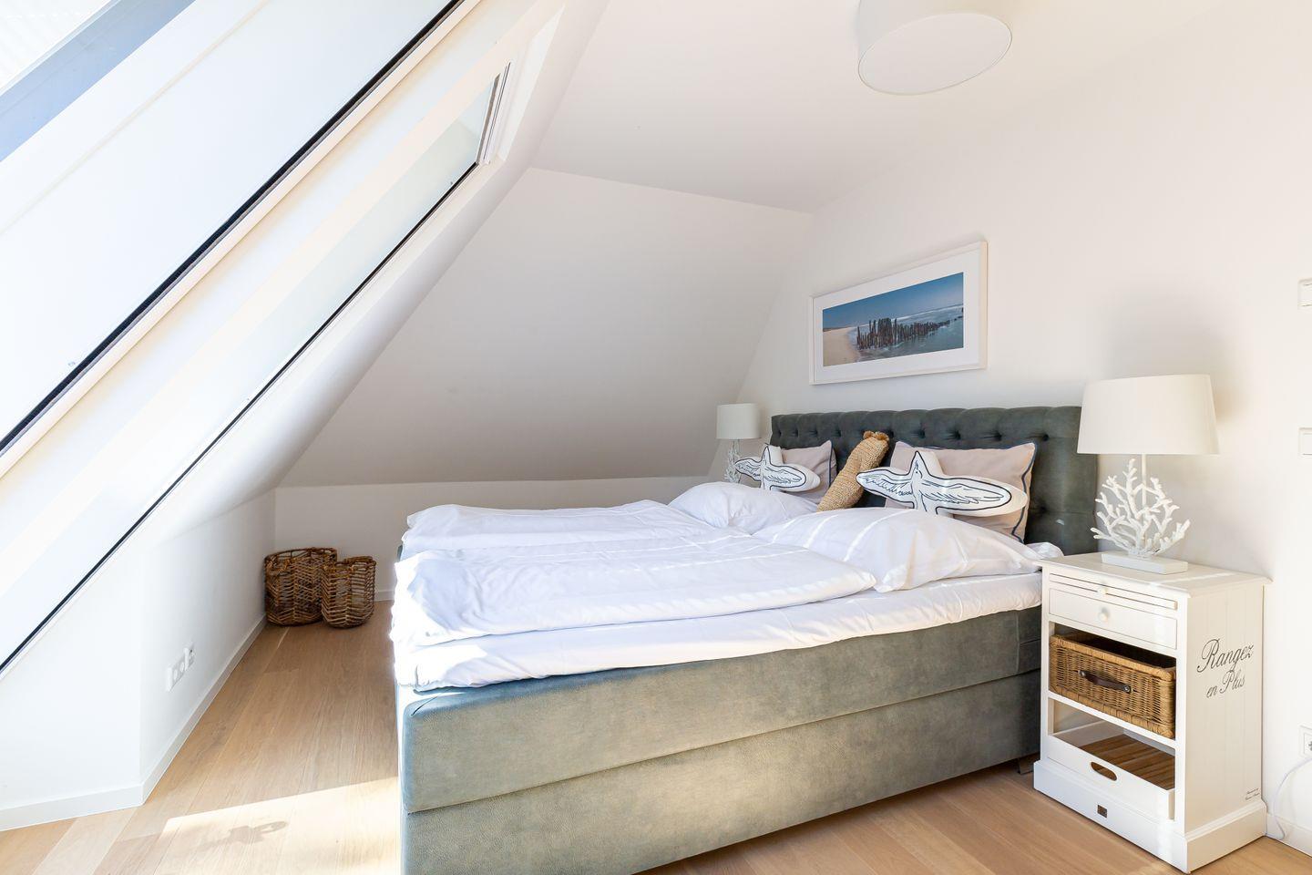Parkliebe 7 befindet sich im zweiten Obergeschoss des Apartmenthauses und ist über eine Treppe zu erreichen. Der Seaside-Stil passt perfekt zu der strandnahen Umgebung und findet sich als Einrichtungsstil in der gesamten Wohnung wieder. Herzstück der Ferienunterkunft ist der Wohn- und Küchenbereich. Auf der einen Seite lässt es sich mit Sofa, Sessel und TV gemütlich machen. Auf der anderen Seite befindet sich die vollausgestattete Küchenzeile mit Esstisch am Fenster. Hier lässt es sich nach Herzenslust kochen, klönen und entspannen. Ebenso liebevoll wie der Wohnraum ist auch das Schlafzimmer eingerichtet. Das hochwertige Boxspringbett und die großen Dachfenster mit Blick ins Grüne schaffen eine heimelige Atmosphäre und den perfekten Rückzugsort. Abgerundet wird der Wohnkomfort mit einem Tageslichtbad, bodengleicher Dusche und Fön.