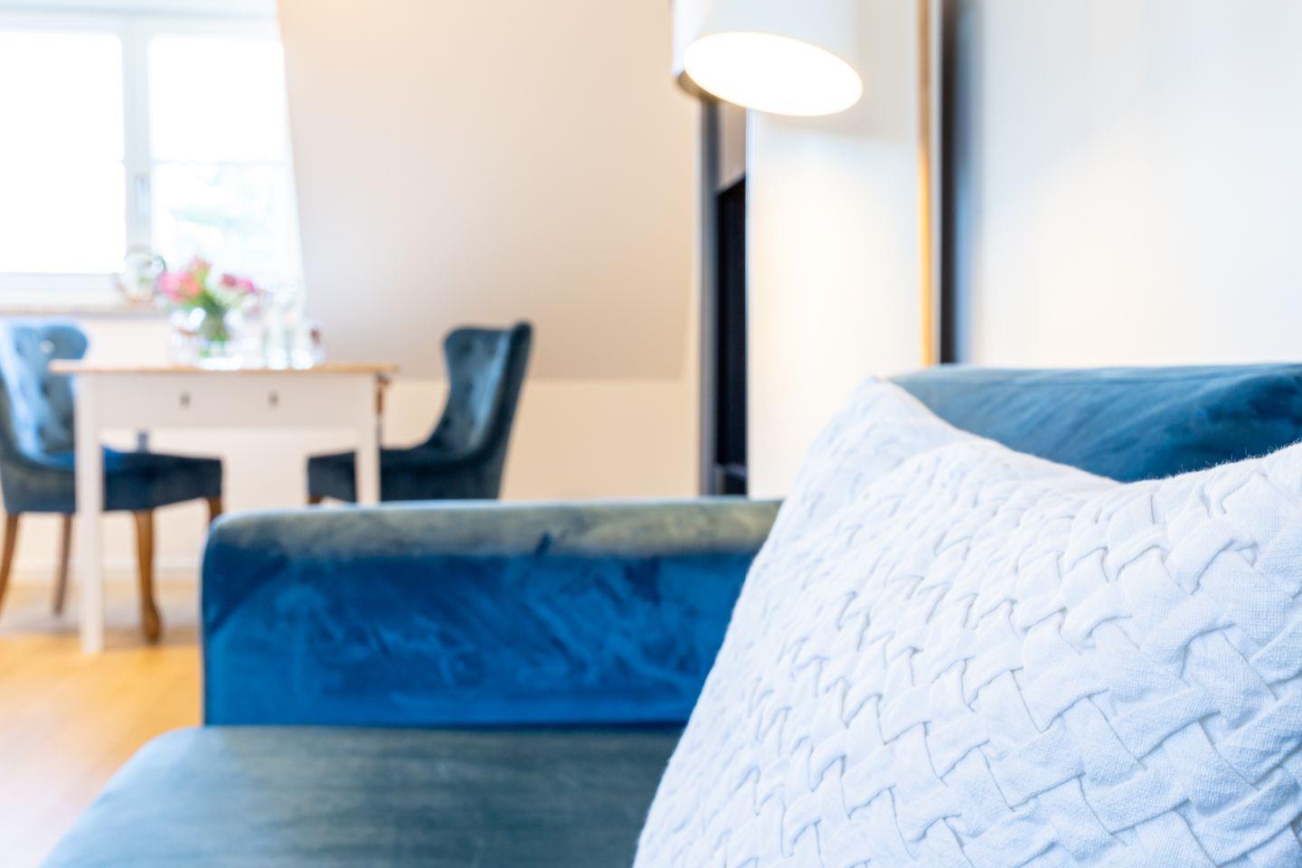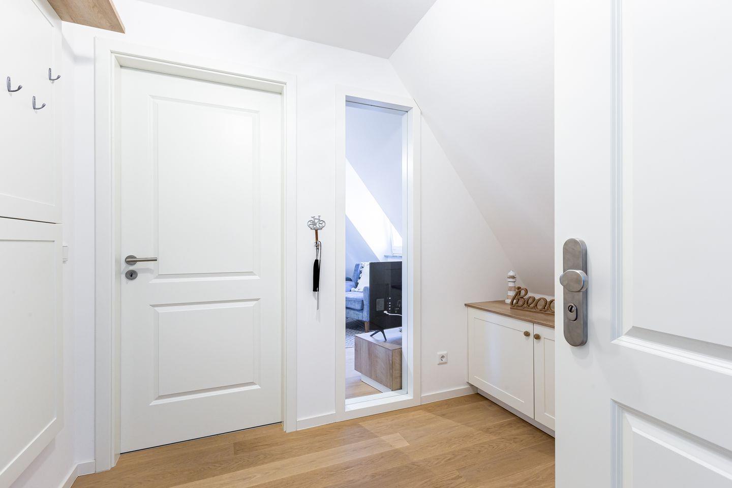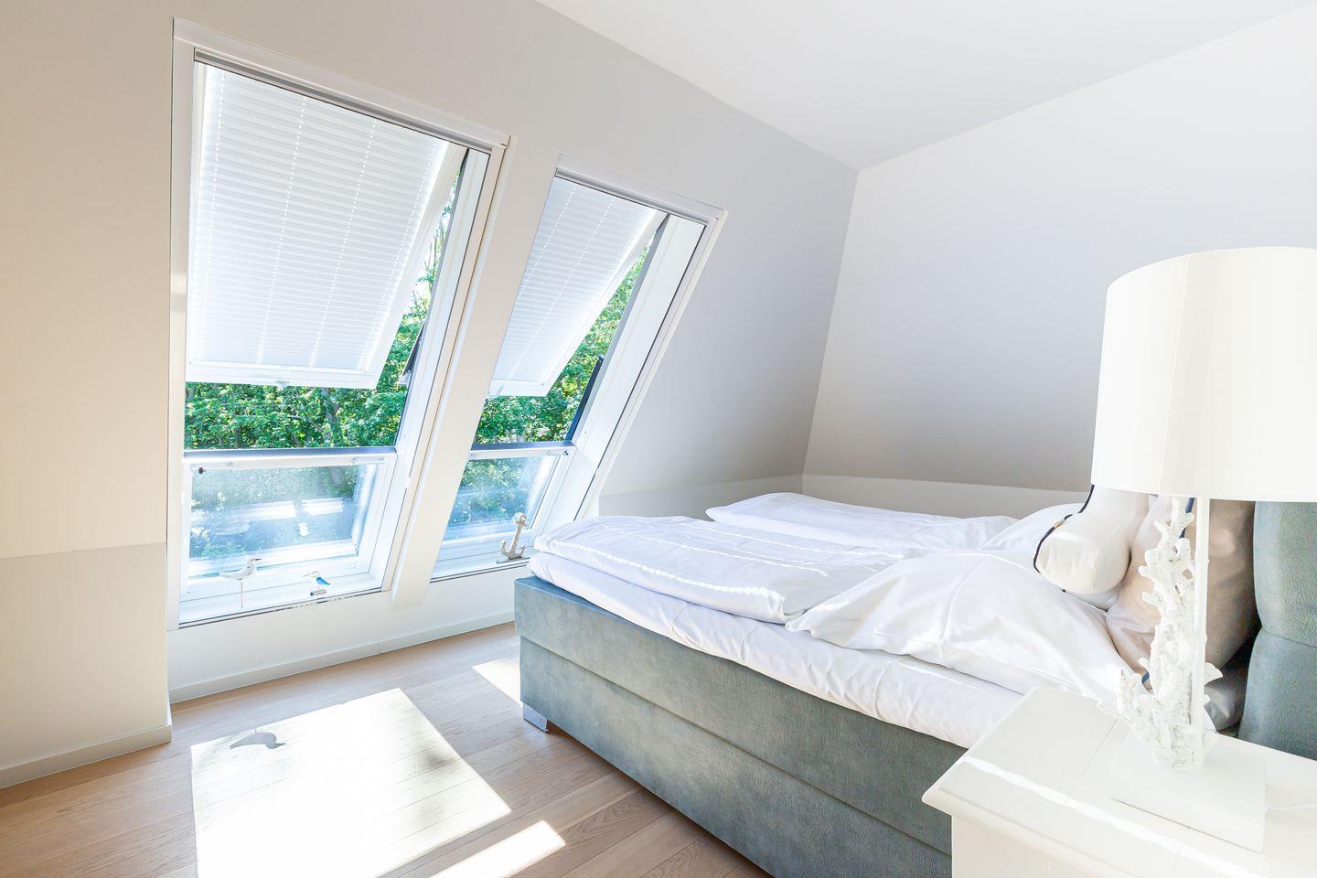 Parkliebe 7 befindet sich im zweiten Obergeschoss des Apartmenthauses und ist über eine Treppe zu erreichen. Der Seaside-Stil passt perfekt zu der strandnahen Umgebung und findet sich als Einrichtungsstil in der gesamten Wohnung wieder. Herzstück der Ferienunterkunft ist der Wohn- und Küchenbereich. Auf der einen Seite lässt es sich mit Sofa, Sessel und TV gemütlich machen. Auf der anderen Seite befindet sich die vollausgestattete Küchenzeile mit Esstisch am Fenster. Hier lässt es sich nach Herzenslust kochen, klönen und entspannen. Ebenso liebevoll wie der Wohnraum ist auch das Schlafzimmer eingerichtet. Das hochwertige Boxspringbett und die großen Dachfenster mit Blick ins Grüne schaffen eine heimelige Atmosphäre und den perfekten Rückzugsort. Abgerundet wird der Wohnkomfort mit einem Tageslichtbad, bodengleicher Dusche und Fön.