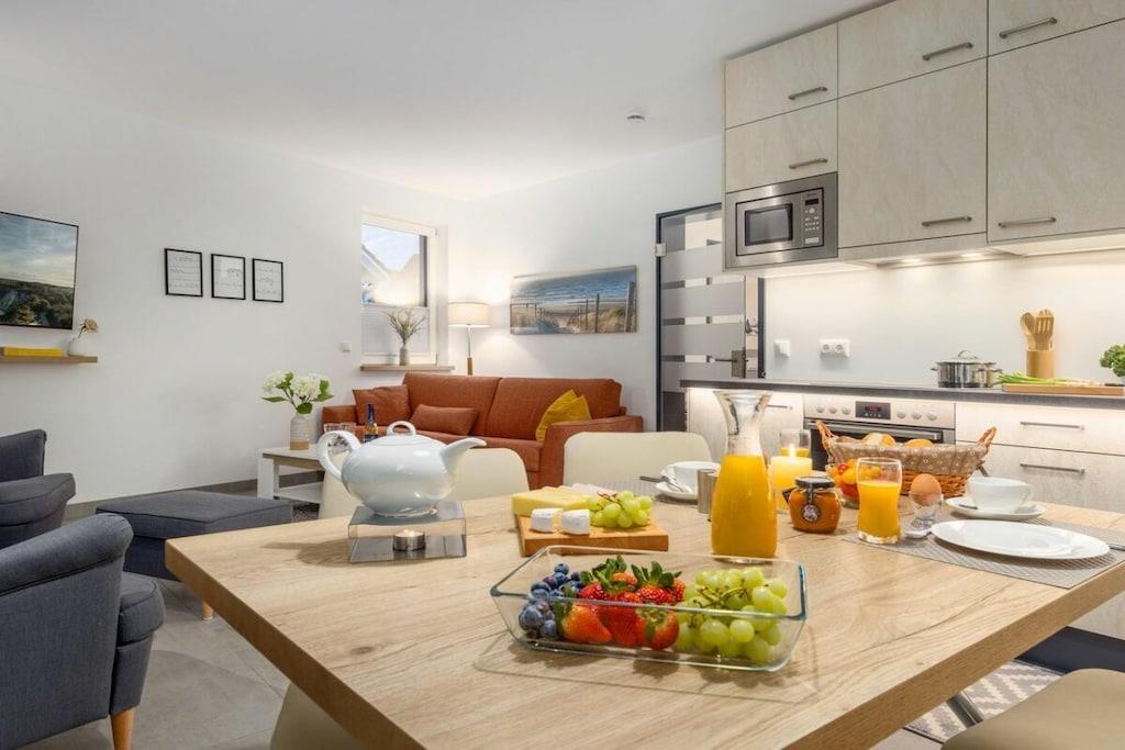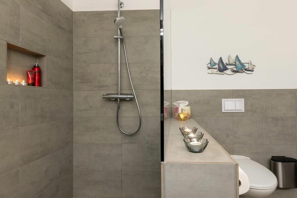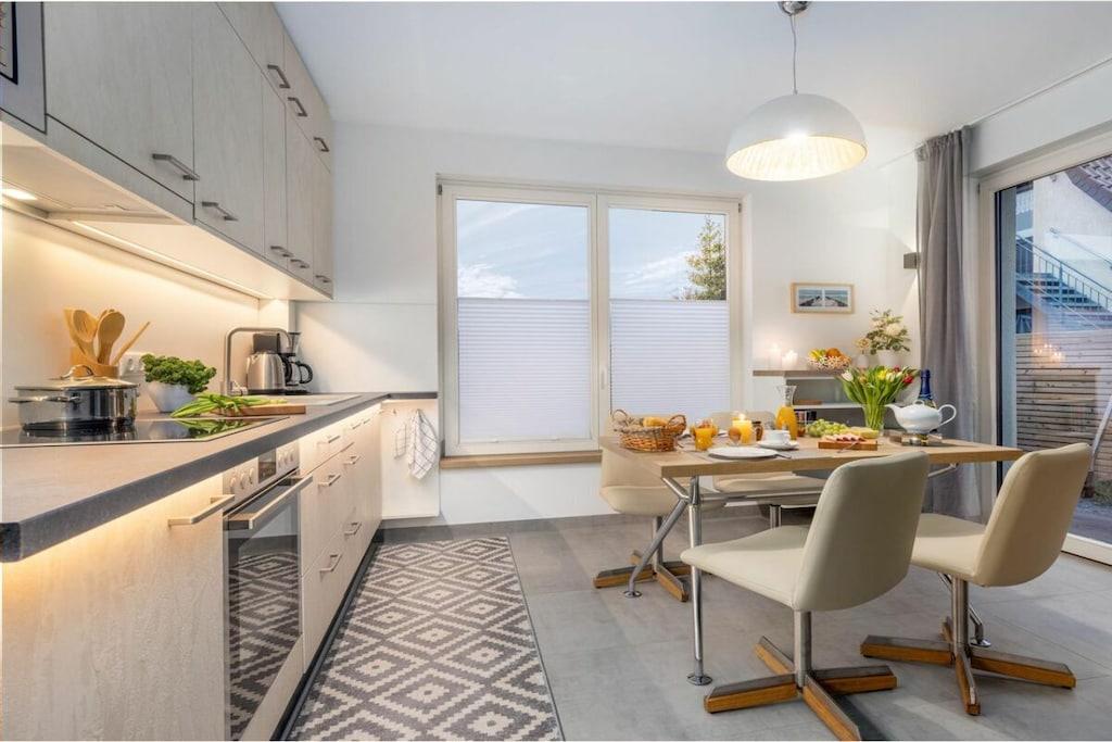 , , Stue(, enkeltsovesofa, Fjernsyn), Køkken(, spisebord, kogeplade, elkedel, brødrister, kaffemaskine, ovn, mikrobølgeovn, opvaskemaskine , køleskab, fryser), soveværelse(dobbeltseng), badeværelse(, bruser, håndvask, føntørrer), Internetadgang, Internetadgang, tørretumbler, vaskemaskine, varme, terrasse(havemøbler), havemøbler, parkering, strygebræt, strygejern, tørreskab