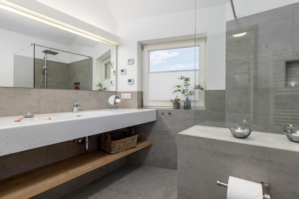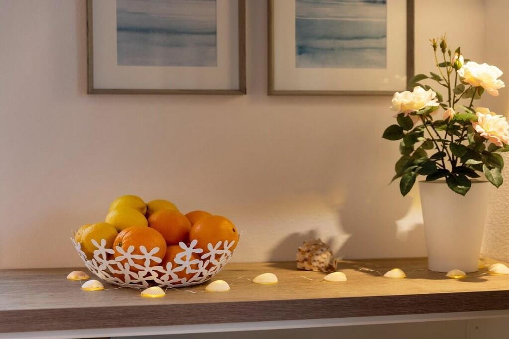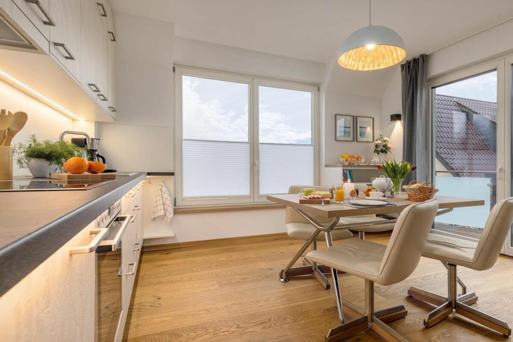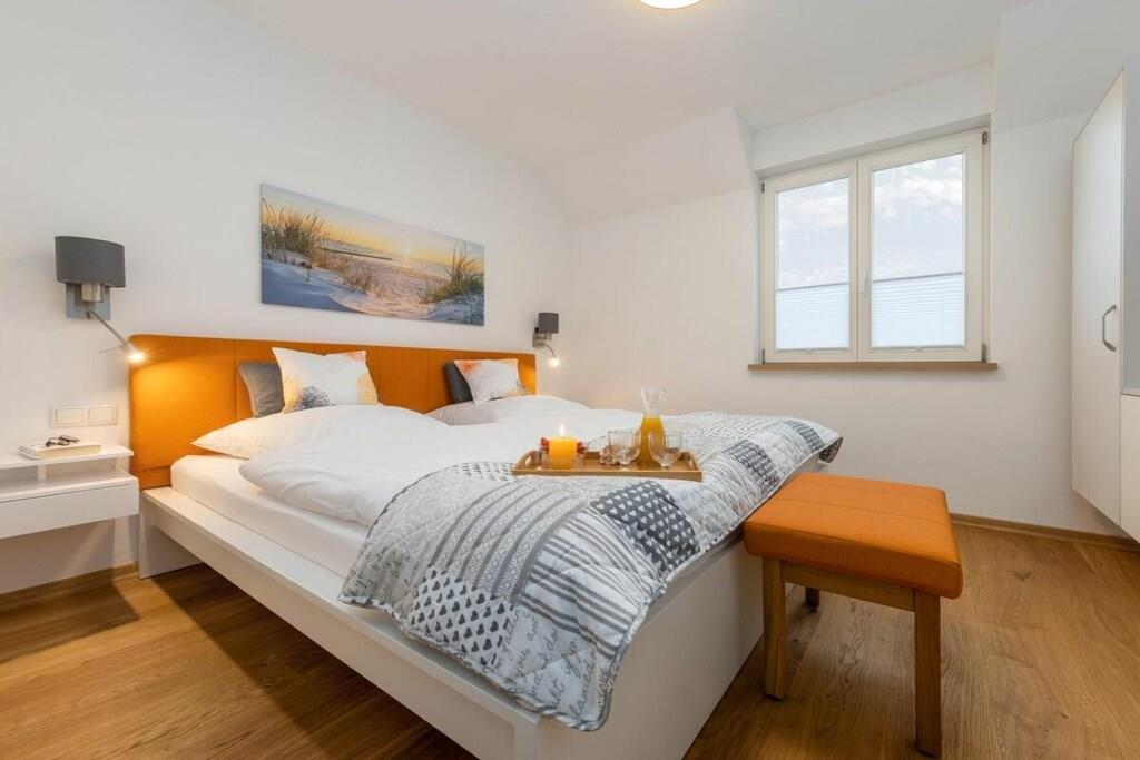 Ny, moderne og smagfuldt møbleret lejlighed på første sal. Store balkondøre fra gulv til loft bringer masser af lys ind i stuen med egetræsparketgulv. En sovesofa med en ekstra seng (160x200 cm) egnet til to personer, et fuldt udstyret køkken, en pejs til kolde dage og havemøbler på balkonen, to LCD-tv'er, et soveværelse med en dobbeltseng og et badeværelse med god opbevaringsplads. Bryggerset indeholder en møntvaskemaskine og tørretumbler. Der er cykelopbevaring.