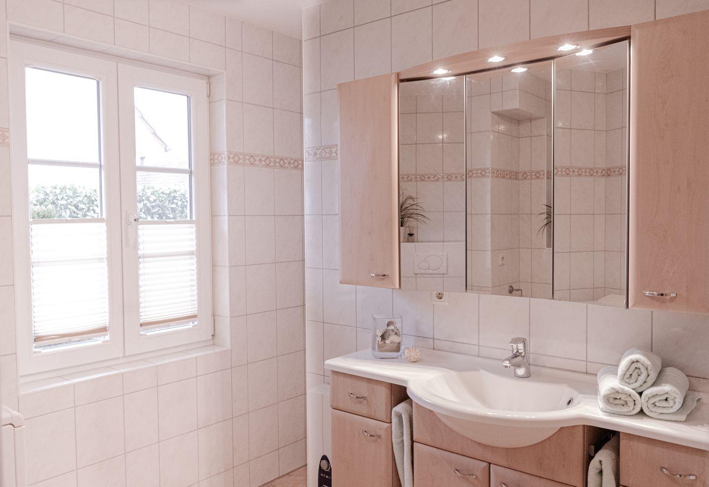 Das Badezimmer verfügt über eine ebenerdige Dusche, die Waschmaschine ist ebenfalls hier zu finden.