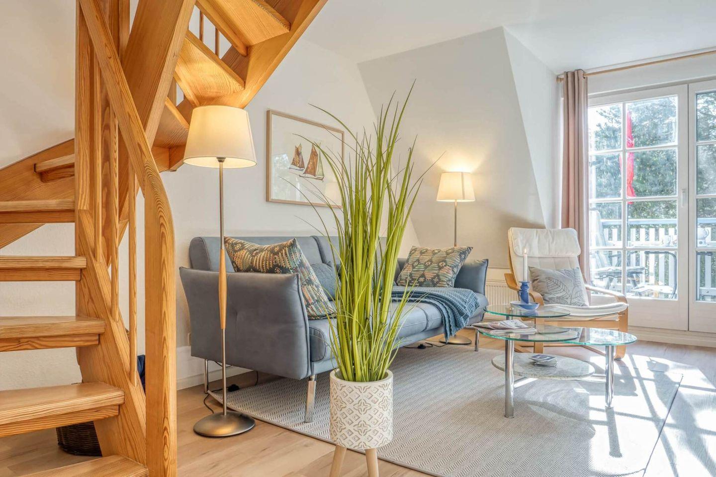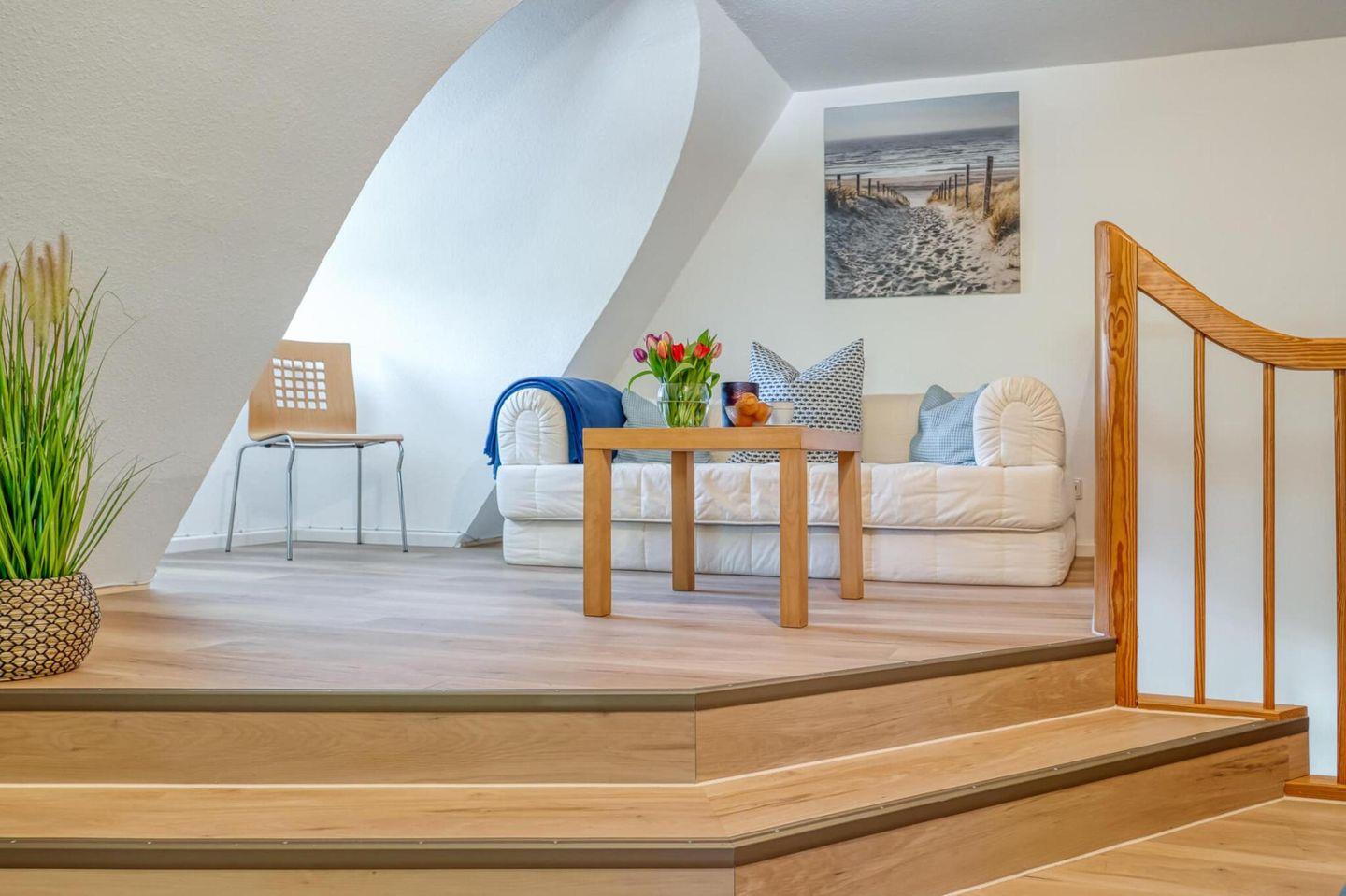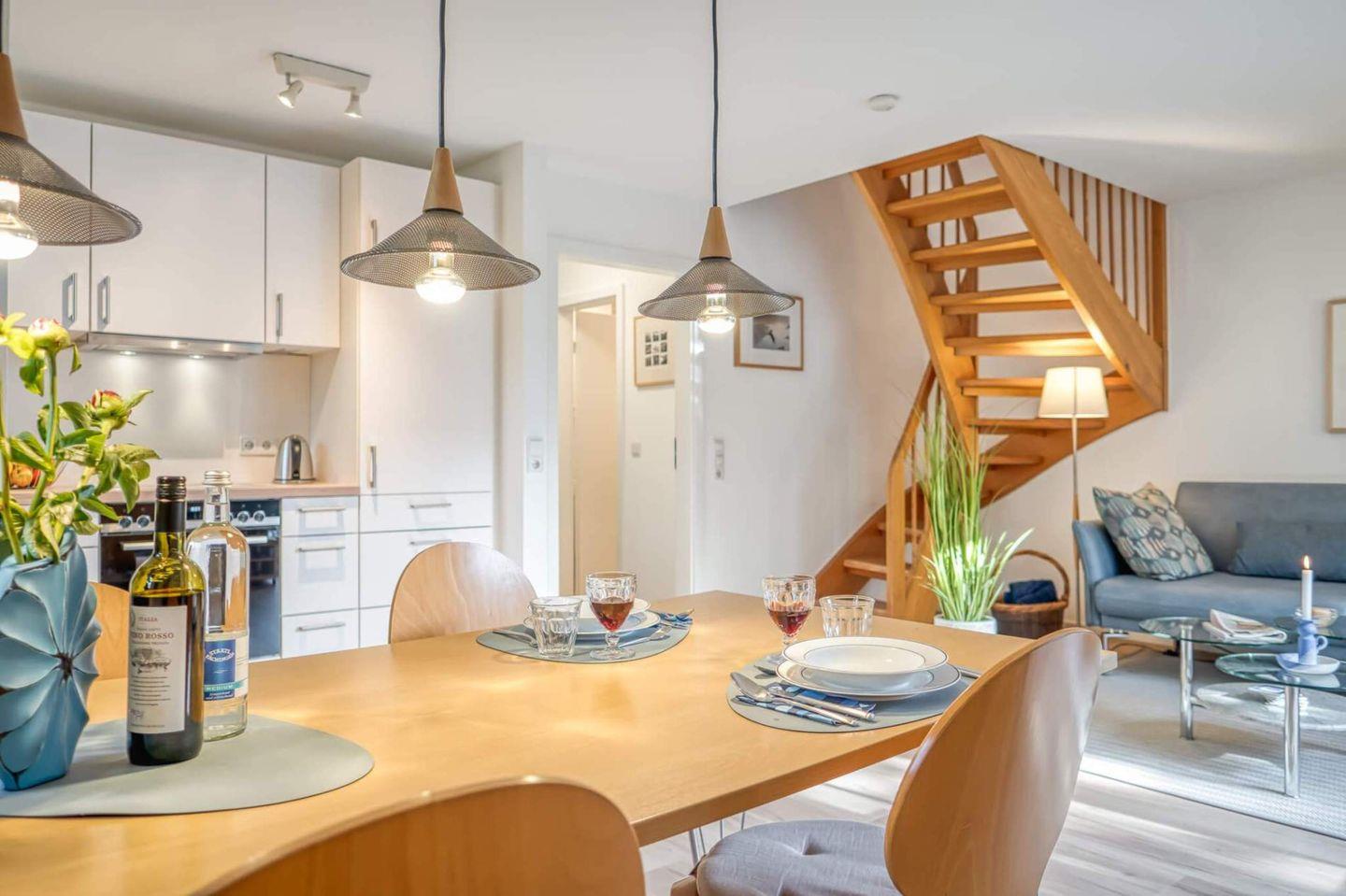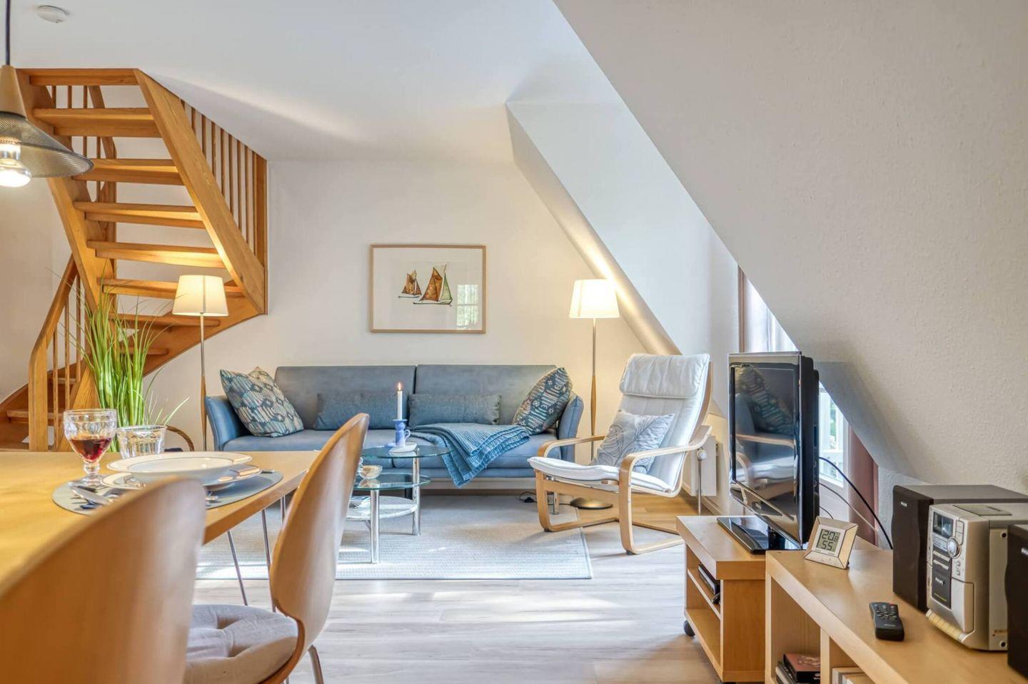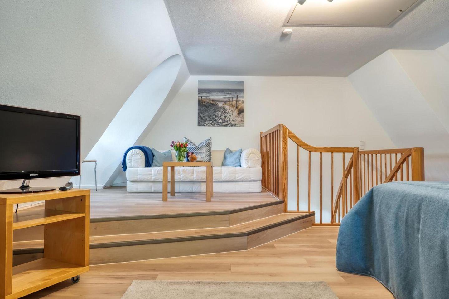 Die gut ausgestattete Wohnung mit Wohn-Essbereich empfängt Sie mit einer wohnlichen und gemütlichen Atmosphäre. Die integrierte Küche ist hell und freundlich. Zur Wohnung gehören die große Westterrasse, ein Bad mit Dusche, WC und Waschmaschine. Im Schlafzimmer im Obergeschoss steht ein Ehebett und ein zweites Fernsehgerät. Zur Wohnung gehört ebenfalls ein eigener PKW-Stellplatz.