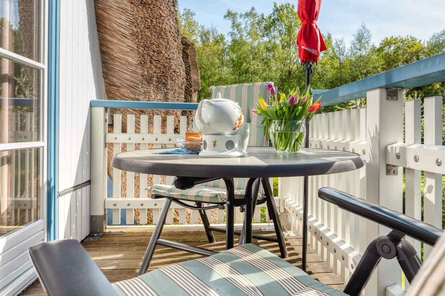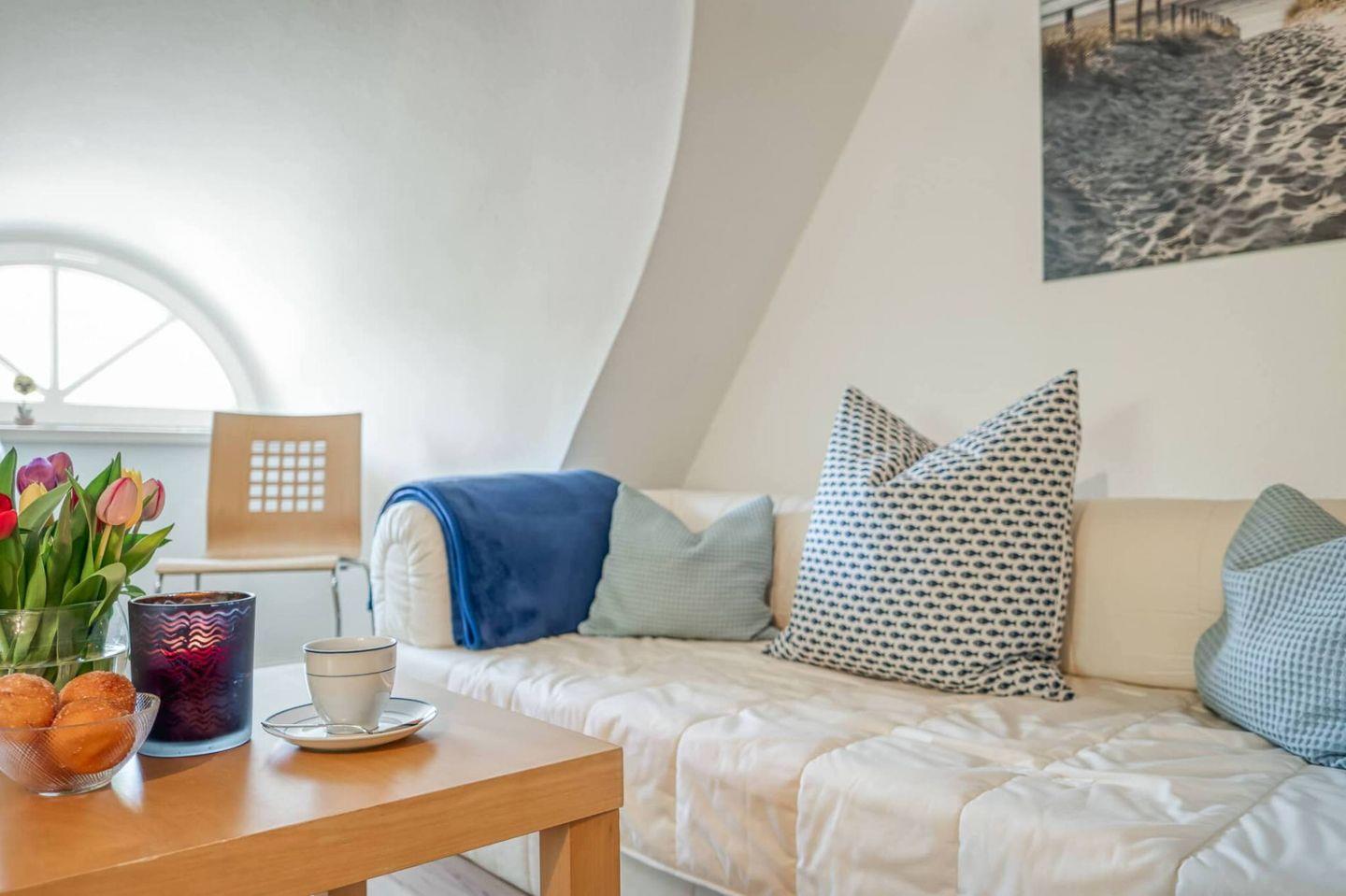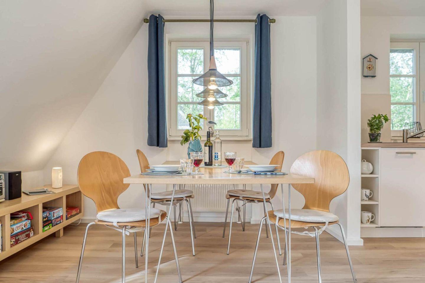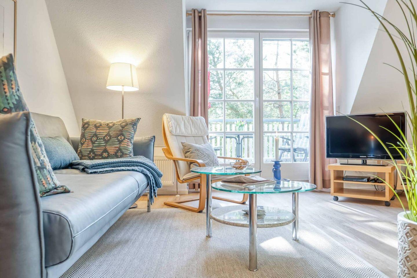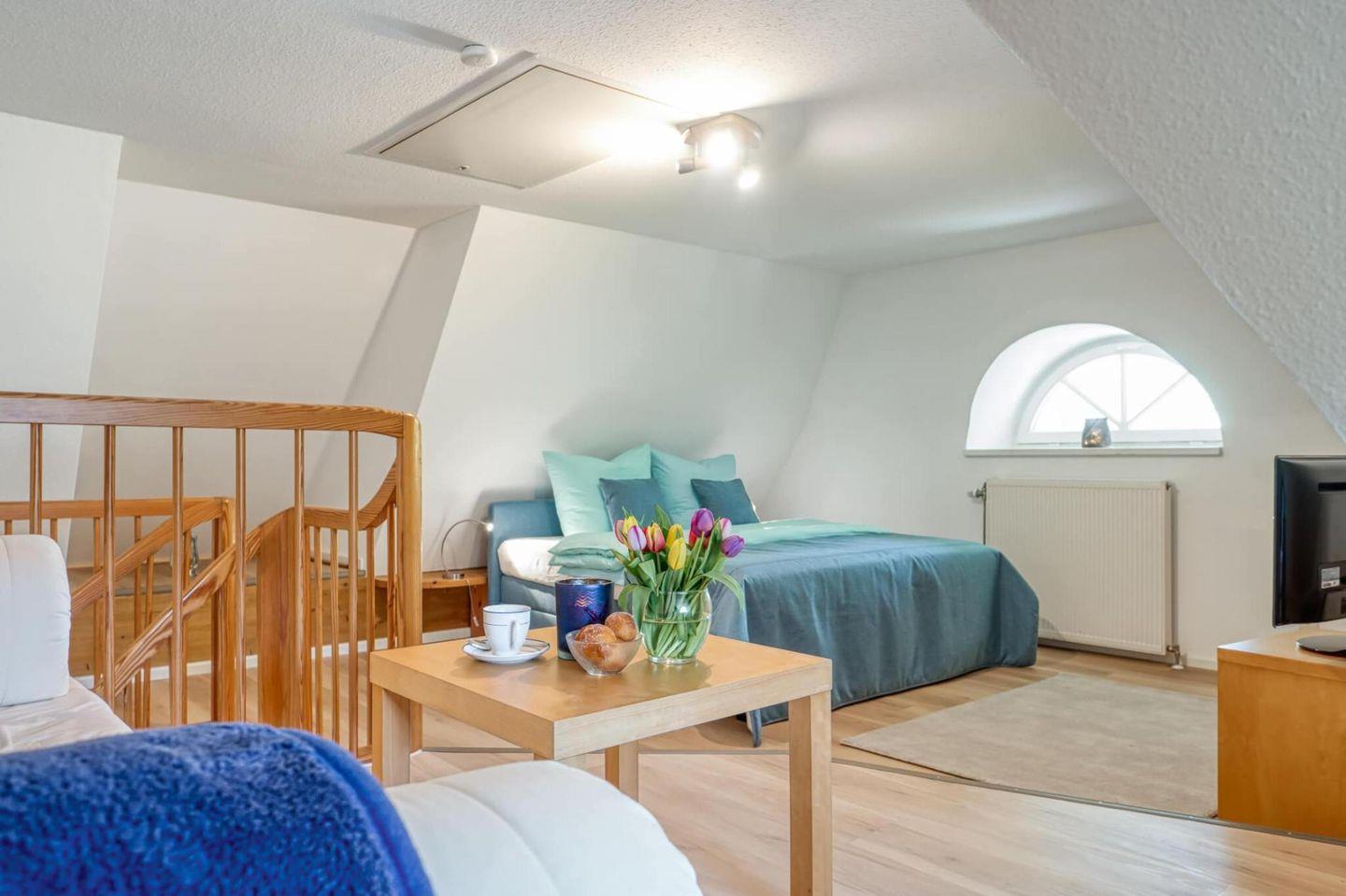 Die gut ausgestattete Wohnung mit Wohn-Essbereich empfängt Sie mit einer wohnlichen und gemütlichen Atmosphäre. Die integrierte Küche ist hell und freundlich. Zur Wohnung gehören die große Westterrasse, ein Bad mit Dusche, WC und Waschmaschine. Im Schlafzimmer im Obergeschoss steht ein Ehebett und ein zweites Fernsehgerät. Zur Wohnung gehört ebenfalls ein eigener PKW-Stellplatz.
