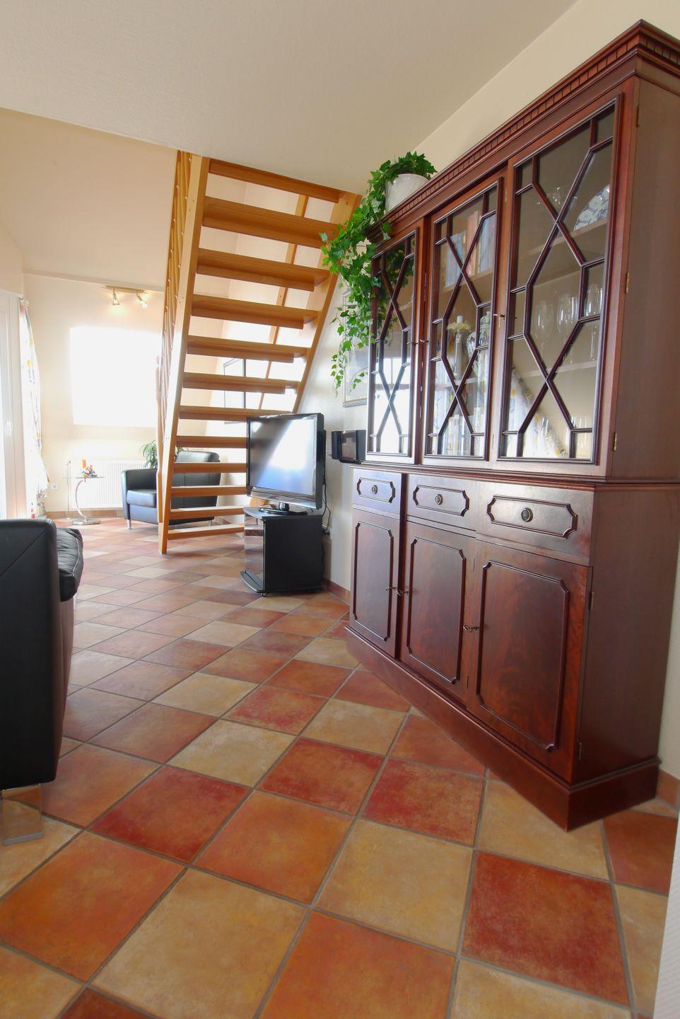 Die 97qm große Eckwohnung befindet sich im 2.OG und wird für max 4 Personen vermietet. Auf einer Ebene befinden sich Küche, das Bad mit begehbarer Dusche und WC, 1 Schlafzimmer mit Doppelbett und Zugang zum Ostbalkon sowie der grosse Wohnraum mit einem Süd-Ostbalkon. Auf der oberen Ebene befindet sich ein grosses Wohnschlafzimmer mit 2 Einzelbetten, ein Bad mit begehbarer Dusche und WC, einem 2.TV-Gerät und ein Balkon zur Westseite. Ein Tiefgaragenplatz gehört zur Wohnung dazu. Münzwaschmaschinen finden Sie im Keller des Hauses.